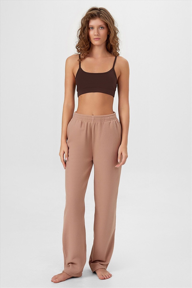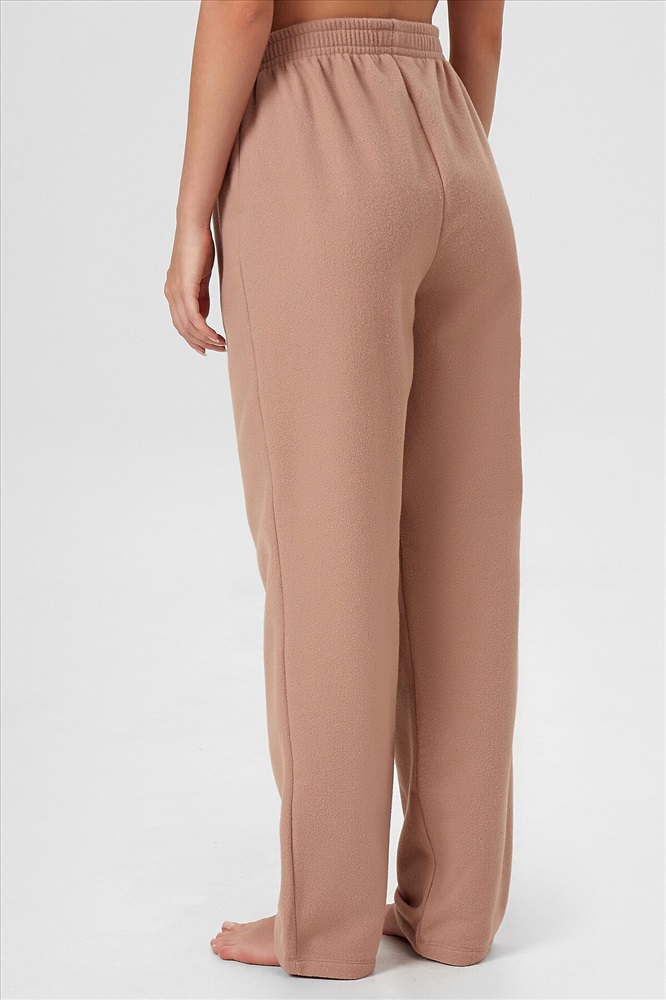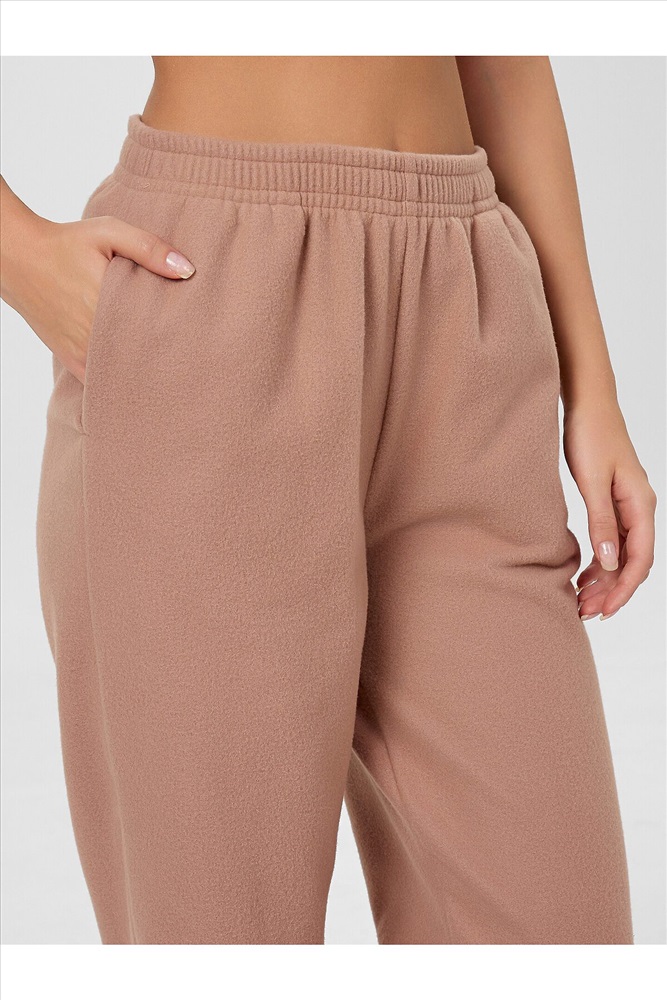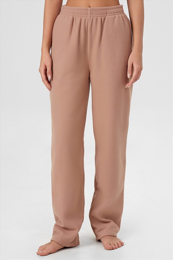 Брюки женские, прямого силуэта из трикотажного полотна флис. Посадка брюк средняя. Пояс цельнокроеный с эластичной тесьмой внутри. Низ брюк обработан в подгибку.