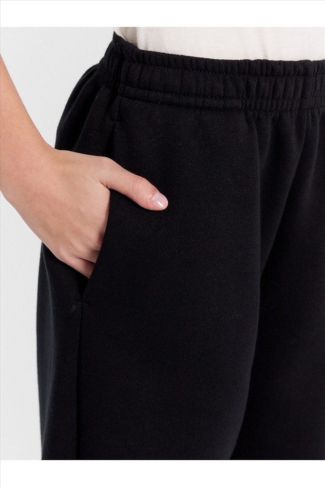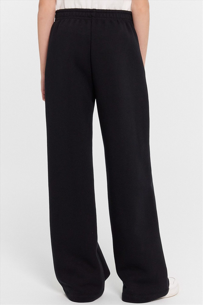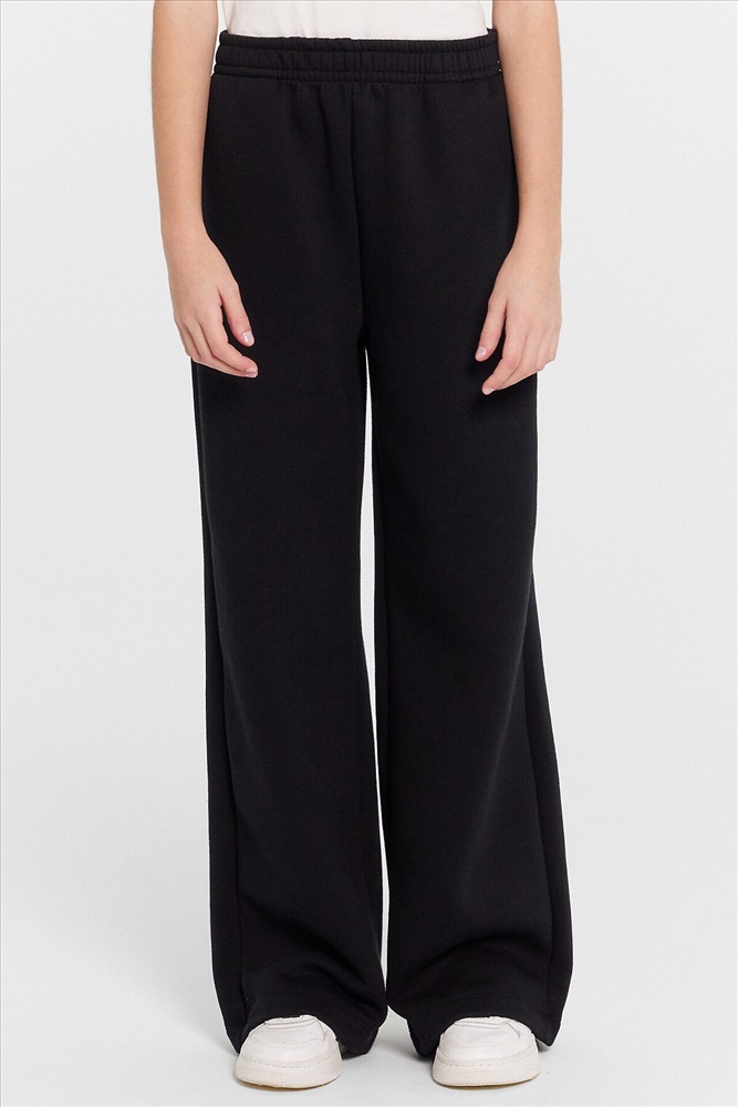 Брюки для девочек, прямого силуэта. Пояс цельнокроеный с втачной эластичной тесьмой RV40. Пояс прострочен двумя отделочными строчками. По переду обработаны карманы в швах. Низ брюк обработан швом в подгибку на двухигольной плоскошовной машине.