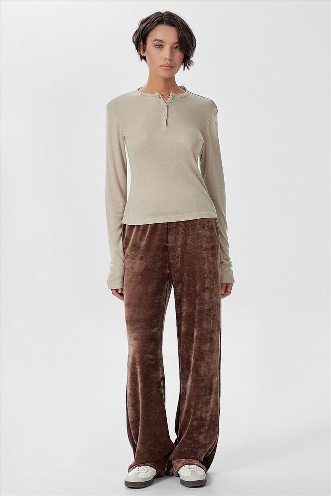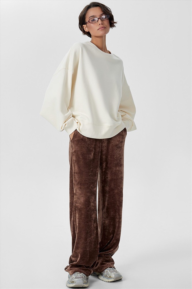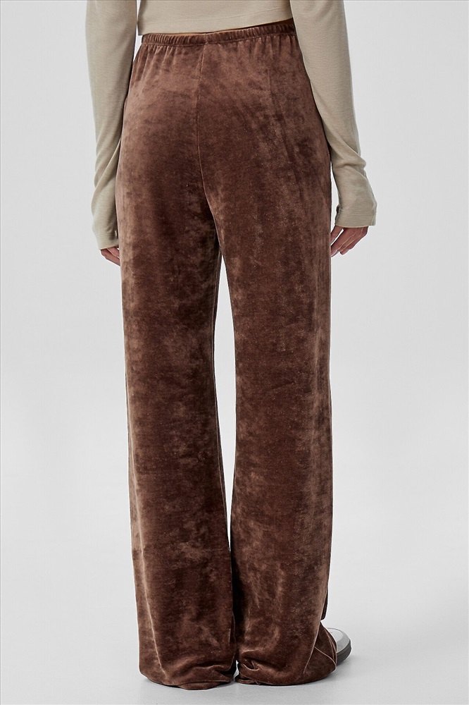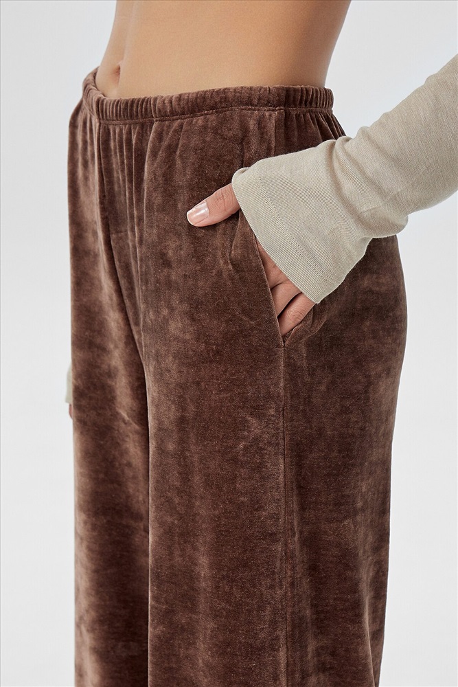 Брюки прямого силуэта. Посадка средняя. Пояс цельнокроеный с эластичной тесьмой внутри (вн. 20мм 20RV). С внутренней стороны пробиты петли и втянут шнур (хб тесьма 10мм) с застроченными концами. В боковых швах обработаны карманы. Подкладка карман из кулирки. Нижние срезы обработаны швом вподгибку.