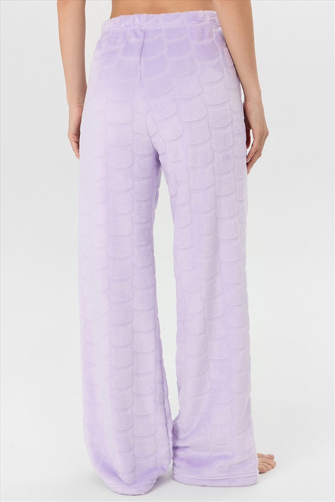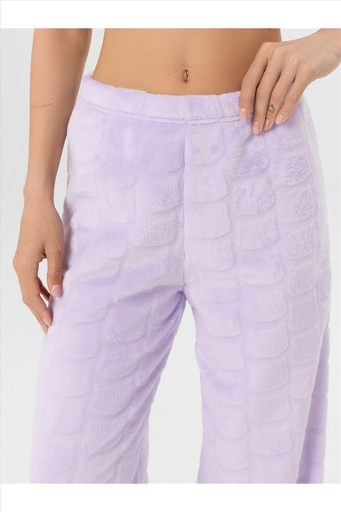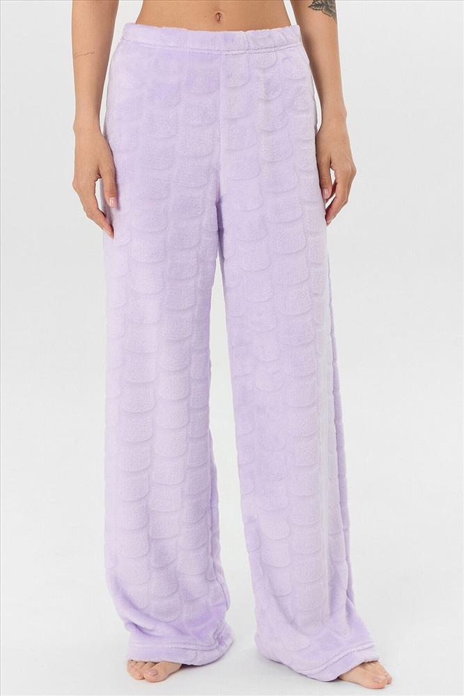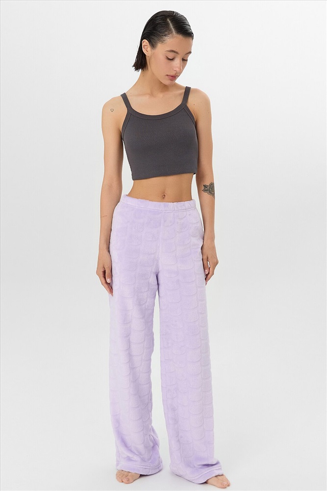 Женские домашние брюки — это уют и элегантность для вашего отдыха. Модель выполнена из мягкого трикотажа с меховым ворсом, который обеспечивает тепло и нежное прикосновение к коже. Прямой свободный крой со средней посадкой и эластичным поясом на широкой резинке гарантирует комфорт без давления, идеально адаптируясь к фигуре. Аккуратная обработка низа сохраняет форму брюк даже после множества стирок.