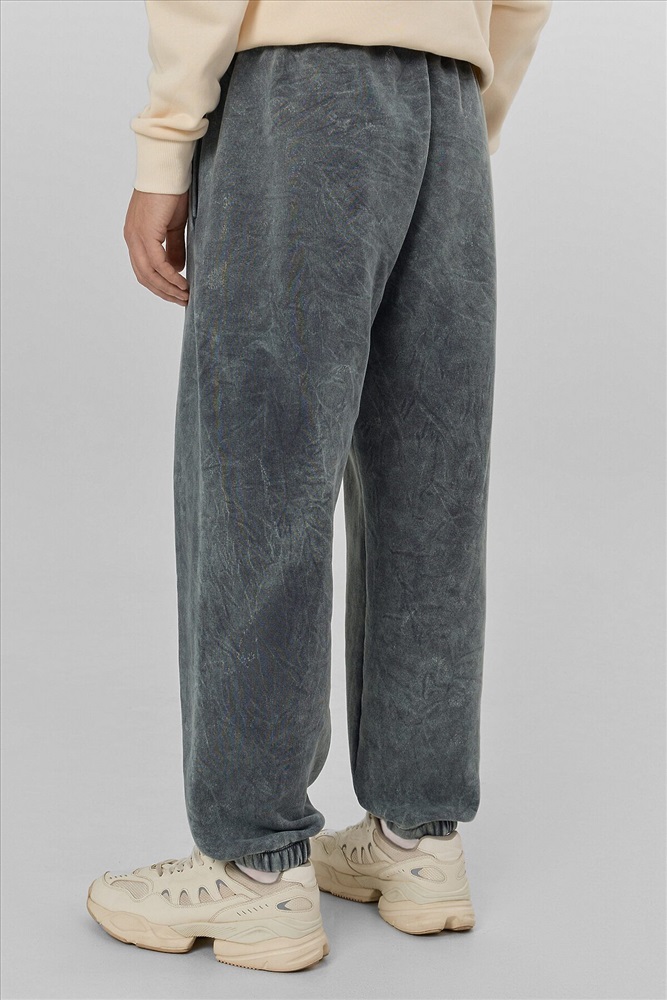 Джоггеры мужские изготовлены из полотна трикотажного футер 3-х нитка (без подчёса). Джоггеры свободные, посадка средняя. Джоггеры без бокового шва. Пояс цельнокроёный с эластичной тесьмой внутри. По переду пробиты петли и втянут шнур с застроченными концами (10РХC-1 10мм). На деталях переда карман в вытачке. Мешковина кармана из основного полотна. Нижние срезы обработаны швом вподгибку с эластичной тесьмой внутри.