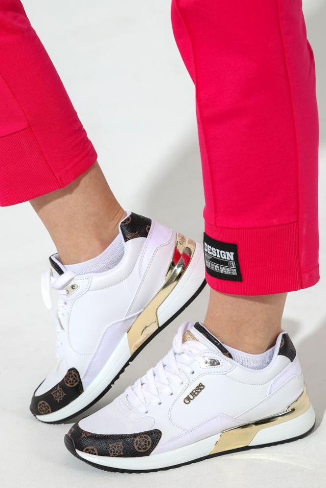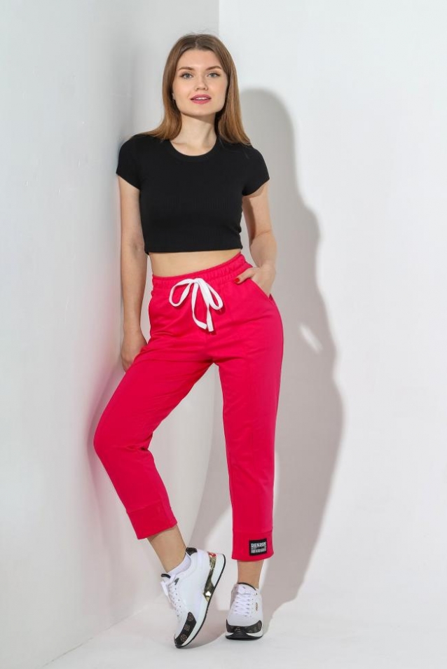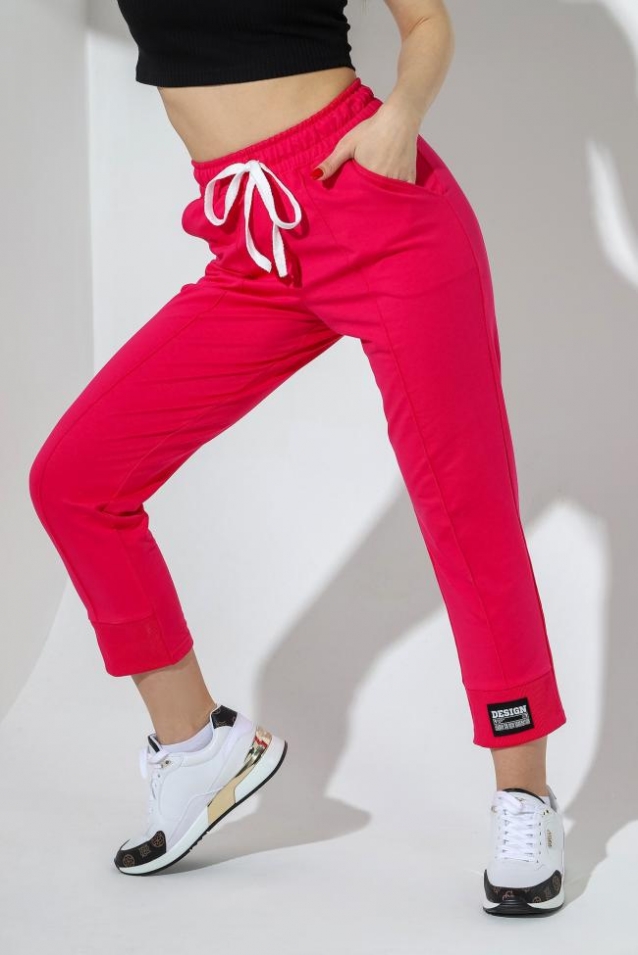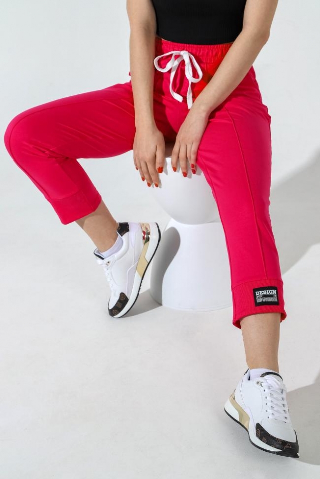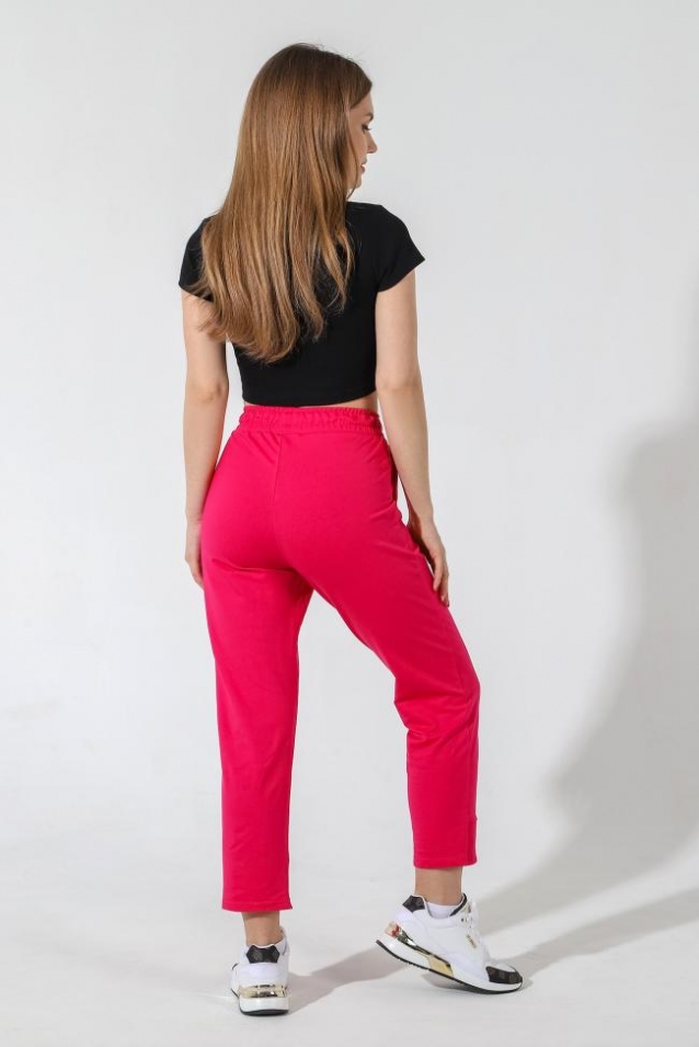 Брюки из трикотажного полотна футер-двухнитка, на притачном поясе с эластичной тесьмой внутри и карманами в боковых швах. Передние половины – разрезные по линиям центра. По швам стачивания настрочены отделочные строчки. В нижних частях передних половин – отделочные детали из полотна «кашкорсе» в цвет основного материала. На левой отделочной детали настрочен декоративный элемент прямоугольной формы. Средний шов передней половины – с имитацией застежки.