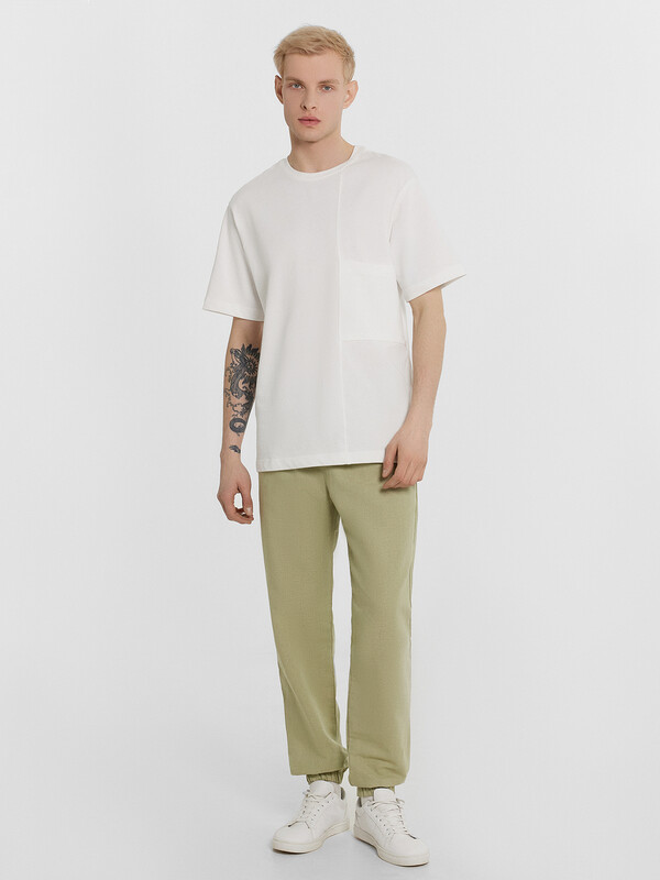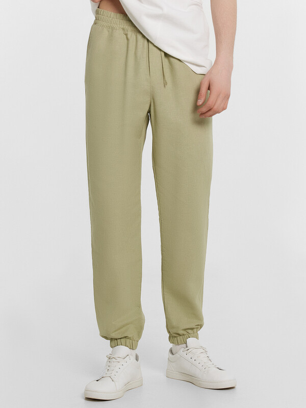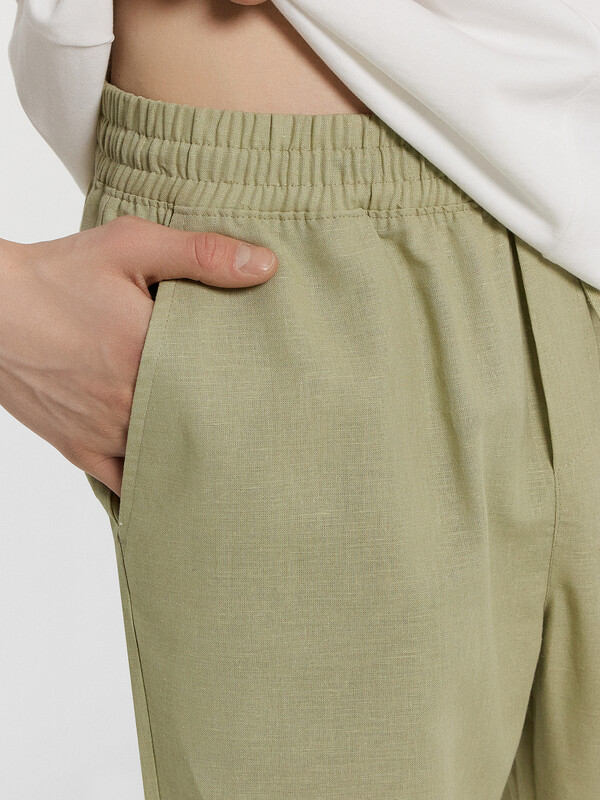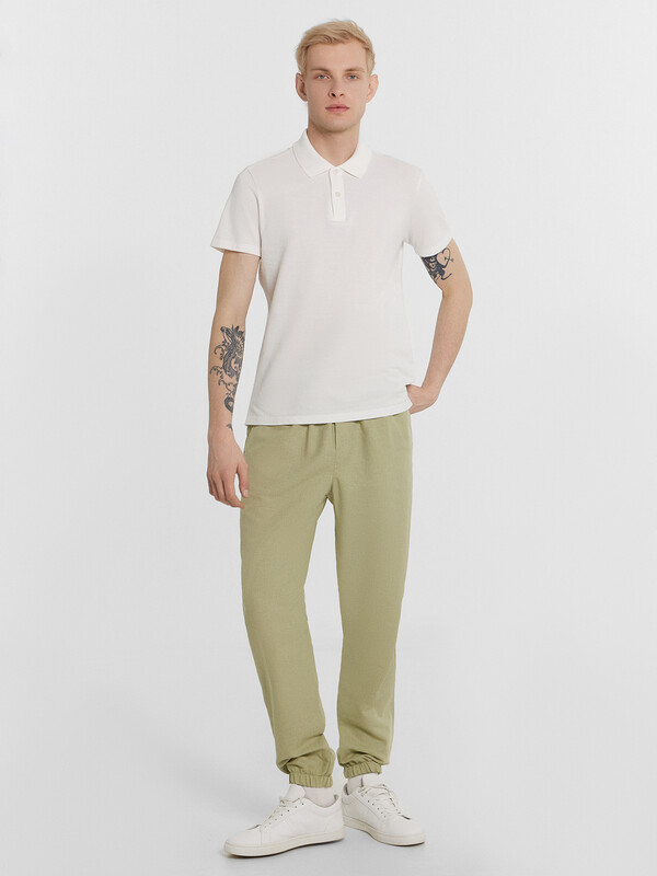 Производитель: Mark Formelle Текстильные брюки классической длины из натурального хлопка и льна. Силуэт свободный, немного зауженный к низу. Пояс с эластичной тесьмой внутри и регулировочным шнуром. Есть карманы-хулиганы. По низу штанин – эластичная тесьма. Гульфик не функциональный, имитация. Стильные брюки!