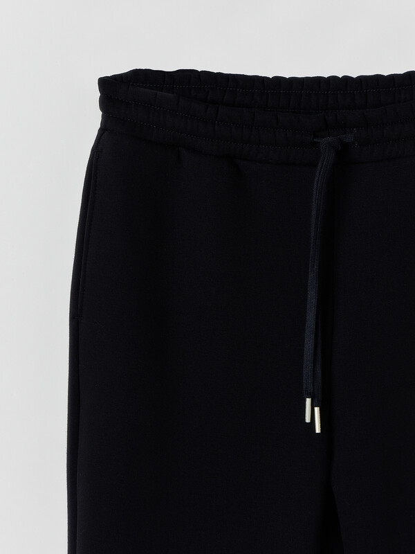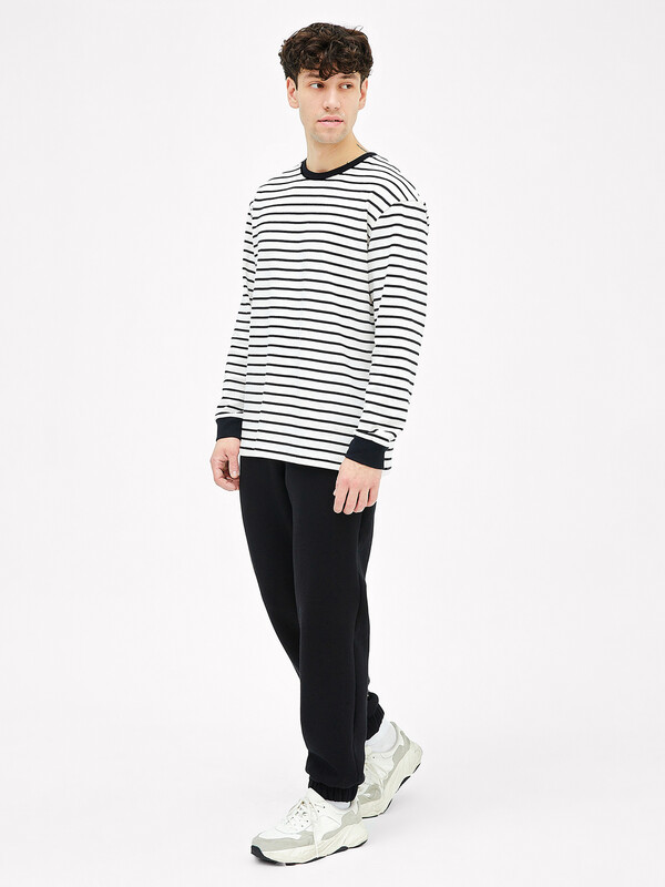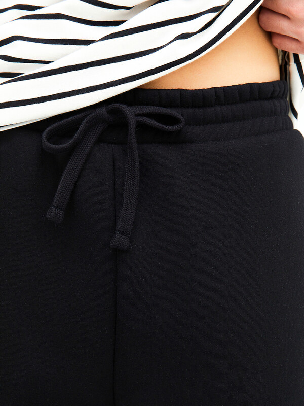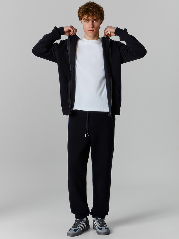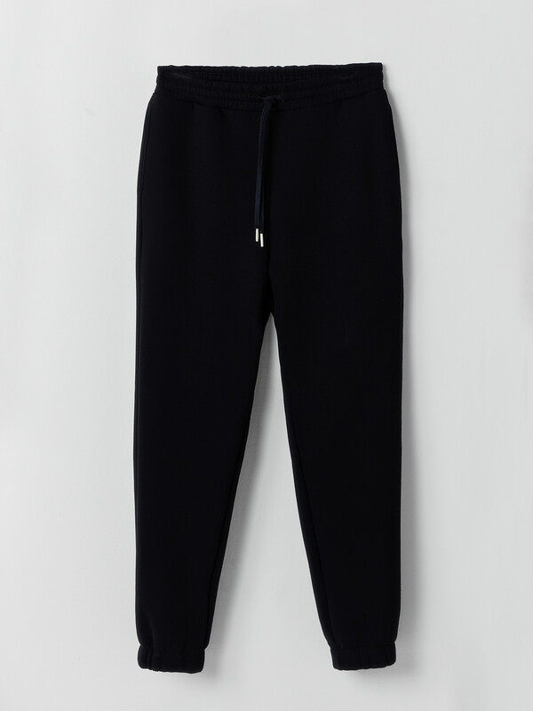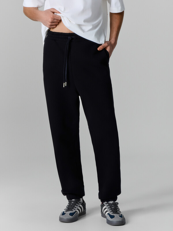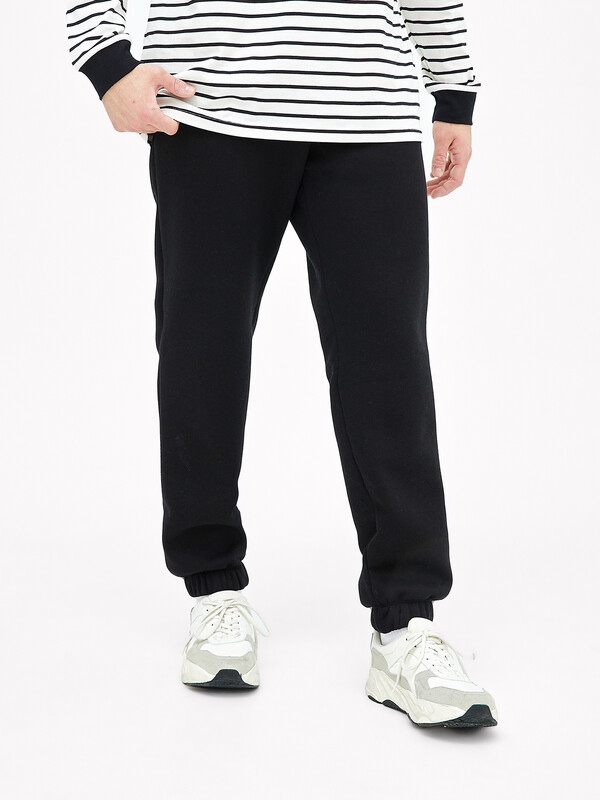 Брюки из трикотажного футера с теплым подчесом. Силуэт свободный. Линия талии классическая. Сидение немного спущено. Есть удобные боковые карманы. Пояс с эластичной тесьмой и регулировочным шнурком-затяжкой. Низ брюк подогнут, с эластичной тесьмой. Удобные брюки – рекомендуем!