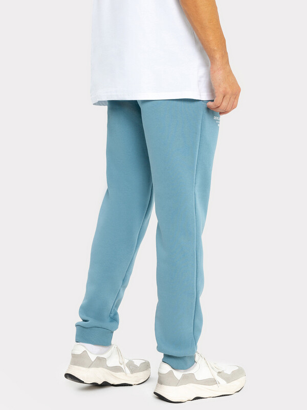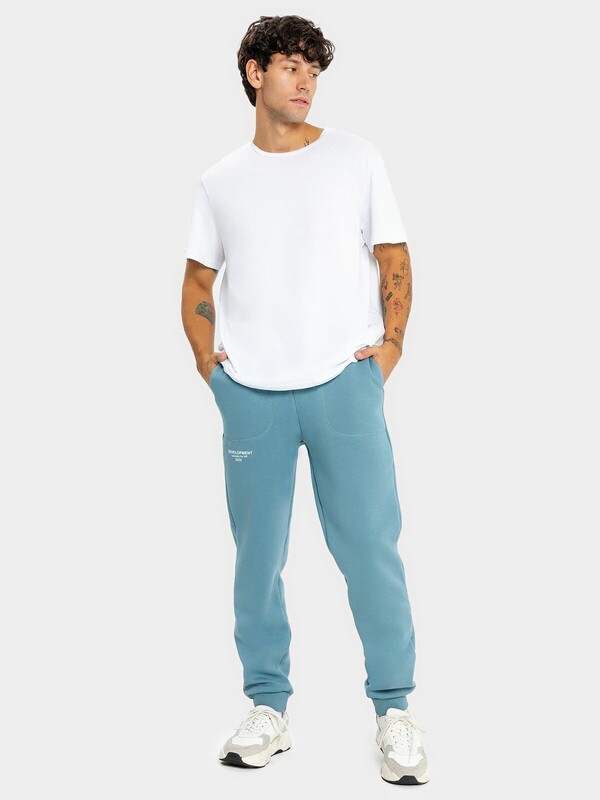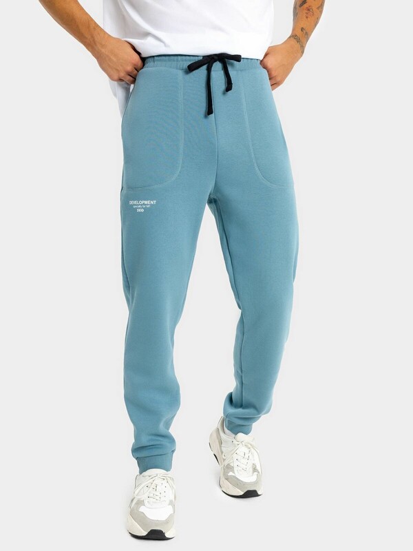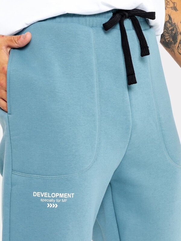 Брюки из футера. Брюки свободного силуэта. Посадка средняя. На передних деталях карманы накладные, отстрочены. Пояс отрезной с эластичной тесьмой из рибаны, отстрочен. По переду в поясе пробиты петли и протянут шнур 1 см. Концы шнура застрочены. Низ брюк обработан манжетами из рибаны.