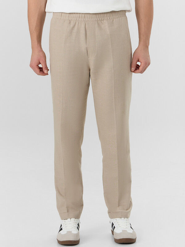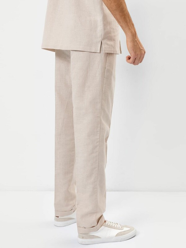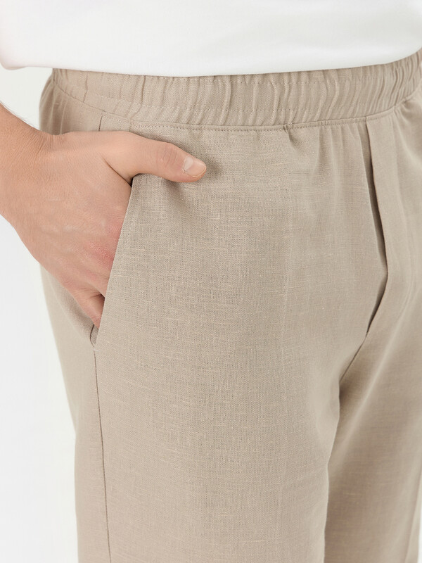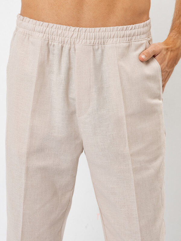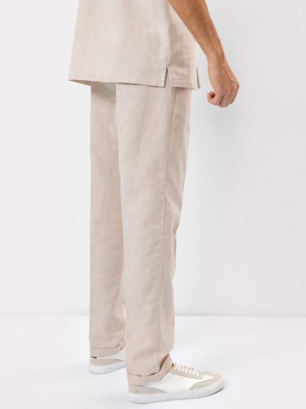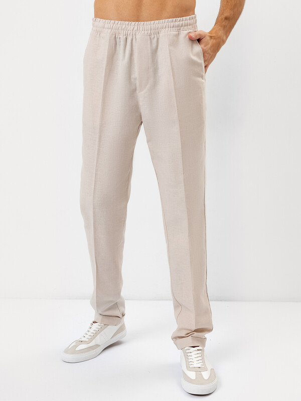 Стильные мужские брюки из премиального льна и хлопка. Силуэт свободный, слегка заужен к низу. Пояс – с эластичной тесьмой внутри и шнуром-завязкой, с помощью которого можно регулировать ширину в поясе. Есть удобные боковые карманы-хулиганы. Гульфик – имитация. Нижние края брюк отвернуты. Рекомендуем!