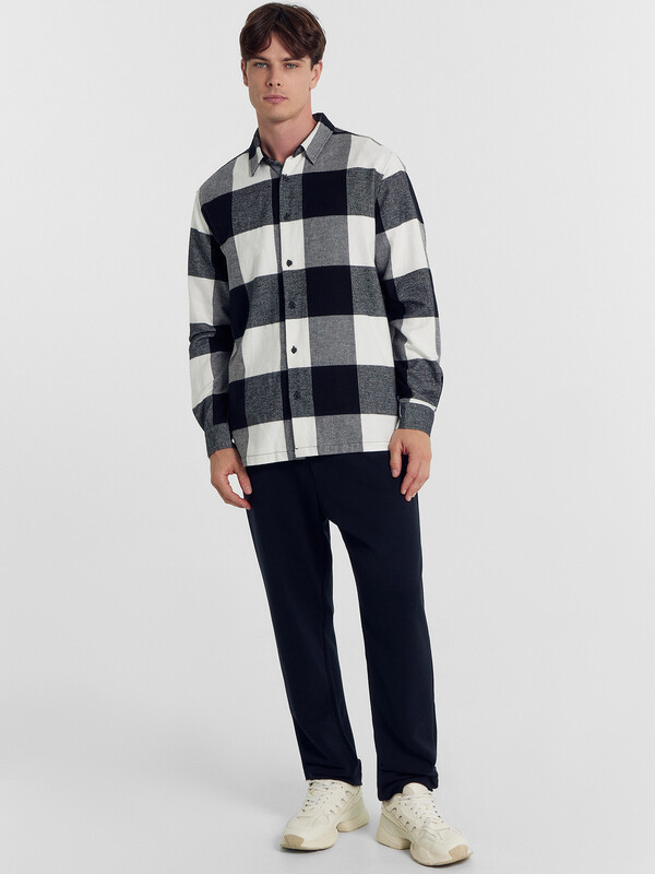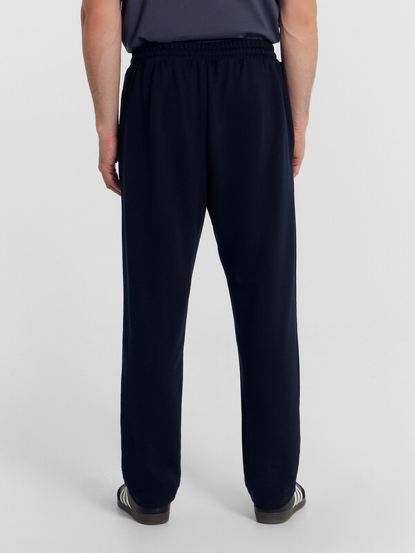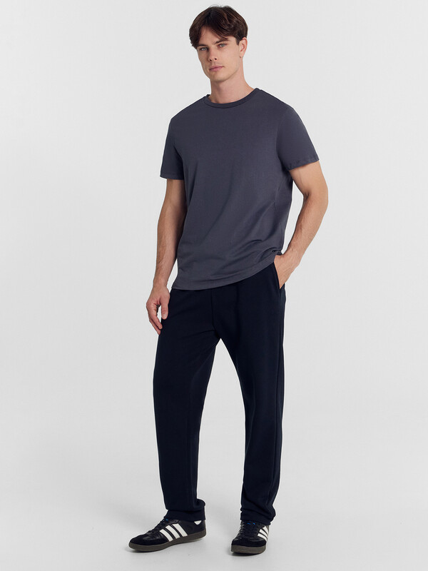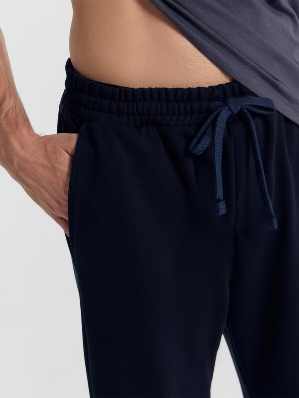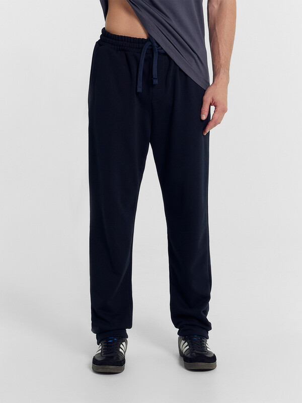 Прямые свободные брюки для мужчин. Выполнены из легкого трикотажного футера. Пояс – с эластичной тесьмой внутри и шнурком-завязкой, который позволяет регулировать ширину в талии. Есть удобные боковые карманы. Гульфик – не функциональный, имитация. Штанины подогнуты. Рекомендуем!