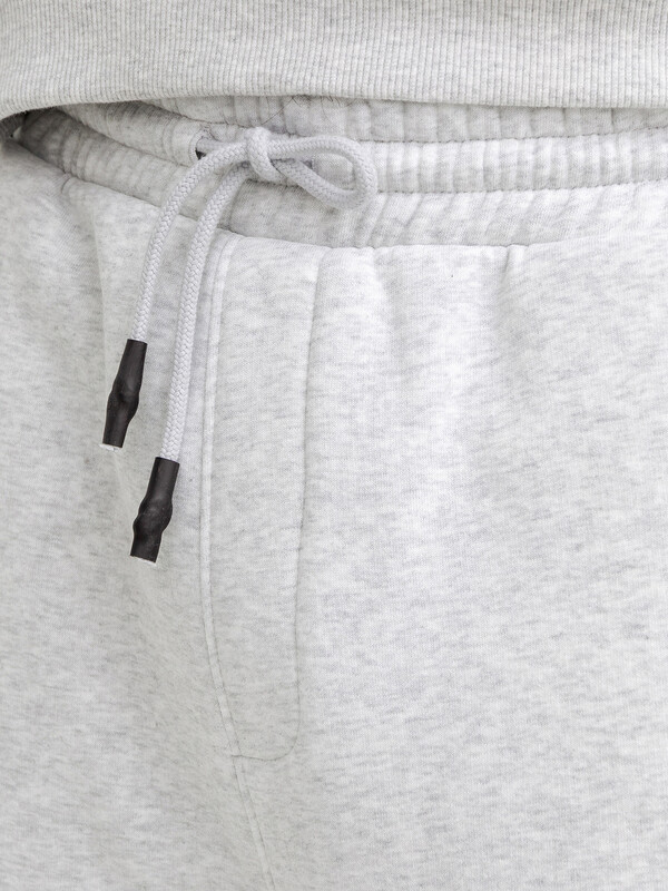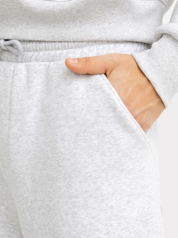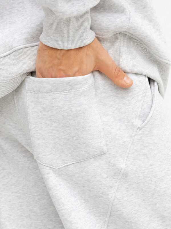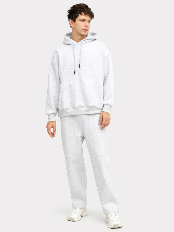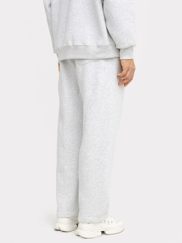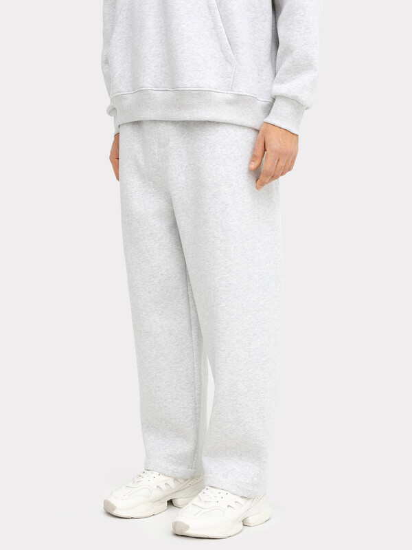 Брюки изготовлены из футера. Брюки прямые свободные (оверсайз), слегка зауженные к низу. Сидение спущено.