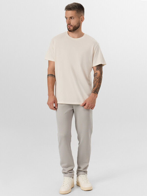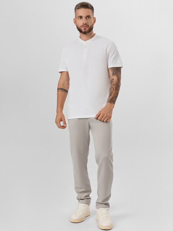 Мужские брюки из интерлока – идеальное сочетание комфорта и стиля. Эта модель прямого силуэта, слегка зауженная к низу, подчеркивает современный и актуальный дизайн. Пояс с эластичной кулиской обеспечивает оптимальную посадку и комфорт в течение всего дня. Карманы в боковых швах добавляют практичности и функциональности, а отвороты на низу брюк придают завершенный и стильный вид. Эти брюки станут отличным дополнением к вашему повседневному гардеробу, позволяя выглядеть элегантно и уверенно в любой ситуации.