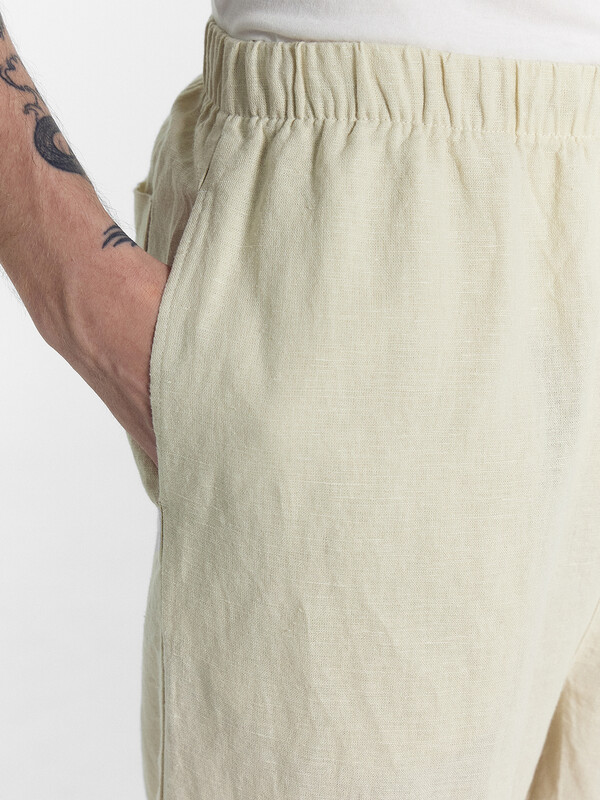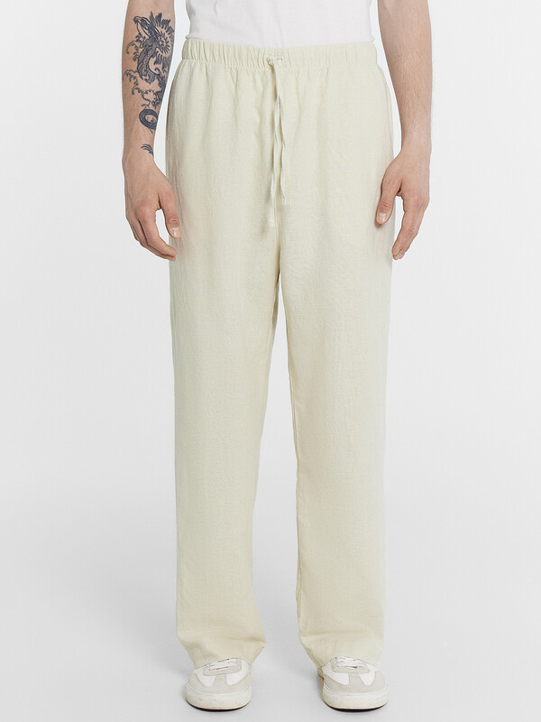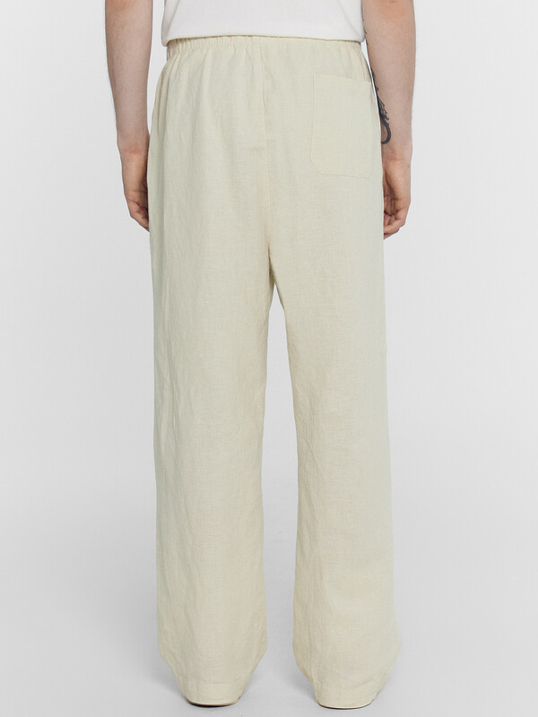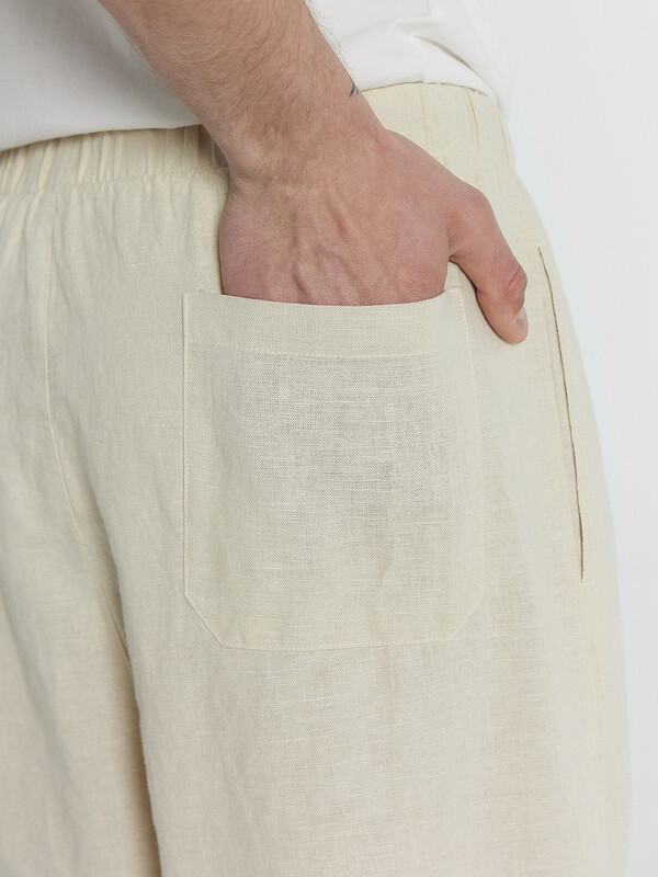 Брюки прямые, посадка средняя. Пояс отрезной с эластичной тесьмой внутри. По переду пробиты петли и втянут шнур-бейка из основного полотна с застроченными концами. В боковых швах обработаны карманы. По переду обработан гульфик с супатной застежкой на петли и пуговицы. На задней правой половинке накладной карман. Нижние срезы брюк обработаны швом вподгибку.