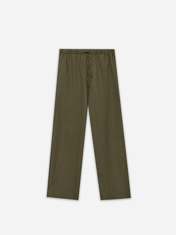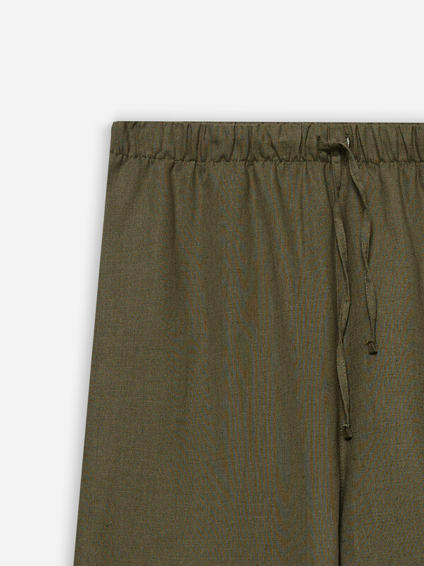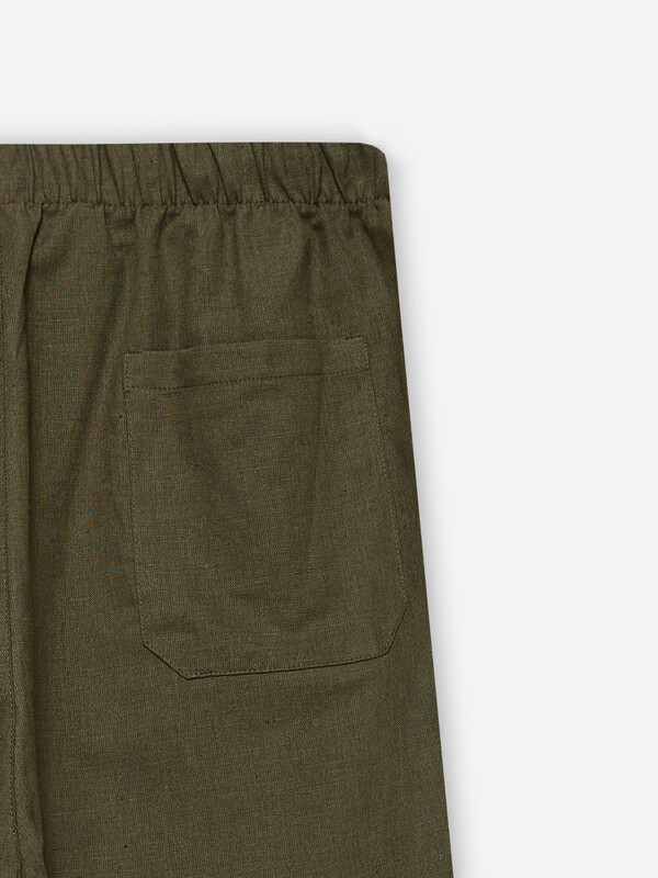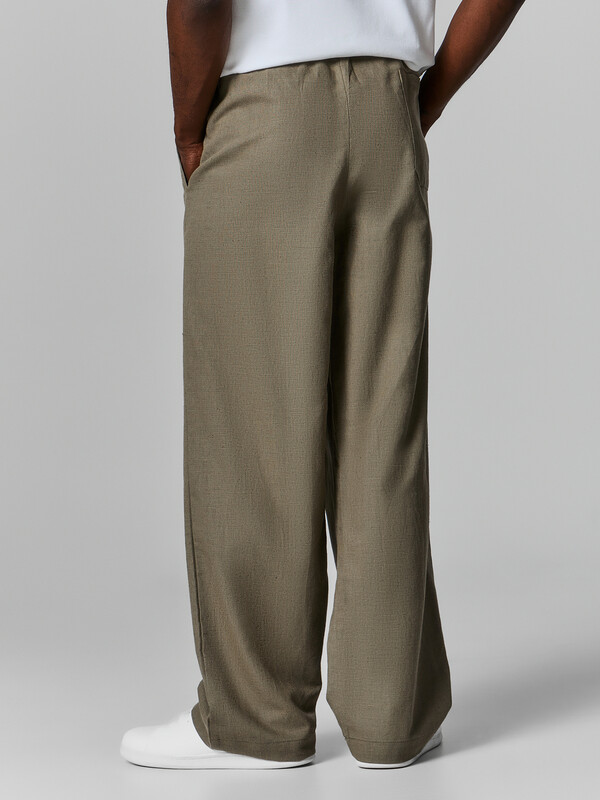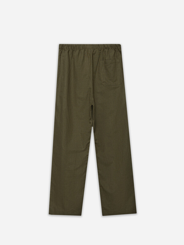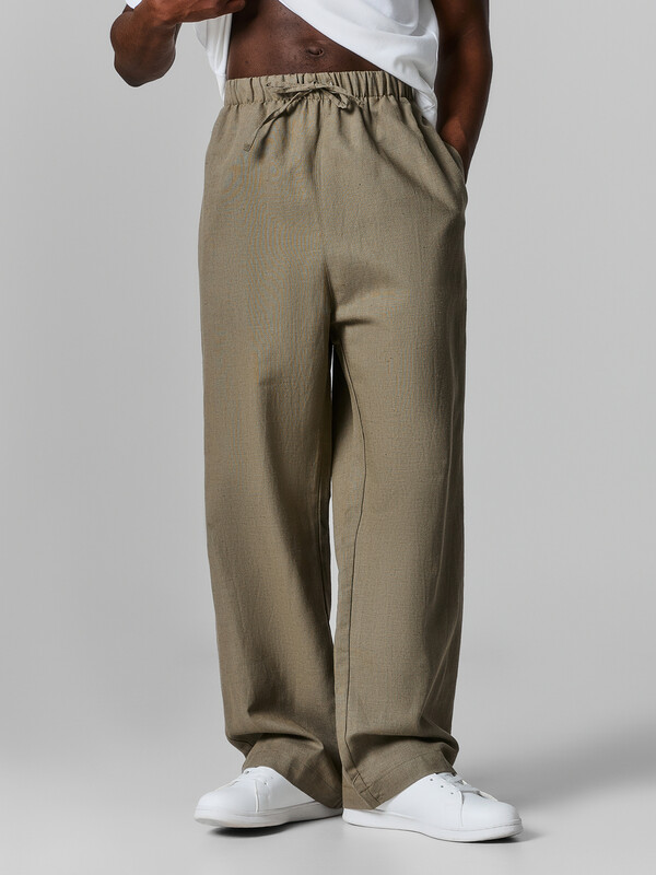 Брюки прямые, посадка средняя. Пояс отрезной с эластичной тесьмой внутри. По переду пробиты петли и втянут шнур-бейка из основного полотна с застроченными концами. В боковых швах обработаны карманы. По переду обработан гульфик с супатной застежкой на петли и пуговицы. На задней правой половинке накладной карман. Нижние срезы брюк обработаны швом вподгибку.