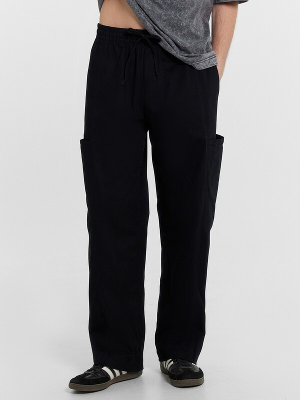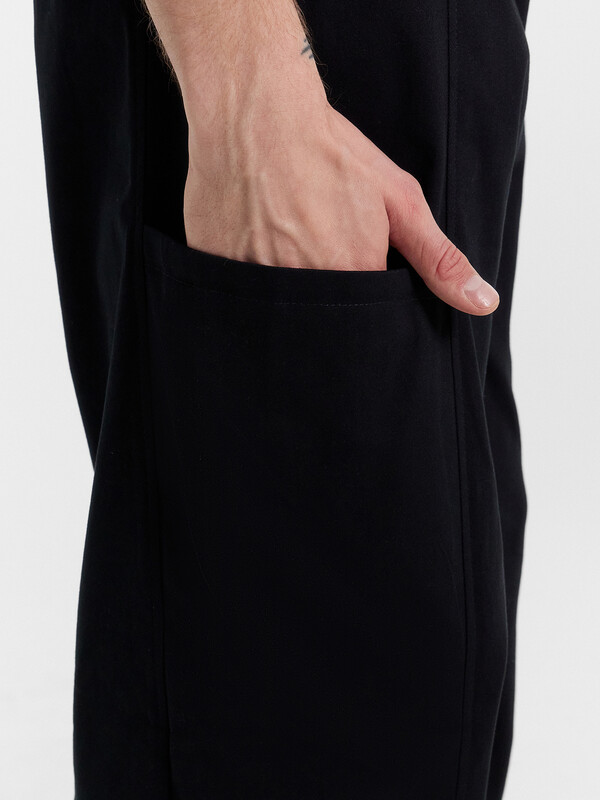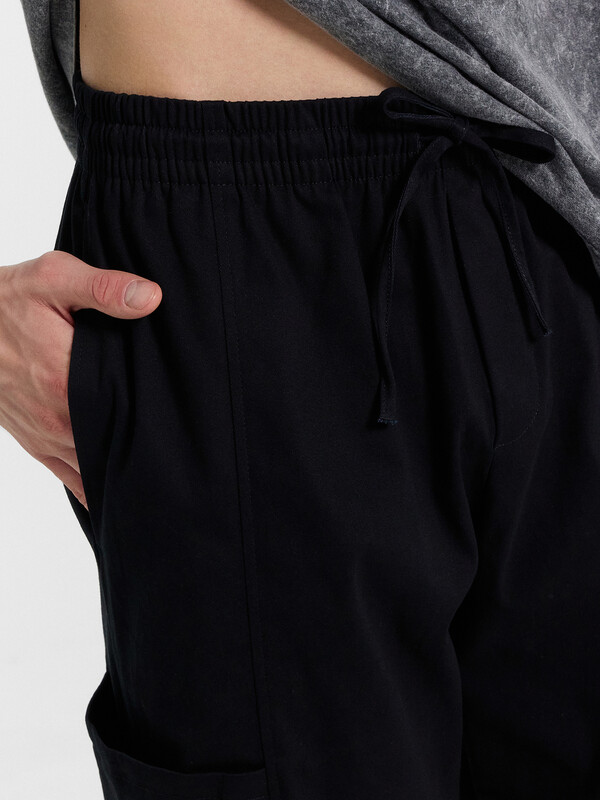 Пояс цельнокроеный с эластичной тесьмой внутри. С внешней стороны пояса пробиты петли и втянут шнур-бейка с застроченными концами из основного полотна. В боковых швах обработаны горизонтальные карманы. На левой половинке переда проложена декоротивная строчка- имитация гульфика. Нижние срезы обработаны швом в подгибку. 98% хлопок; 2% спандекс Комментарии к товару