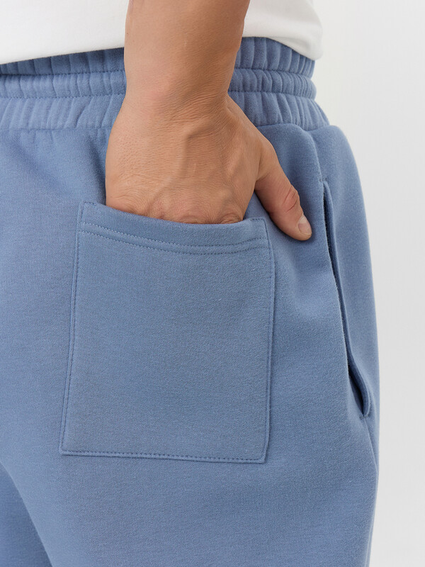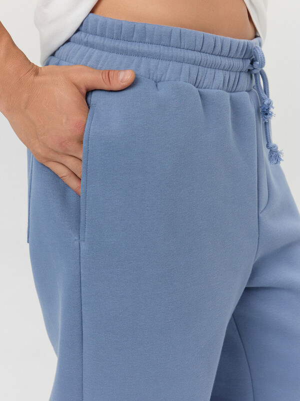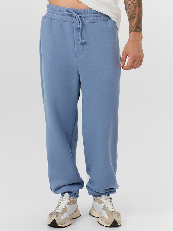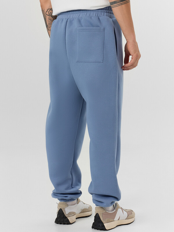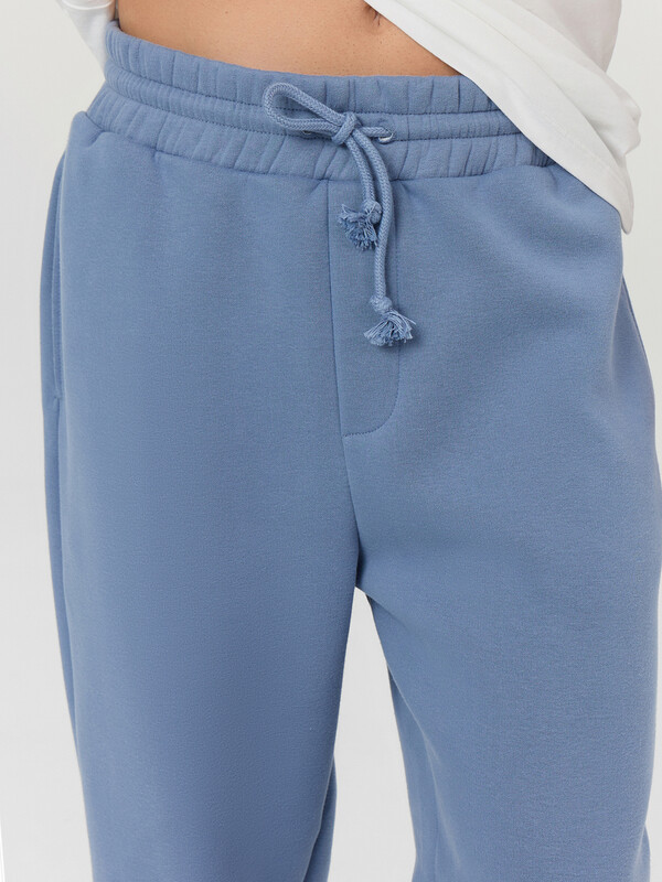 Брюки прямые, свободные. Пояс отрезной с эластичной тесьмой внутри. С внешней стороны пояса пробиты петли и втянут шнур (8КXW-1 8мм) с узлом на концах. В боковых швах обработаны карманы, подкладка кармана из основного полотна. На левой передней половинке проложена декоративная строчка - имитация гульфика. На задней правой половинке накладной карман. Нижние срезы брюк обработаны швом вподгибку с эластичной тесьмой внутри.