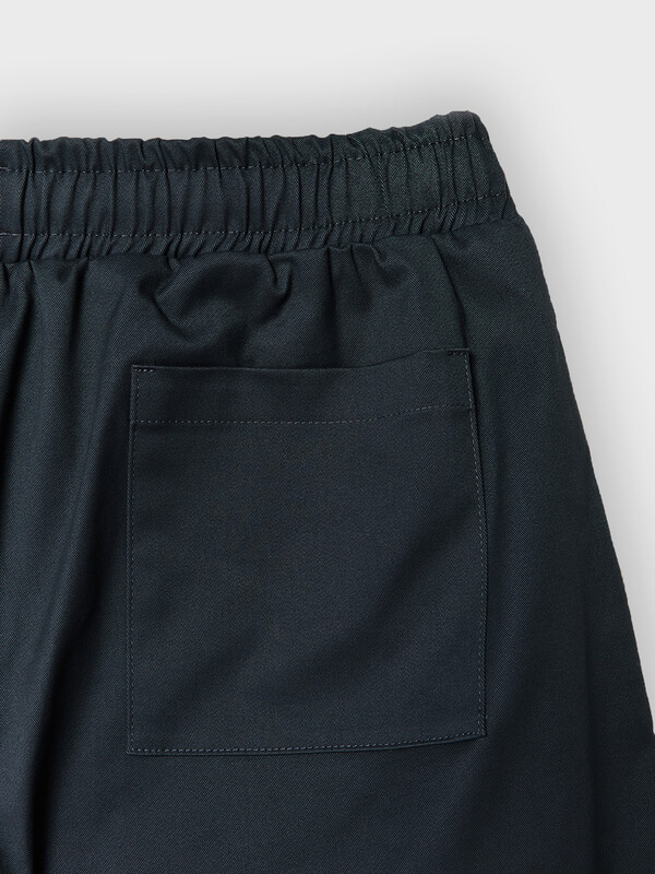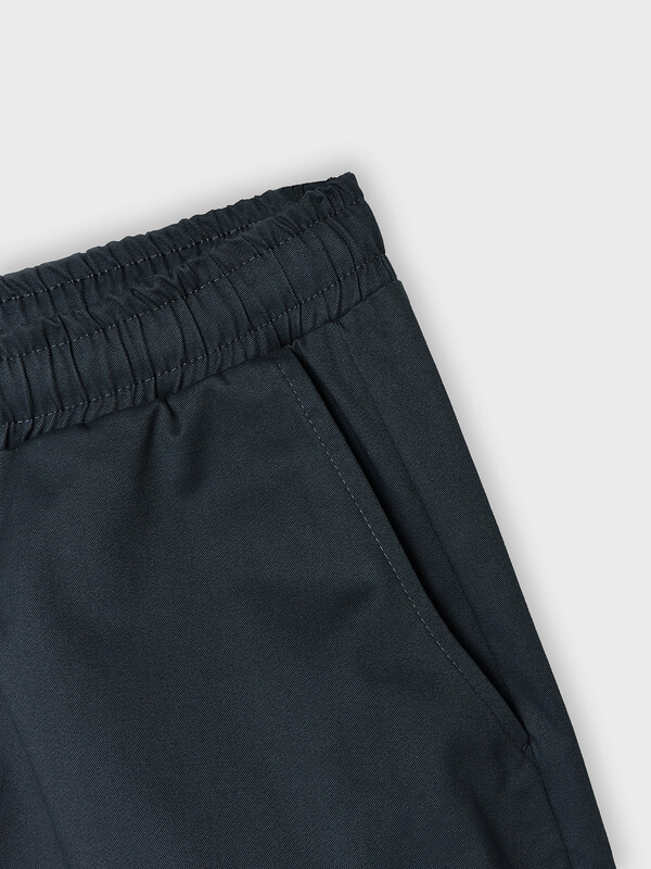 На деталях переда карманы с отрезным бочком. В среднем шве имитация гульфика. На уровне колен от боковых швов заложены по одной складке.