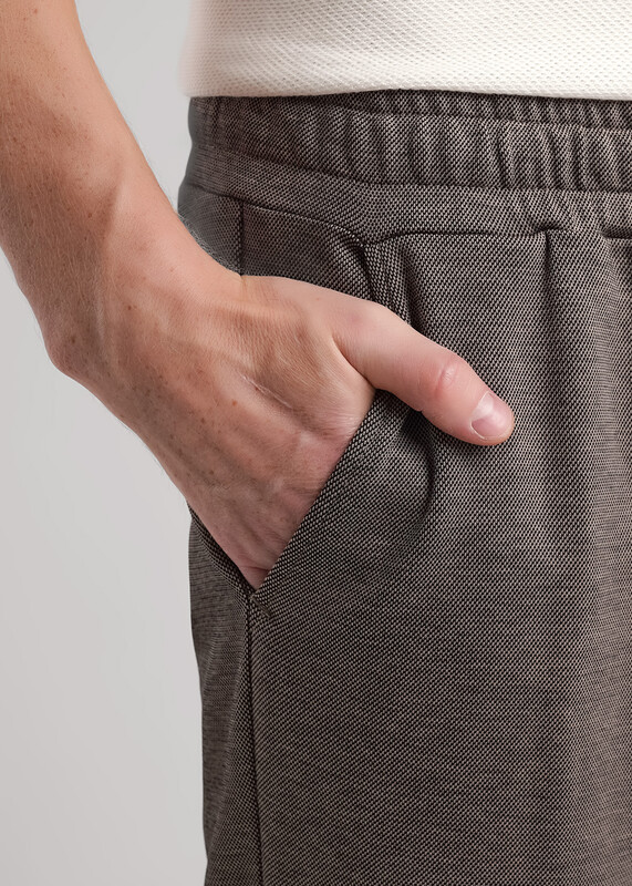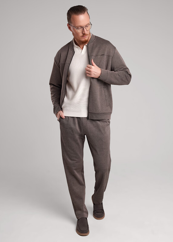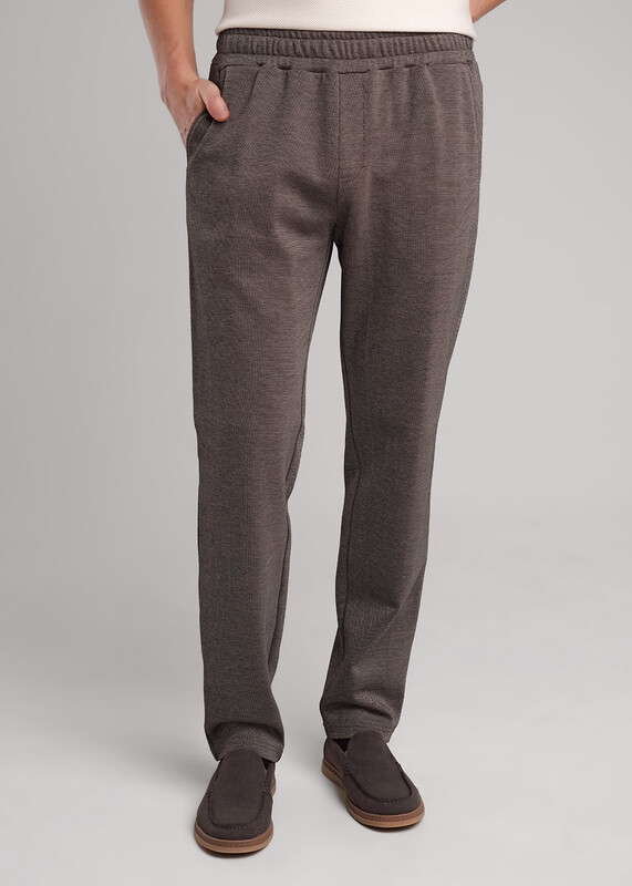 Прямые мужские зауженные брюки из трикотажного полотна с небольшой фактурой. Функциональность модели придают боковые карманы и регулируемая талия. Брюки износостойкие и устойчивые к деформации. Хорошо подходят для повседневного гардероба.