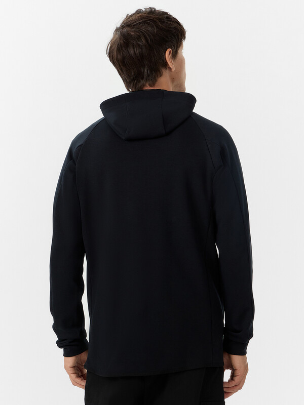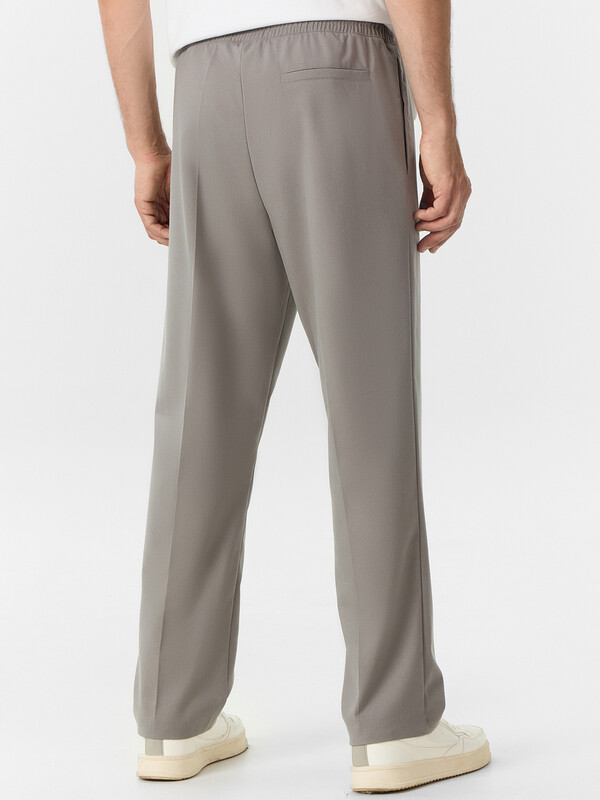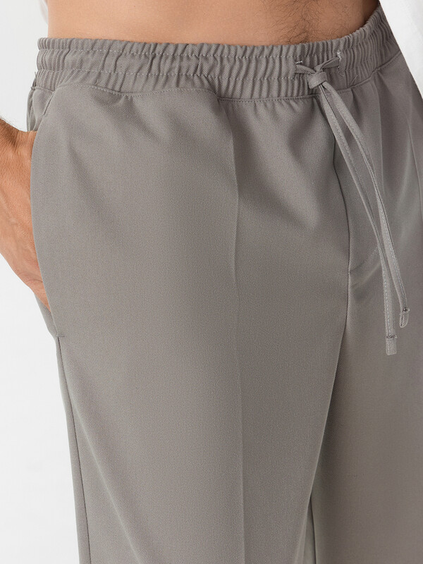 Брюки зауженные книзу, посадка средняя. Пояс отрезной с эластичной тесьмой внутри. С внешней стороны пробиты петли и втянут шнур из основного полотна. На левой детали переда имитация гульфика. Карманы в боковых швах. Подкладка карманов из основного полотна. На правой детали спинки карман-обманка. Нижние срезы брюк обработаны потайным швом.