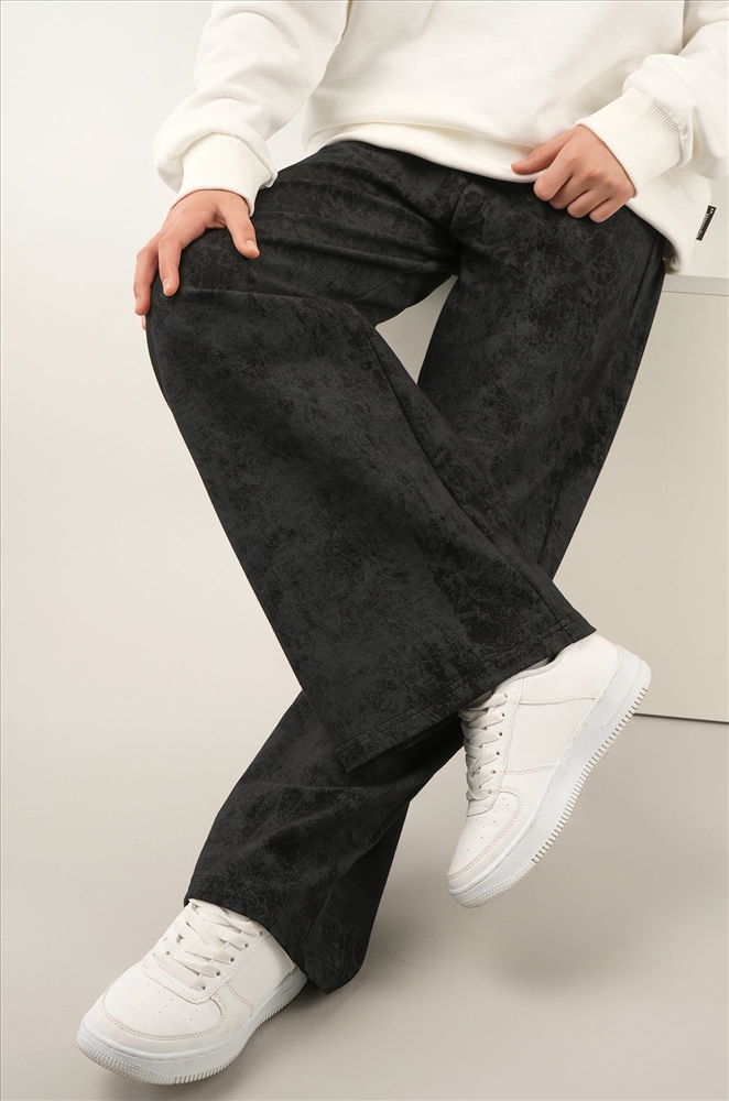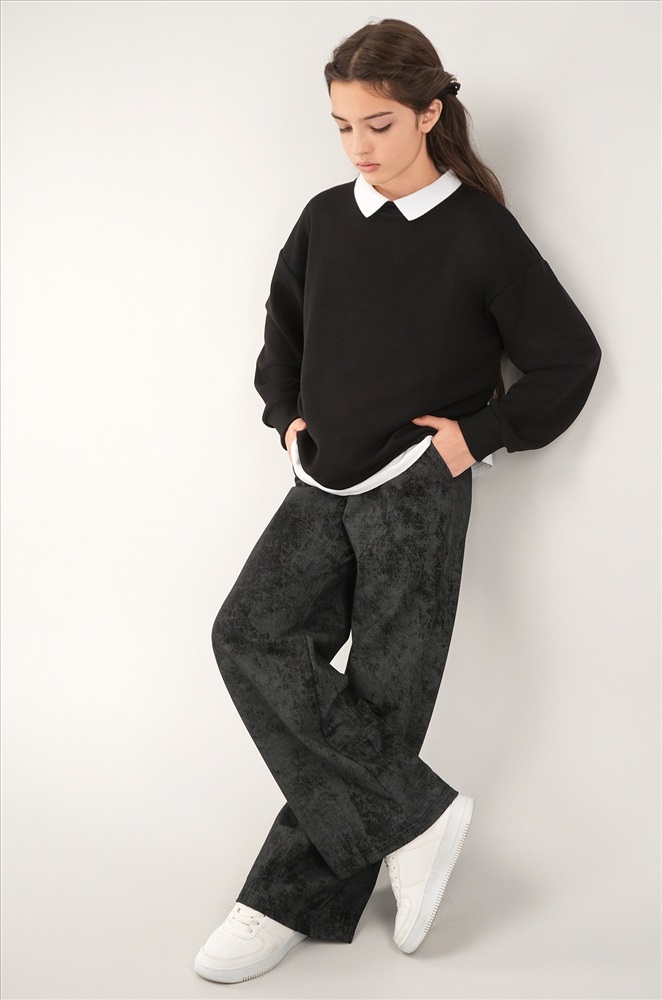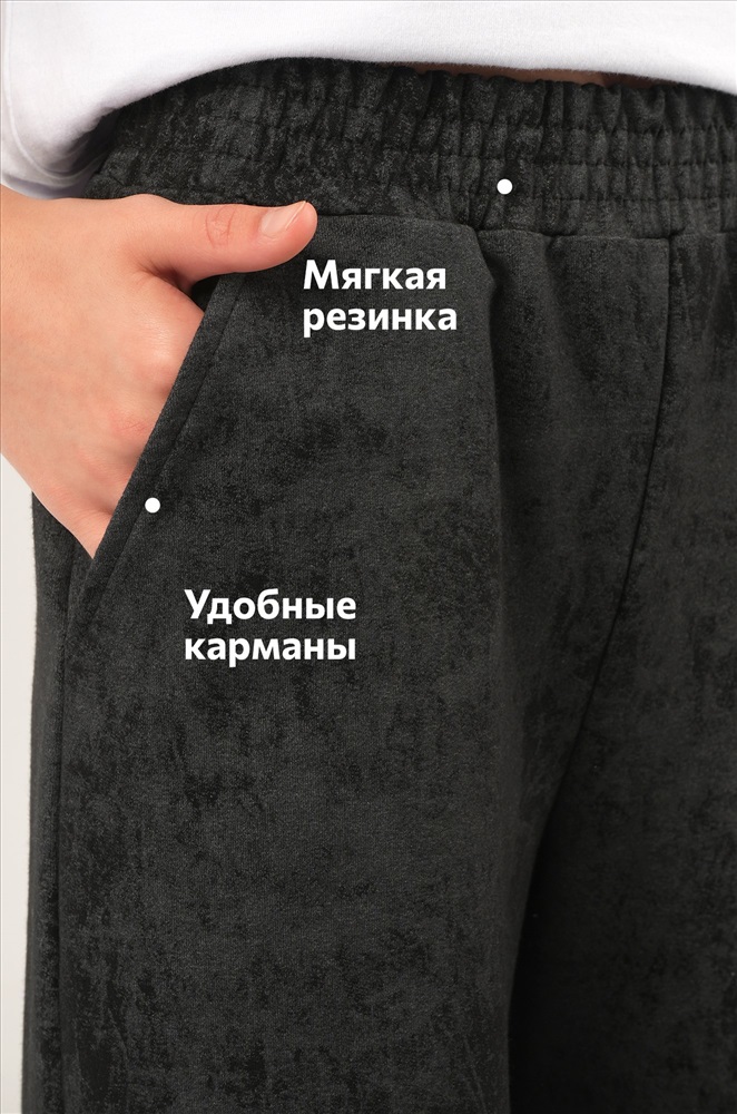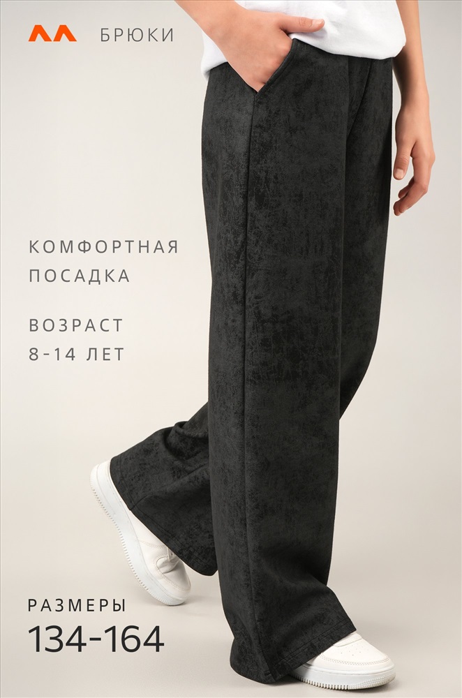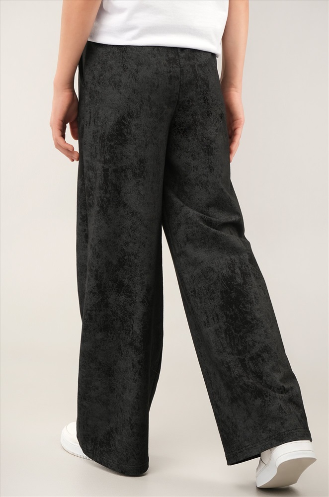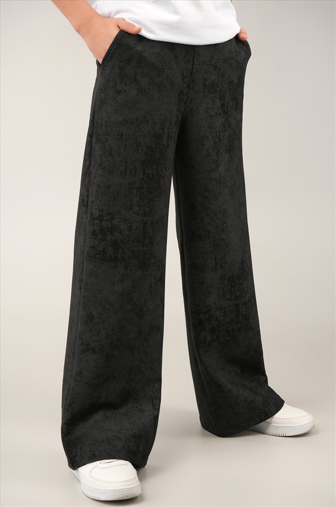 Чёрные брюки палаццо для девочки подростка с эффектом варёнка выглядят стильно и удобно в любой ситуации. Мягкий хлопковый трикотаж с потертой фактурой добавляет образу оригинальности.
