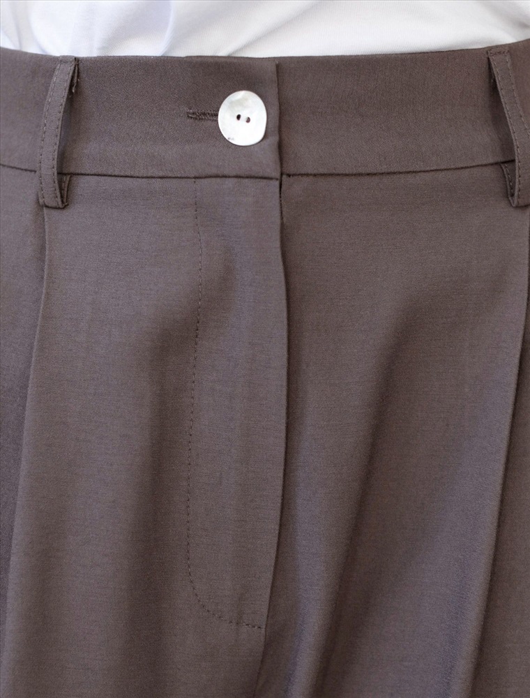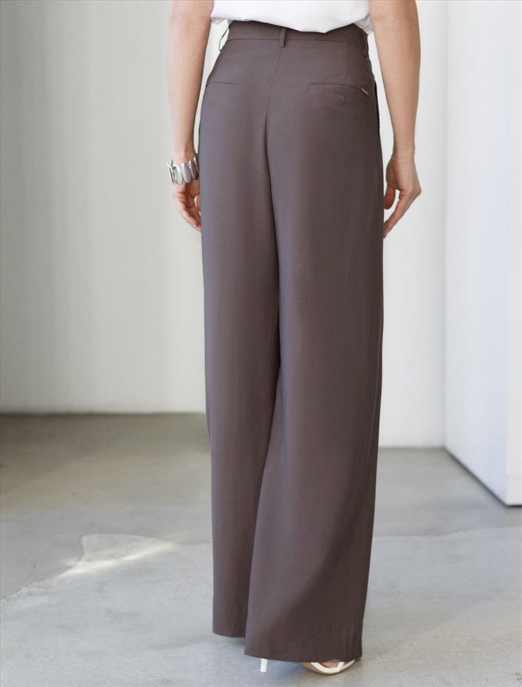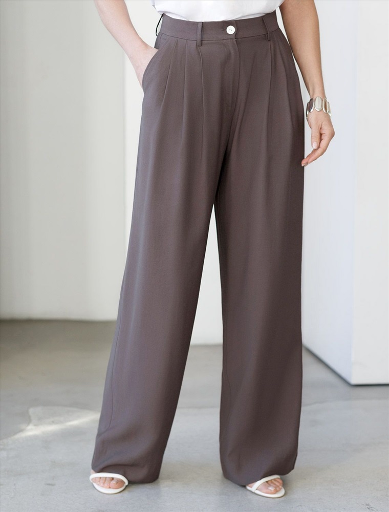 Брюки палаццо кофейного цвета выполнены из плотного лиоцелла. Лиоцелл это более дорогой и экологичный вариант вискозы, очень прочный и шелковистый. Ткань отличается от регулярной коллекции из лиоцелла - она содержит еще больше лиоцелла (92%), благодаря чему имеет более нежную шелковистую фактуру. Свободные прямые брюки с высокой посадкой визуально вытягивают и стройнят фигуру. Удобные карманы по бокам и свободный крой делают эти брюки базовым элементом гардероба. Летние брюки отлично сочетаются с монохромным верхом, с ними можно создавать эффектные наряды как на выход, так и для ежедневных рабочих дел или простых прогулок, от делового шика до повседневного кэжуал.
