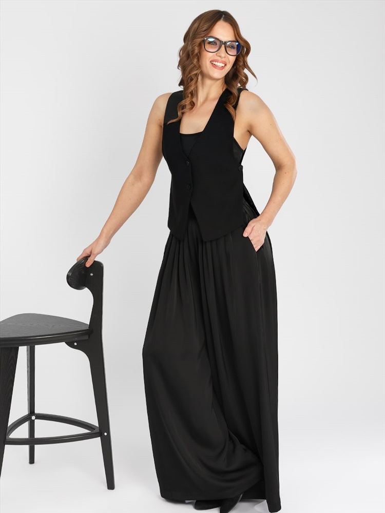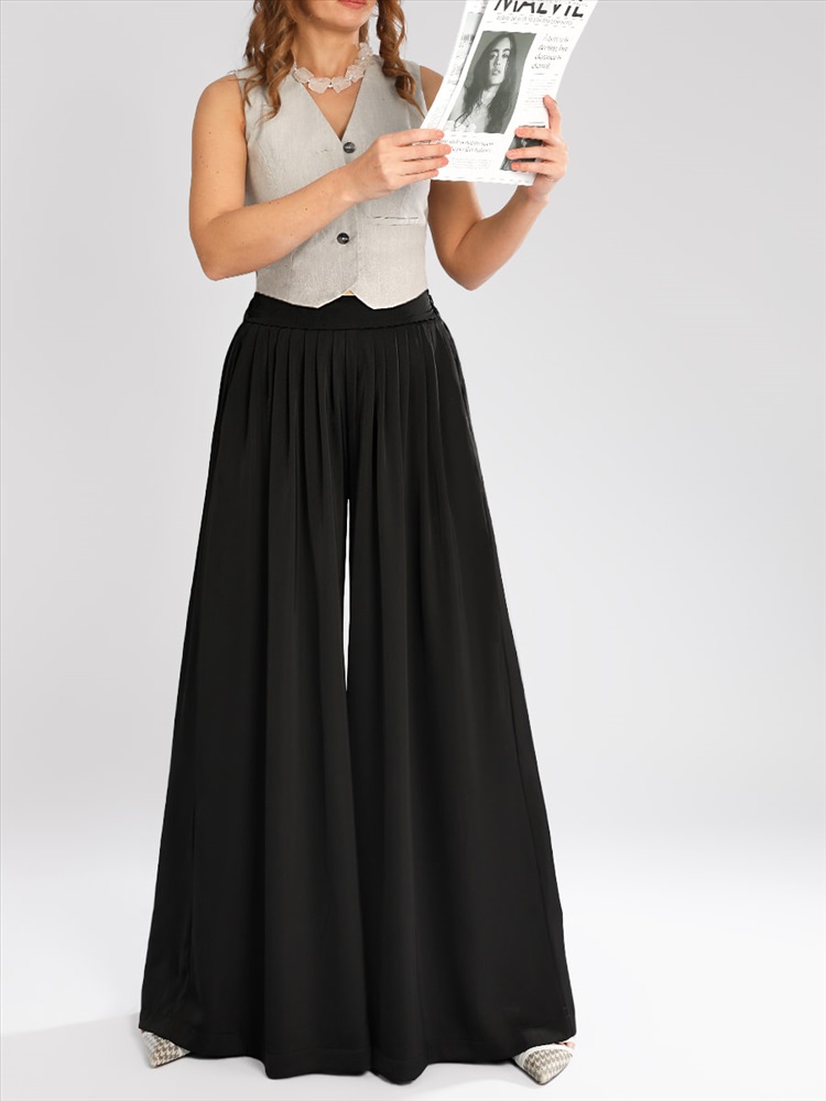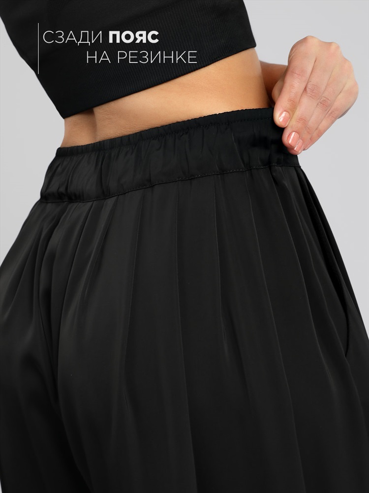 Элегантные шелковые брюки-палаццо Соль&Перец. Модель представляет собой изысканные женские брюки свободного кроя с характерным расширением к низу. Брюки на молнии, с высокой посадкой, с карманами по бокам, пояс на эластичной резинке сзади для комфортной посадки. Брюки прекрасно сочетаются с любым верхом, и подойдут для любого мероприятия, подчеркнут Ваш индивидуальный стиль.