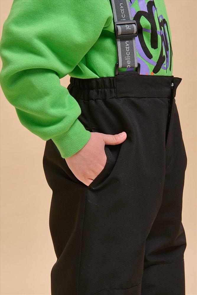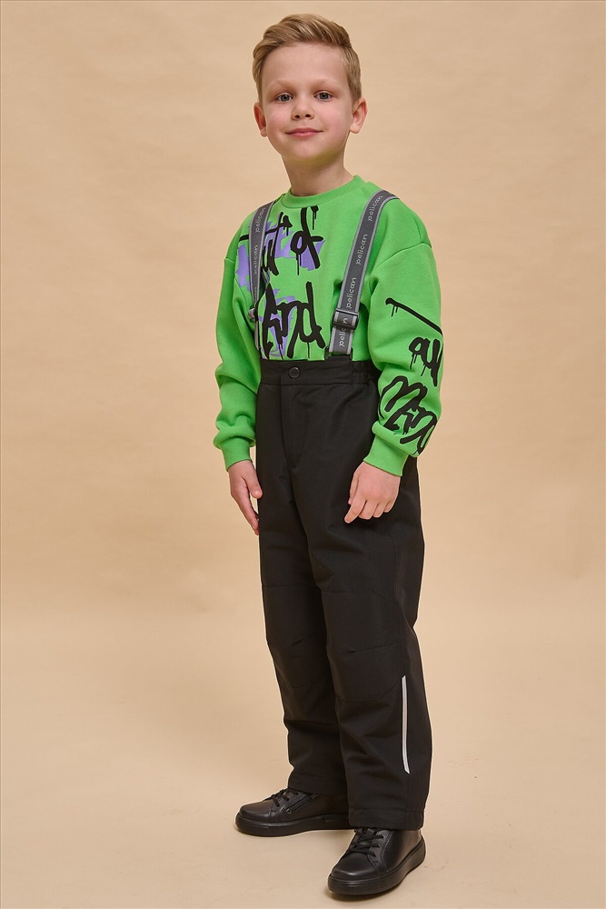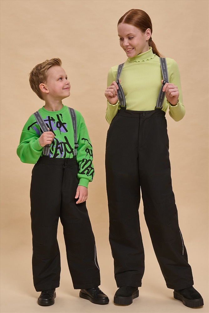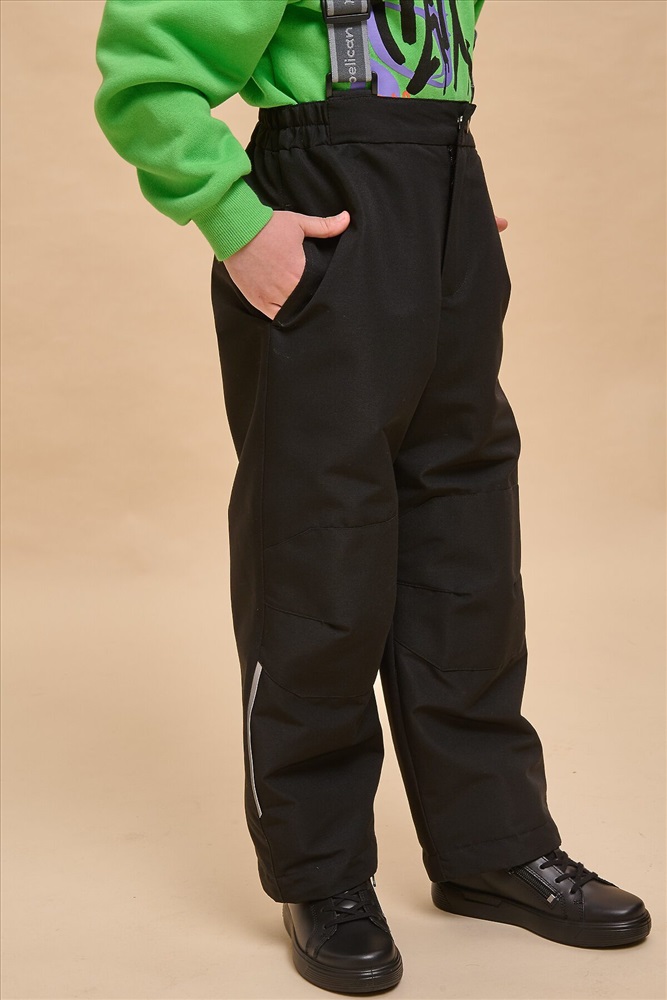 Брюки детские демисезонные из курточной ткани с влагоотталкивающей пропиткой. Идеальная модель на сырую и грязную погоду. Подходит как мальчикам, так и девочкам. Благодаря продуманному крою хорошо садятся на детей с любой фигурой. Штаны застёгиваются на молнию и кнопку. Отстёгивающиеся эластичные лямки регулируются по длине — дети дошкольного и младшего школьного возраста могут носить брюки с ними, дети постарше могут их отстегнуть. Лямки украшает лого бренда. По низу внутренняя утяжка на эластичный шнур со стопперами — можно менять силуэт брюк: прямые или затянутые. По бокам наклонные карманы — удобно пользоваться. В боковых швах светоотражающие элементы — безопасность в тёмное время суток. На коленях усилители с вытачками для удобства. За штанами легко ухаживать — согласно рекомендациям, указанным на вшивных ярлыках. Модель выполнена из полиэстера — брюки тёплые, лёгкие, просто стираются, быстро сохнут, сохраняют отличную форму и цвет надолго. Внутри штанов гладкая подкладка для удобства надевания. Брюки детские выполнены в универсальном цвете. Их легко сочетать с различными куртками и пальто. Осенние прямые брюки подходят для девочек и мальчиков дошкольного, младшего школьного возраста, а также подростков. Рекомендуемый температурный режим: не ниже минус 5 градусов. Утеплитель: синтепон 60 г/м2. Брюки детские чёрные идеальны для носки в школу, для прогулок и активного отдыха, спорта. Помните о правильном уходе за изделием: рекомендуется стирать при температуре не выше 30 °C, без предварительного замачивания, с изнанки. Это поможет сохранить качество и цвет куртки на длительное время. Не забывайте о выборе правильного размера. Используйте таблицу размеров на фотографии, чтобы выбрать подходящий вариант для вашего ребёнка. Обратите внимание, что цвет товара на экране вашего устройства может отличаться от реального.