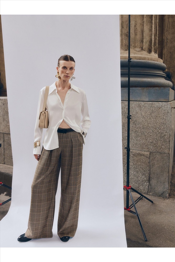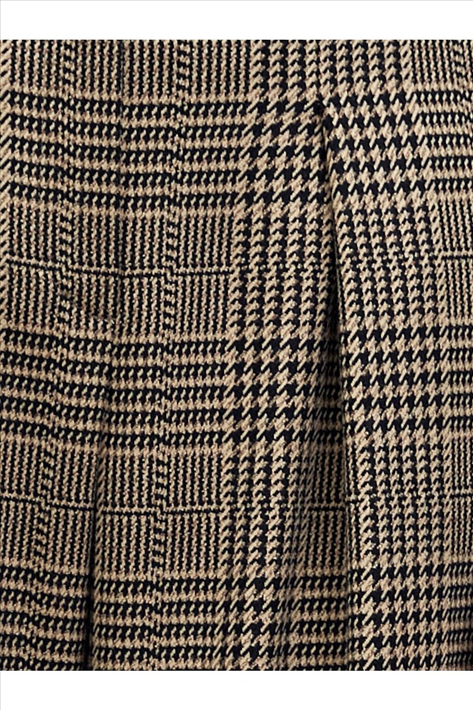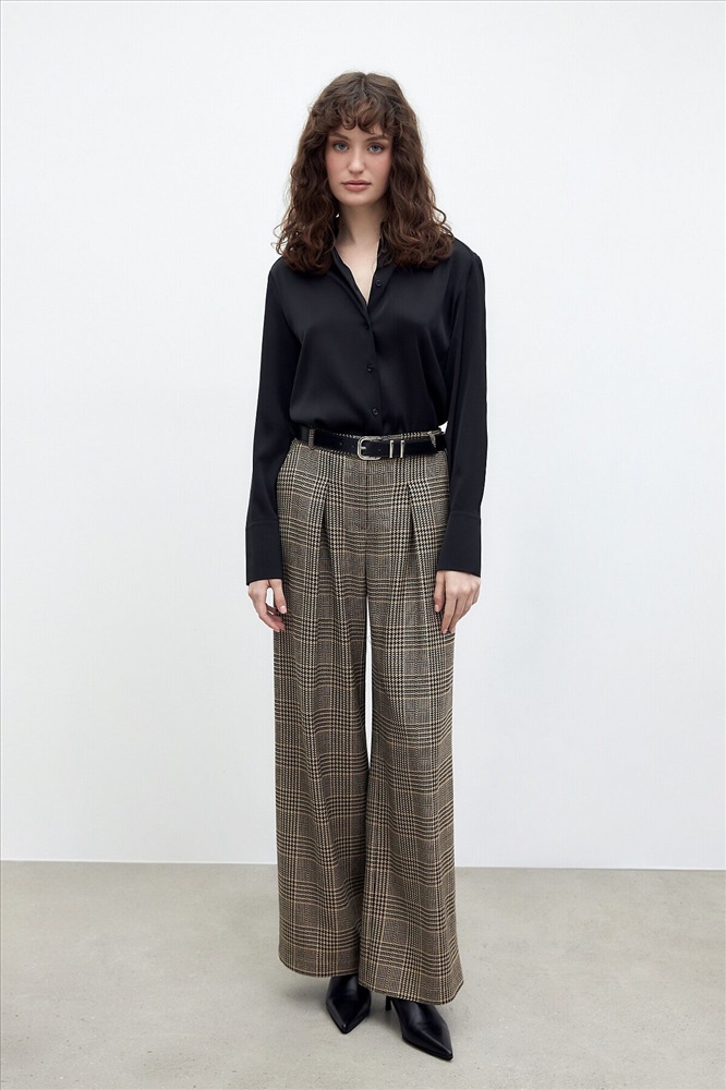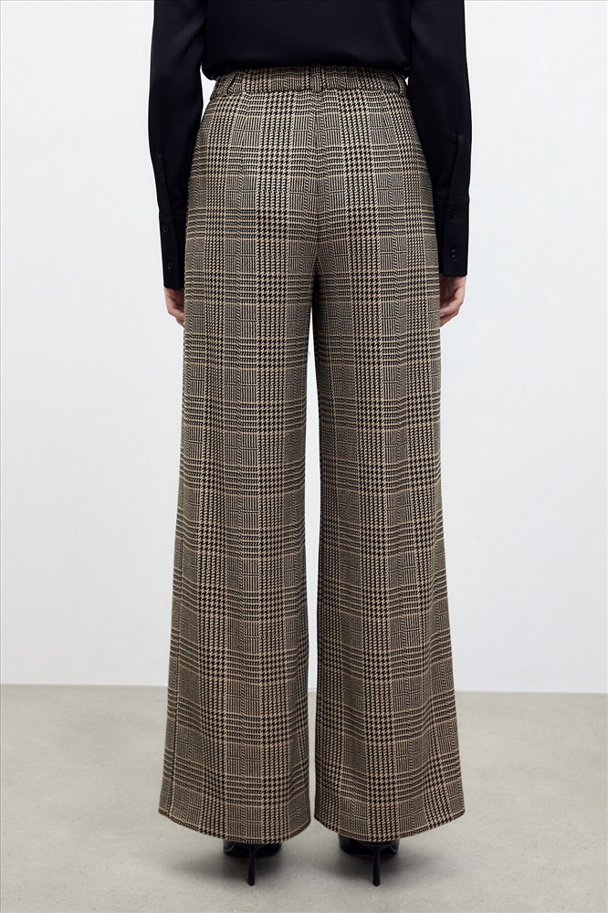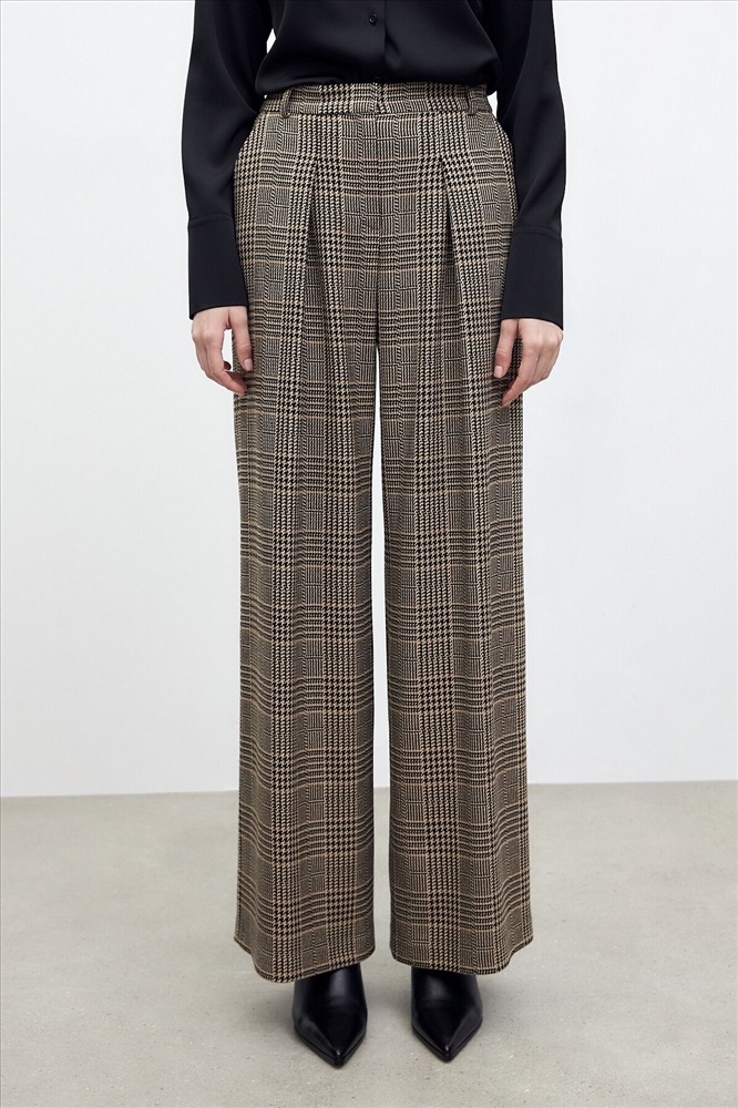Прямые широкие брюки со складками на высокой посадке с притачным поясом. Брюки выполнены из костюмной ткани в бежево - черную клетку. Имеют два функциональных кармана по бокам.