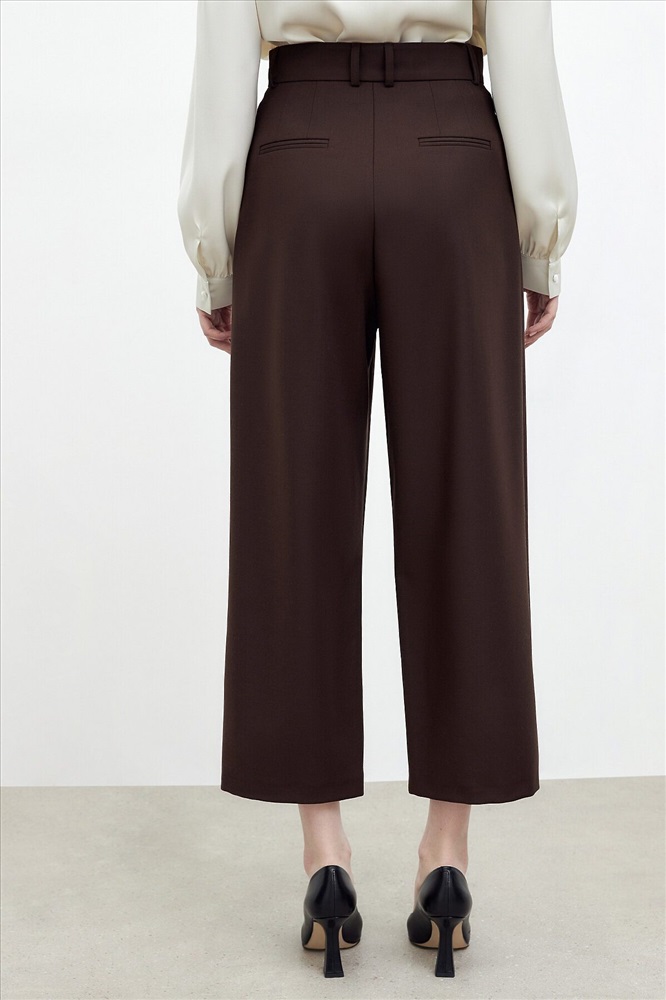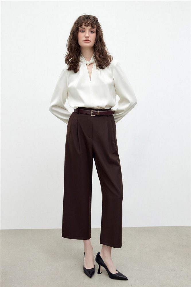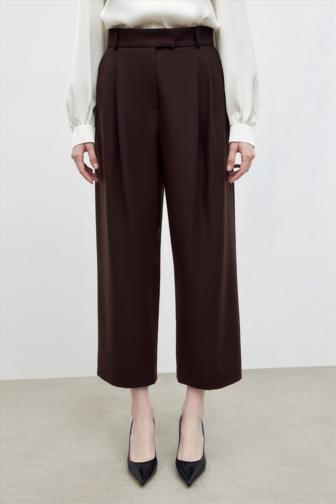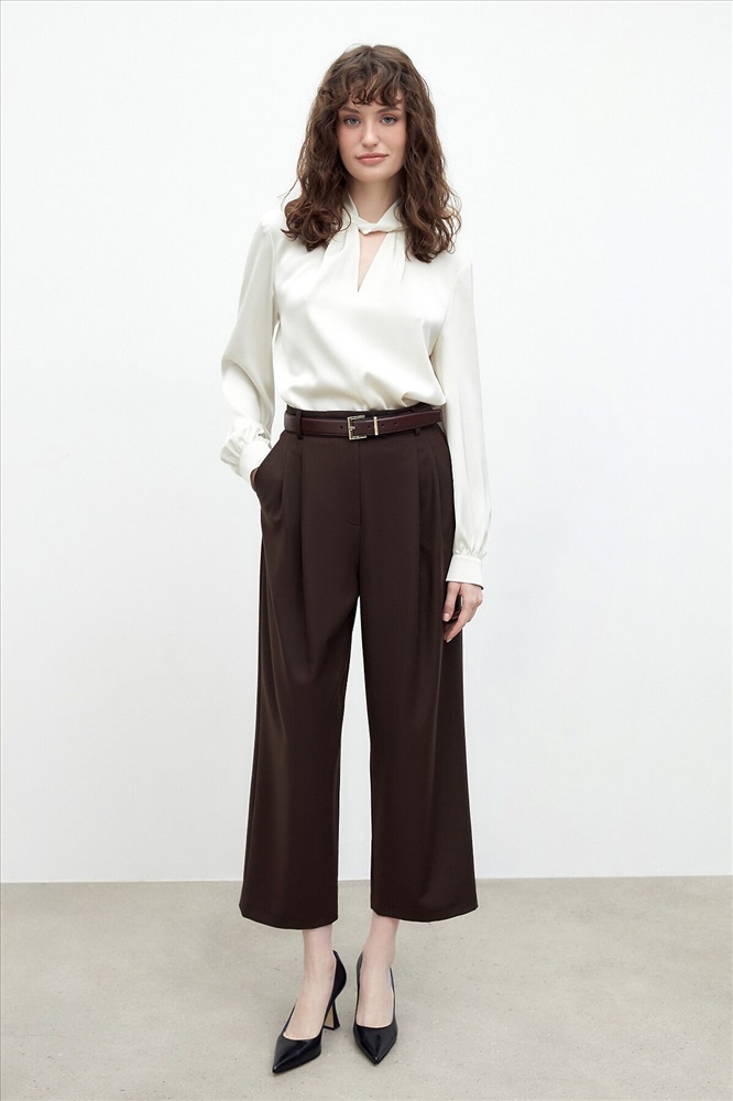 Широкие брюки со складками из костюмной ткани со складками с широким приточным поясом и шлевками. Брюки с рабочими карманами по бокам. Застежка спереди на молнию, пуговицу и крючок.