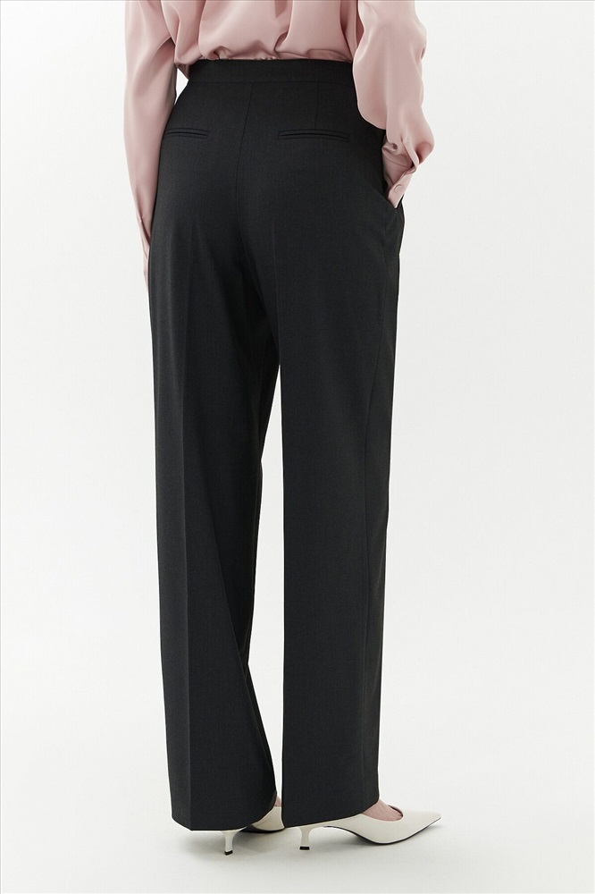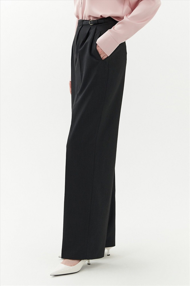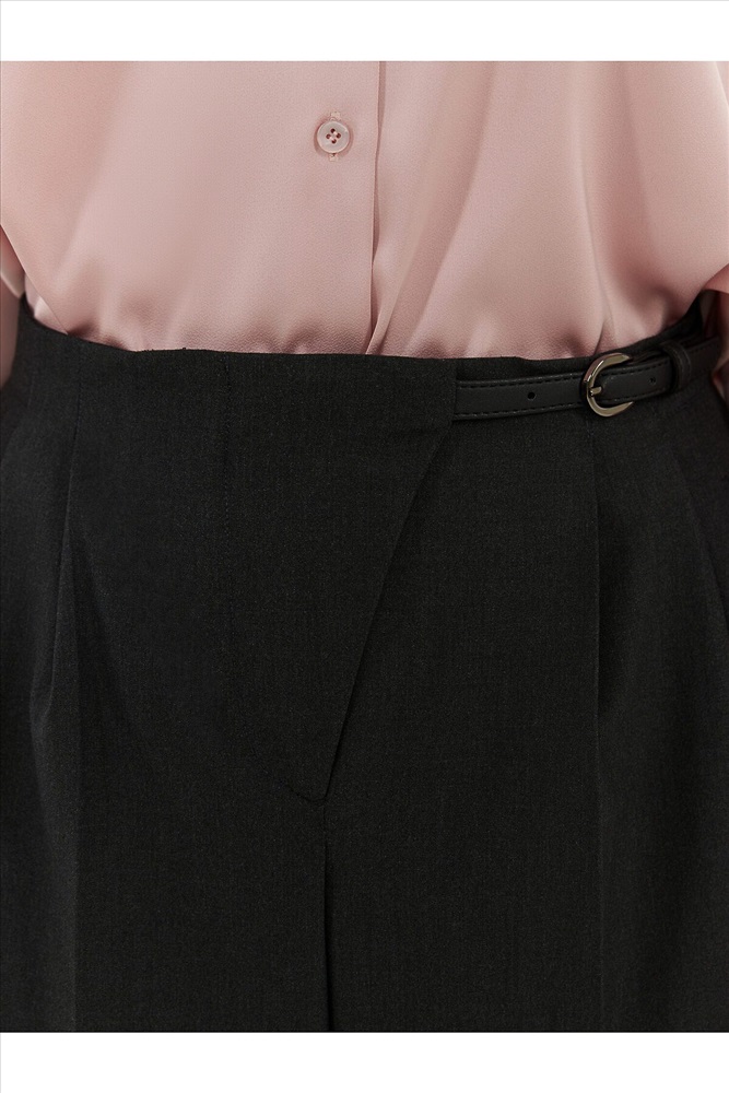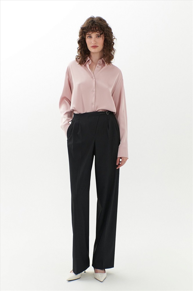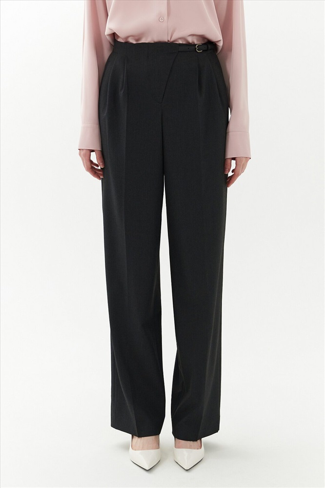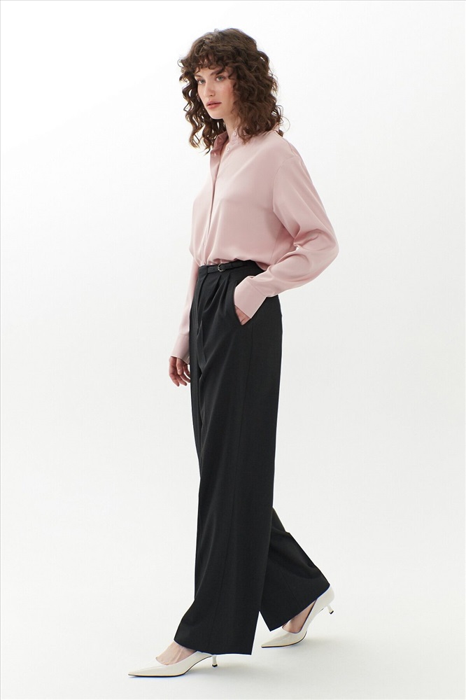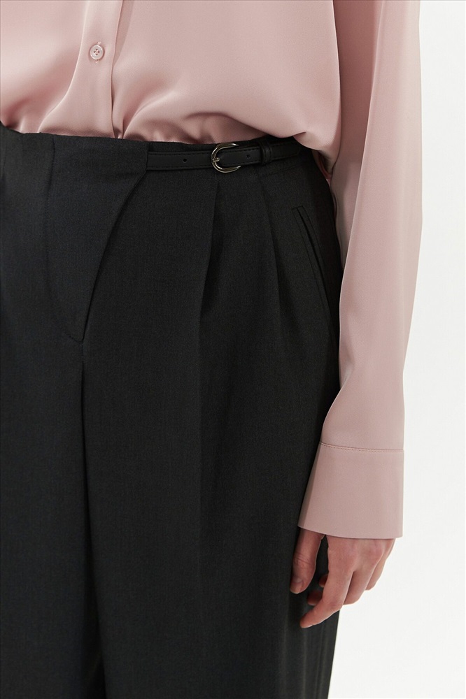 Широкие брюки на средней посадке с ассиметричным гульфиком и складками. На поясе есть хлястик который соединяет гульфик и боковой шов пояса. Карманы прорезные листочки. На спинке два прорезных кармана.