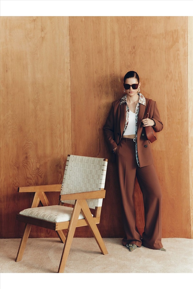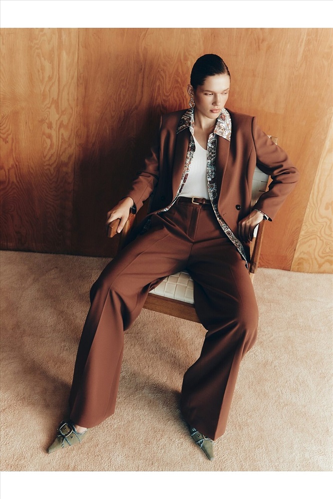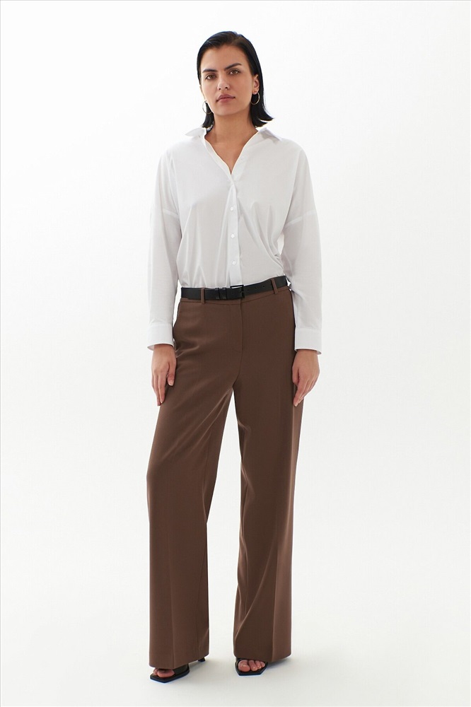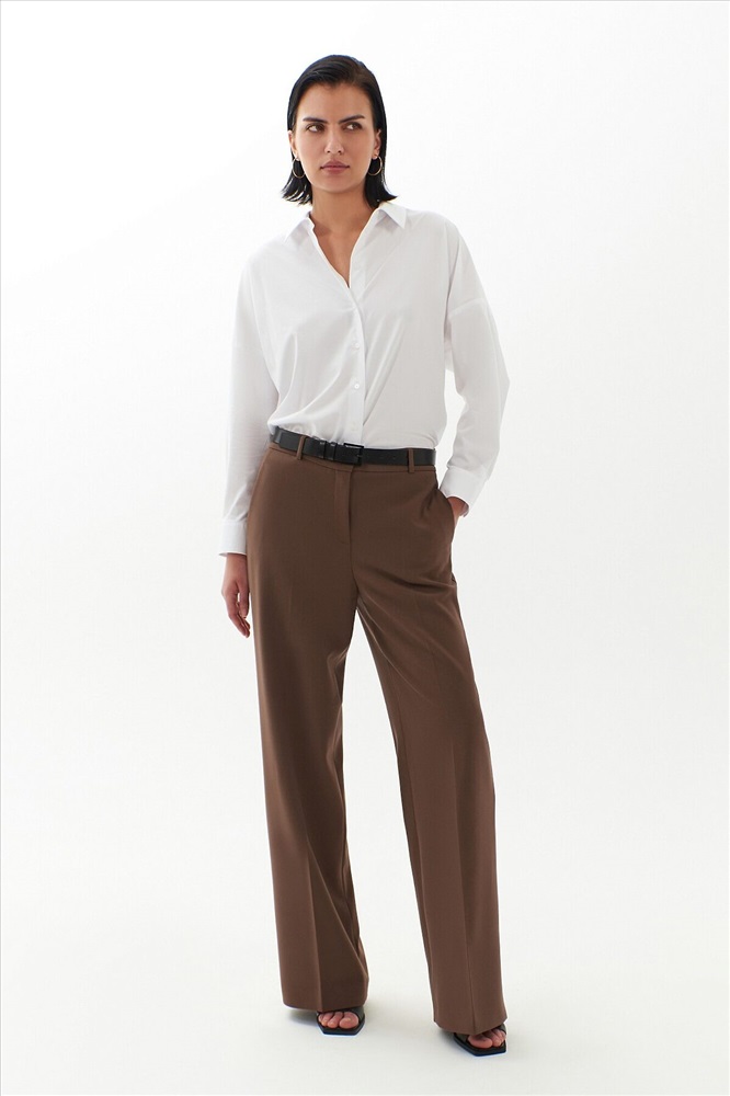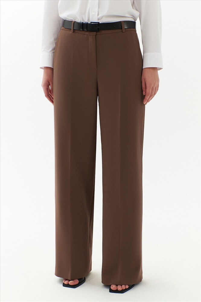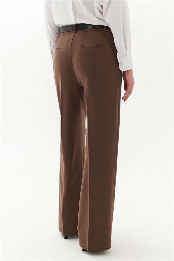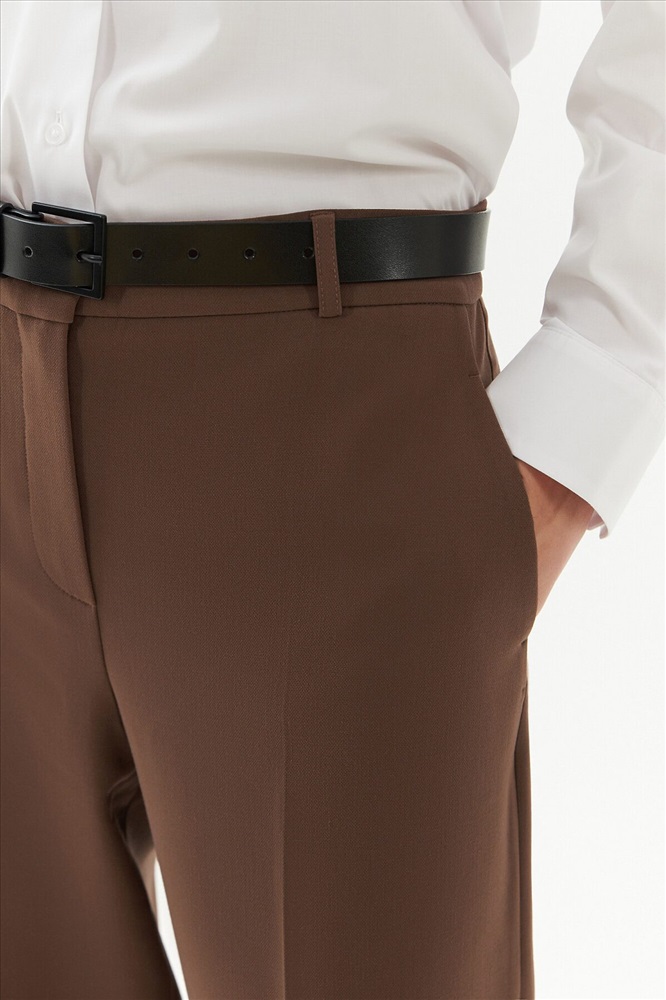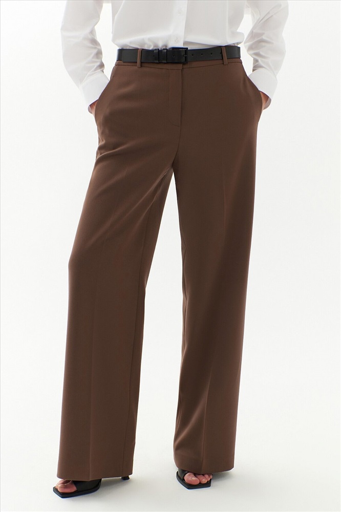 Брюки прямые на высокой посадке немного расклешенные к низу, на притачном поясе со шлевками и стрелками, из костюмной вискозной ткани в цвете "каштан". Спереди рабочие боковые карманы.