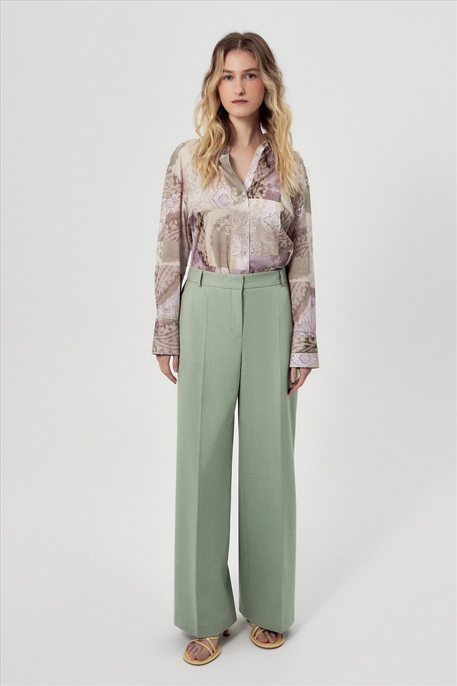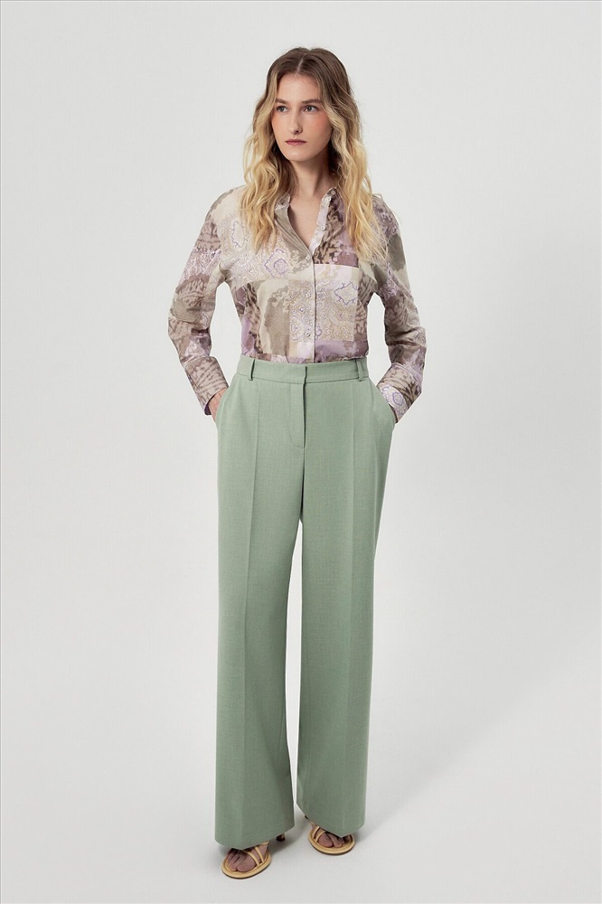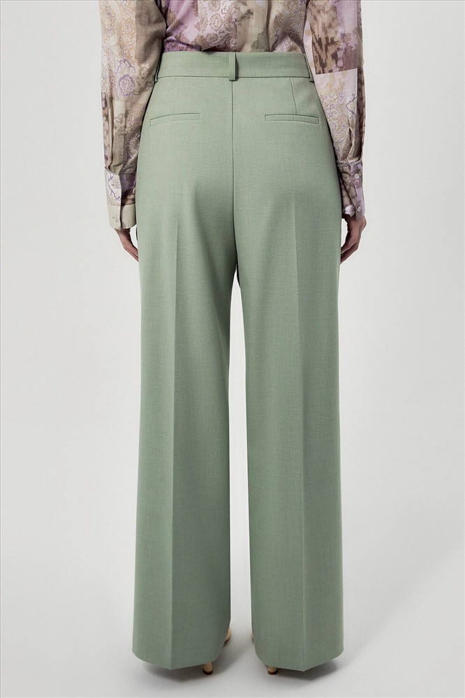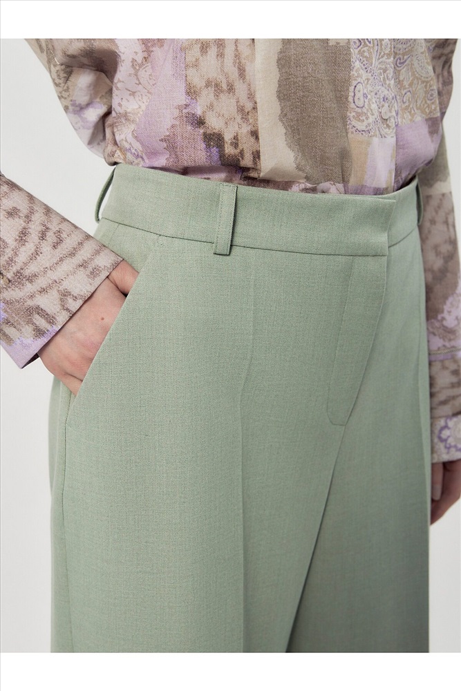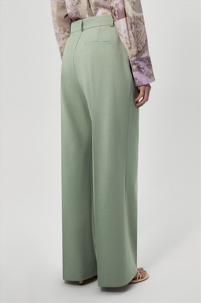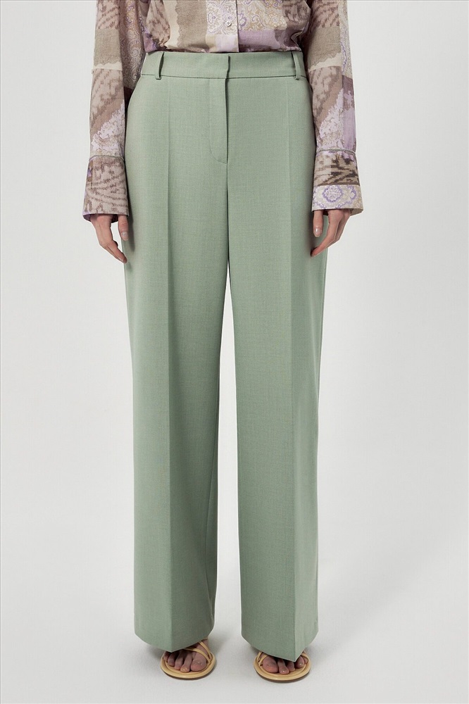 Брюки со стрелками прямого силуэта из костюмной ткани в цвете зеленая дымка на притачном поясе со шлевками. Застежка спереди на молнию, брючный крючок и пуговицу. На задней части брюк два прорезных кармана.