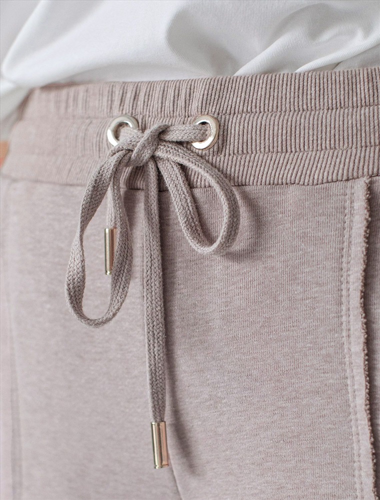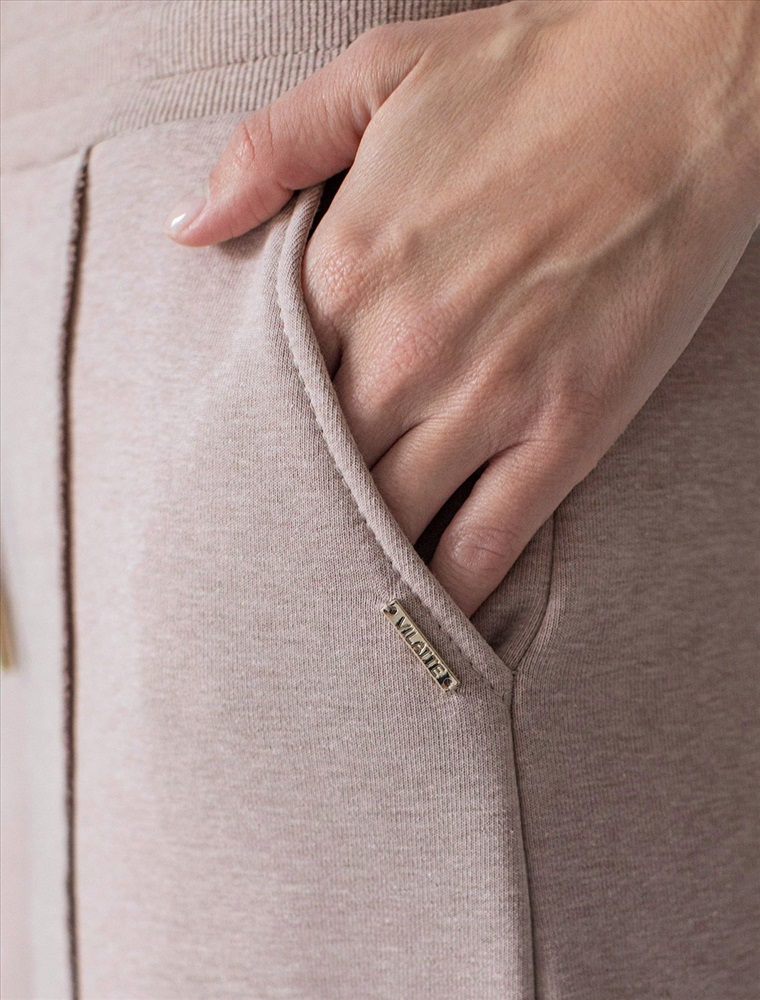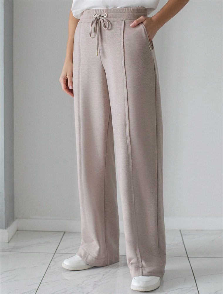 Брюки прямого кроя с удобным эластичным поясом на резинке и карманами по бокам выполнены из премиального футера-двухнитки. Наличие эластана в составе гарантирует комфорт и долговечность изделия, материал хорошо пропускает воздух, позволяя телу дышать.. Эти уютные брюки нежного цвета макиато с эффектом меланж созданы для вашего комфорта. Свободный прямой крой обеспечивает свободу движений и максимальное удобство в любых ситуациях, поэтому они подойдут и на большие размеры, а так же на высокий или низкий рост. Фигура подчеркивается, а силуэт визуально вытягивается за счет кроя палаццо и застроченных декоративных стрелок. Вы можете создать стильный образ на каждый день в сочетании с джемпером D49.139 и бомбером D49.141. В повседневных трикотажных брюках вы будете чувствовать себя комфортно и уверенно, наслаждаясь каждым моментом дня.