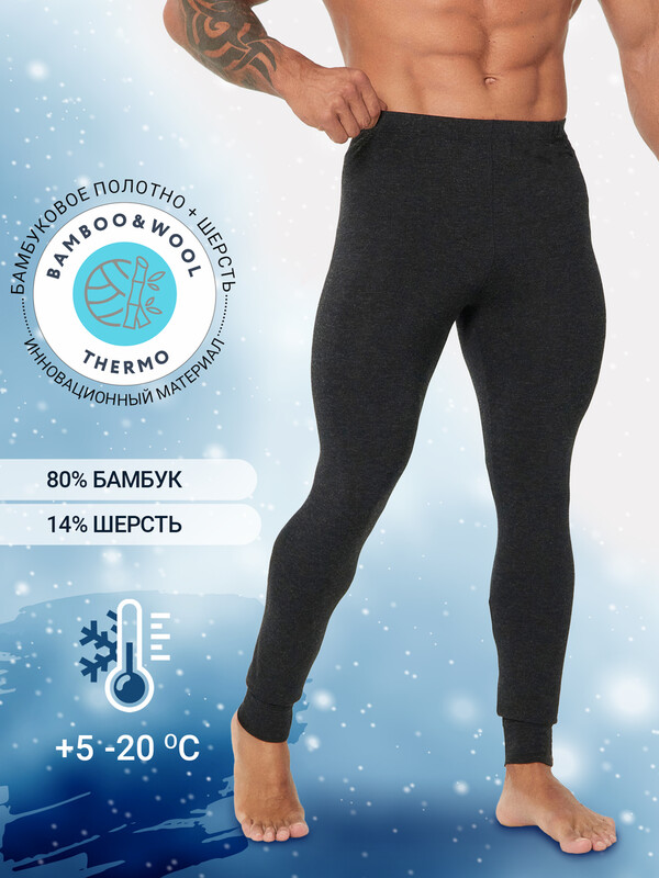 Комфортные мужские брюки из термо-материала. Силуэт облегающий по всей длине. Модель без боковых швов, с мягкой эластичной тесьмой в поясе и плоскими швами. Специальное трикотажное полотно, состоящее из натурального бамбукового волокна, шерсти и эластана, дарит изделию особые гигиенические и термические свойства. Незаменимая деталь гардероба для прохладного времени года, охоты и рыбалки, активного отдыха и спорта. Рекомендуемый температурный режим: от +5 до -20 градусов Цельсия.