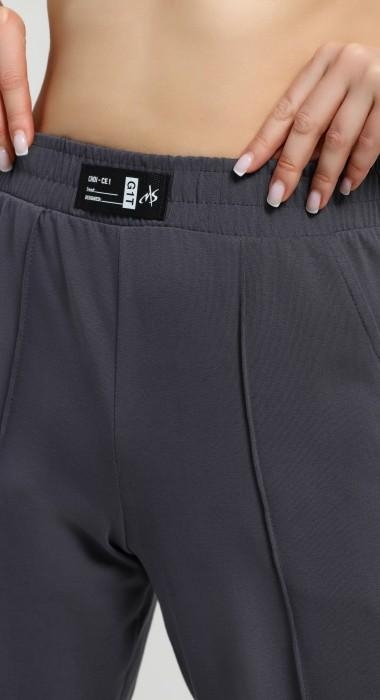Брюки – из гладкокрашеного трикотажного полотна "кулирка с лайкрой"длинные, классического кроя, на притачном поясе с эластичной тесьмой внутри и карманами в боковых швах. Передние половины брюк застрочены по центральным линиям. По центру пояса настрочен декоративный элемент Комментарии к товару