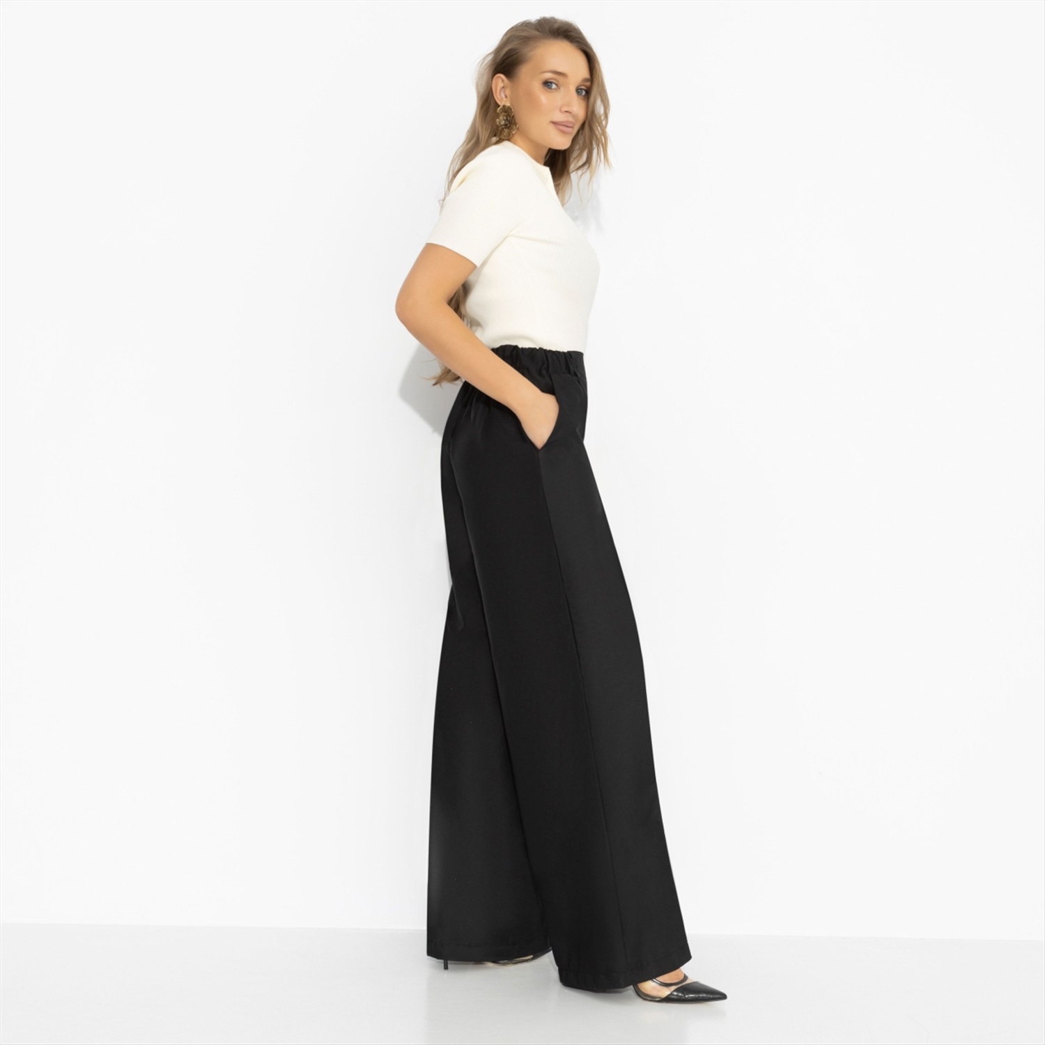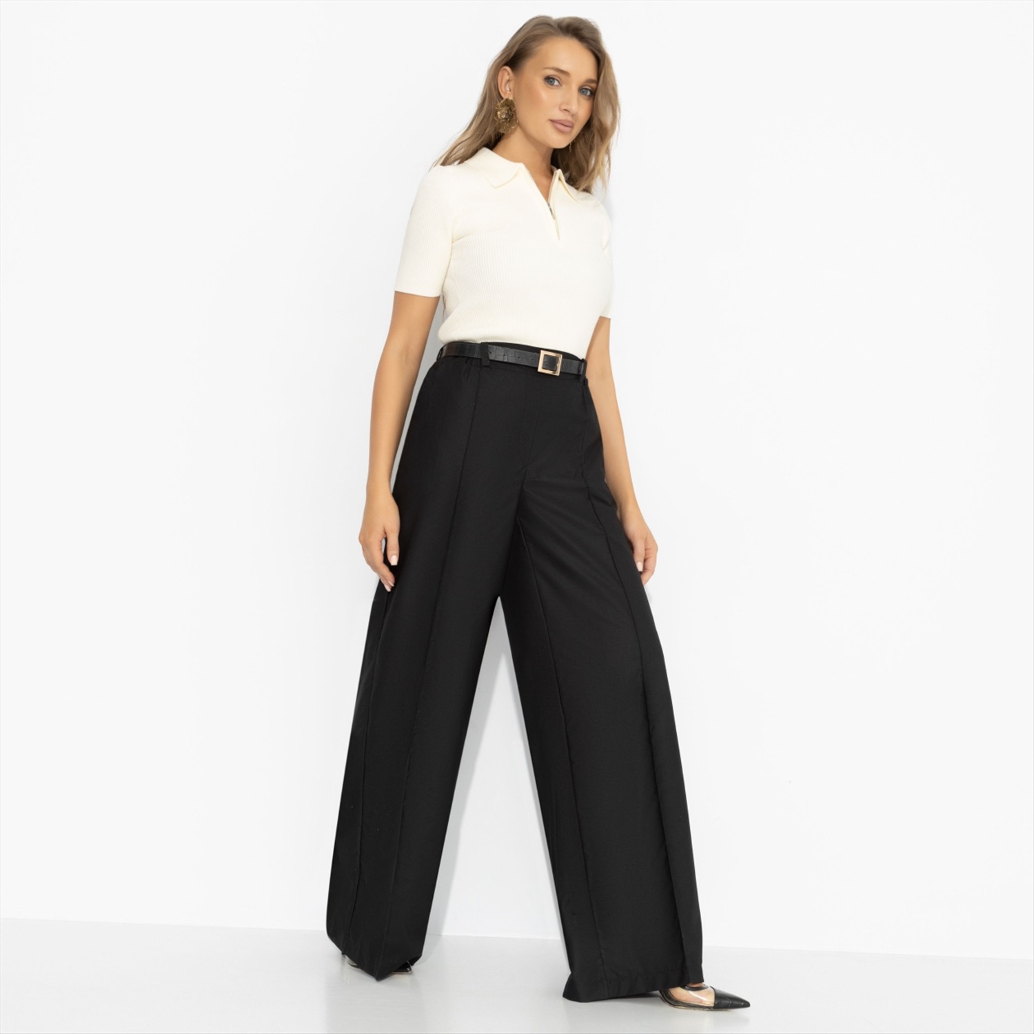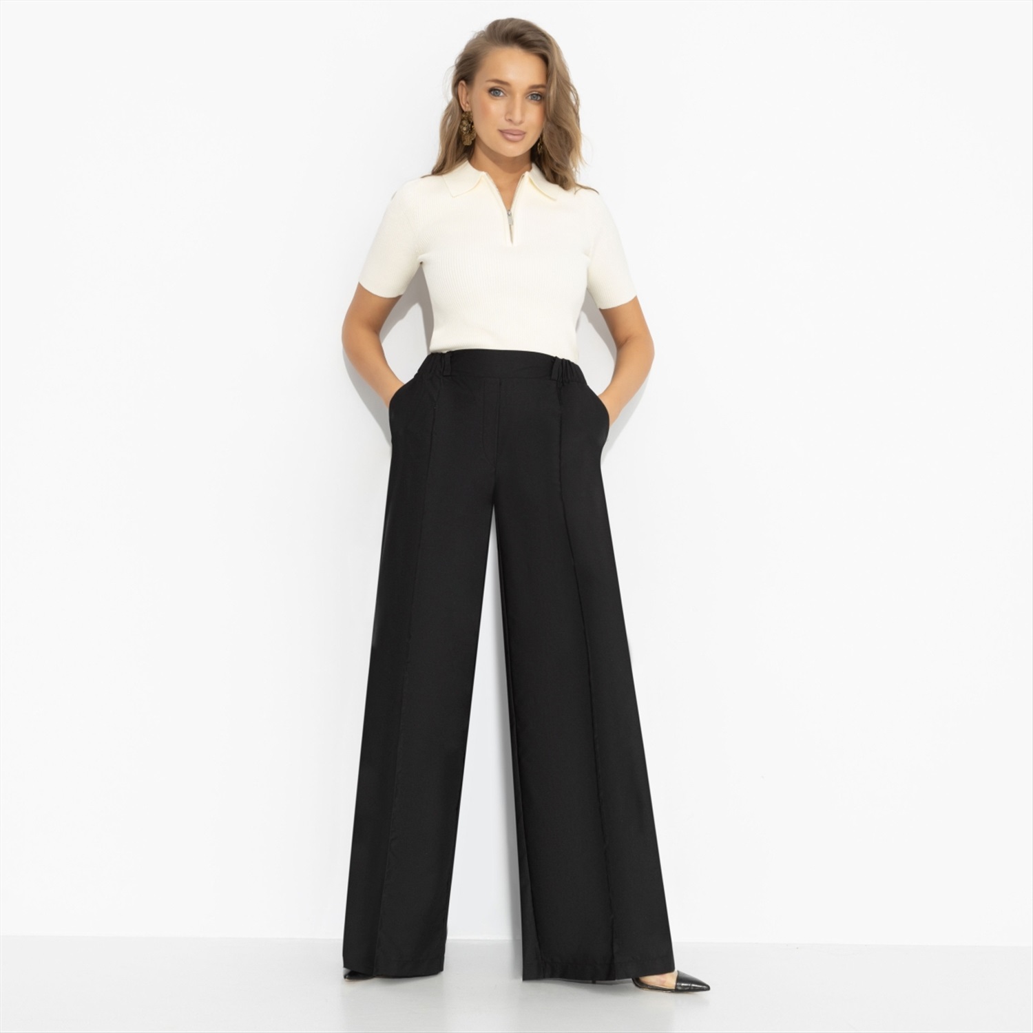 Я: ничего не хочу. Также я: хочу, чтобы всё было по-моему. Чёрные брюки от ЧАРУТТИ идеально поддерживают любое твое настроение. Высокая посадка подчёркивает талию, широкий крой и вертикальная стрелка вытягивают силуэт и задают тот самый уверенный шаг. Минимализм без лишних слов – зато с вау-эффектом, который считывается сразу. Брюки с карманами на резинке. Ткань с лёгким блеском. Комментарии к товару