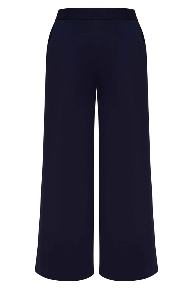 Элегантные брюки-палаццо для девочки из трикотажного полотна с повышенной износостойкостью классического темно-синего цвета, расклешённого силуэта, на поясе с еврорезинкой. Дополнены боковыми карманами. Брюки будут прекрасным дополнением к моделям из школьной коллекций SMENA, отличный вариант на каждый день.