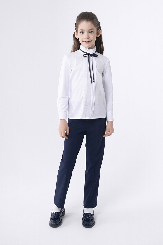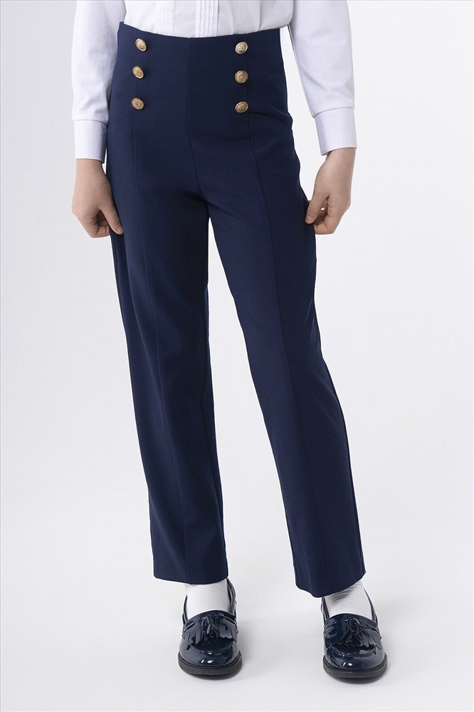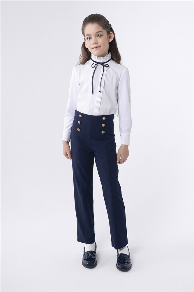 Прямые брюки для девочек изготовлены из немнущейся костюмной ткани высокого качества, которая идеально подходит для брюк данного фасона. Высокая талия и пояс на резинке не стесняют движений. Брюки имеют карманы достаточной глубины. Брюки элегантно смотрятся на девочках любого роста. Декорированы металлическими пуговицами.