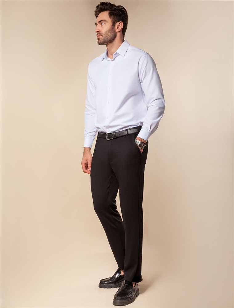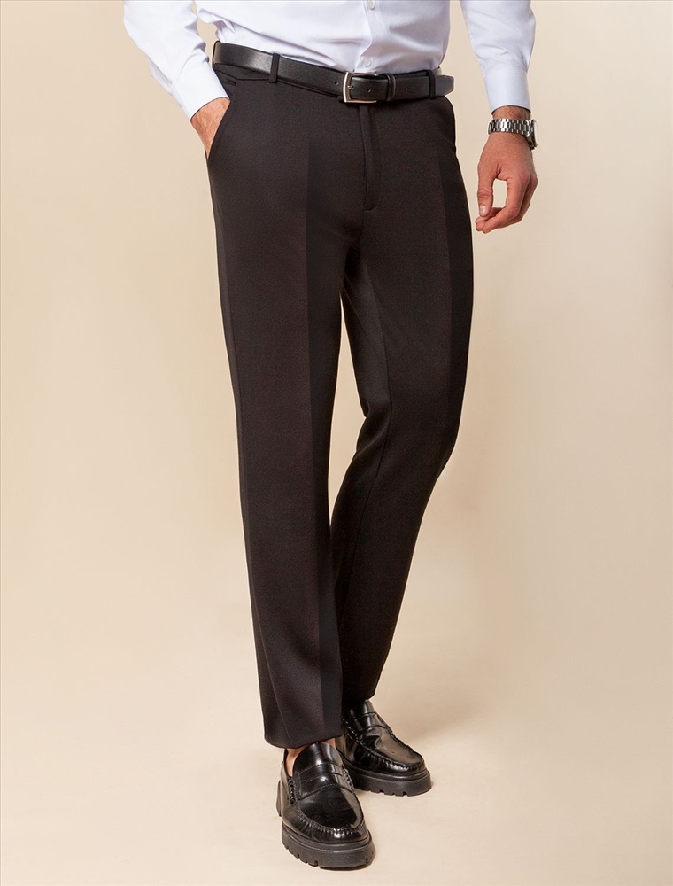 Брюки выполнены из плотного джерси. Модель со стрелками из трикотажа хорошая альтернатива классическим брюкам из костюмной ткани. Эластичный материал не сковывает движений и очень формоустойчив. Для большего удобства пояс дополнен резинкой сзади. Сочетается с любым верхом, в зависимости от выбранной обуви, можно создавать деловой стиль или более расслабленный, повседневный.