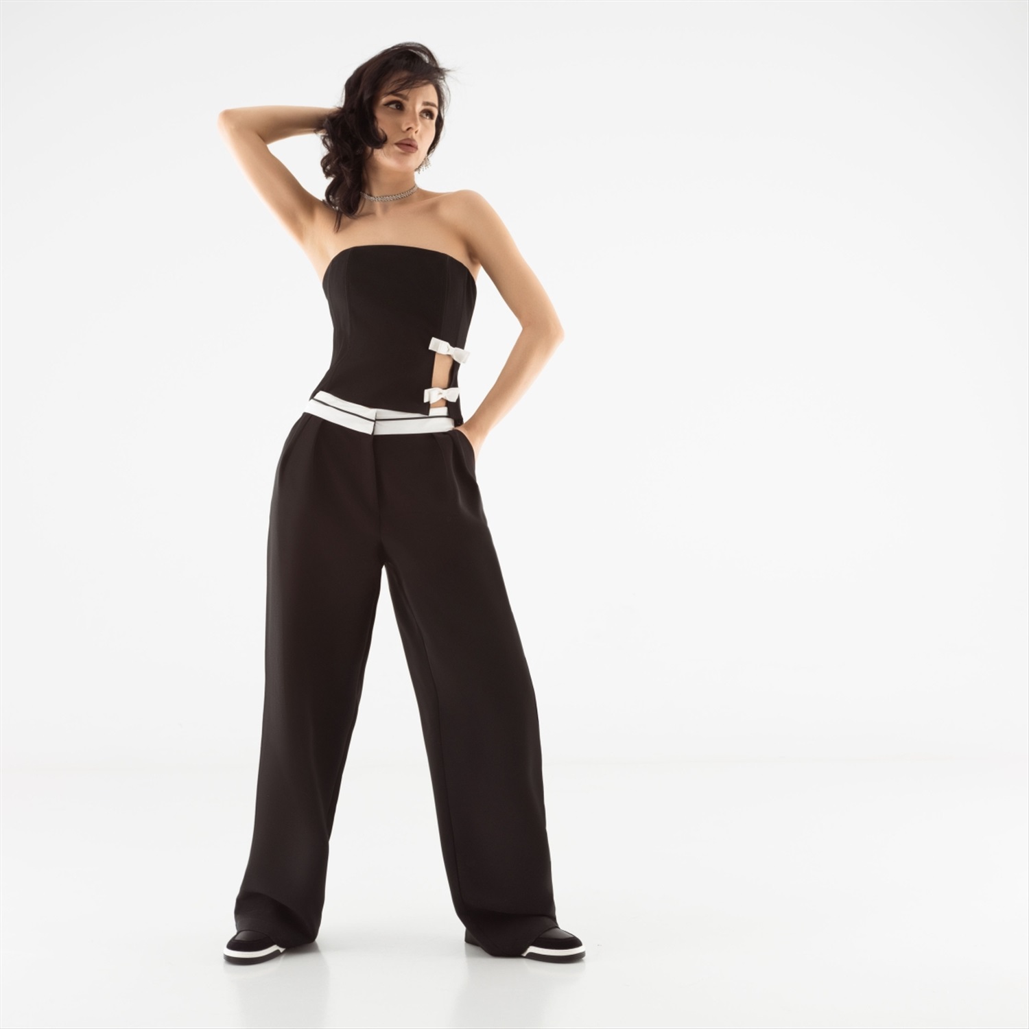 Состав: «Барби» (60% п/э, 37% вискоза, 3% спандекс) Плотность ткани: Средняя Тип ткани: Текстиль Вид застежки: Пуговица/-ы, молния Дополнительный цвет ткани: Белый Карманы: В боковом шве Основной цвет ткани: Черный Отрезная талия: Нет Подклад: Нет Резинка по талии: Нет Рисунок/раппорт: Нет, все изделия идентичны Сезон: Круглогодичный Силуэт: Свободный Стиль: Классический Фасон брюк: Классические Фасон брюк: Классические Параметры модели на фото: