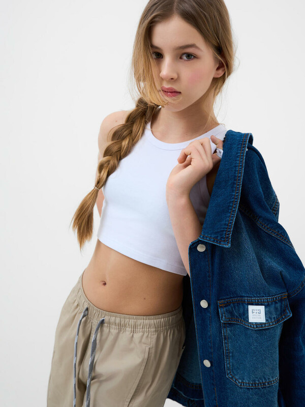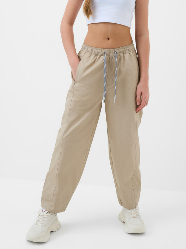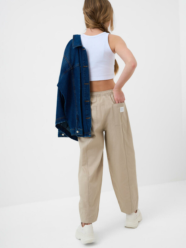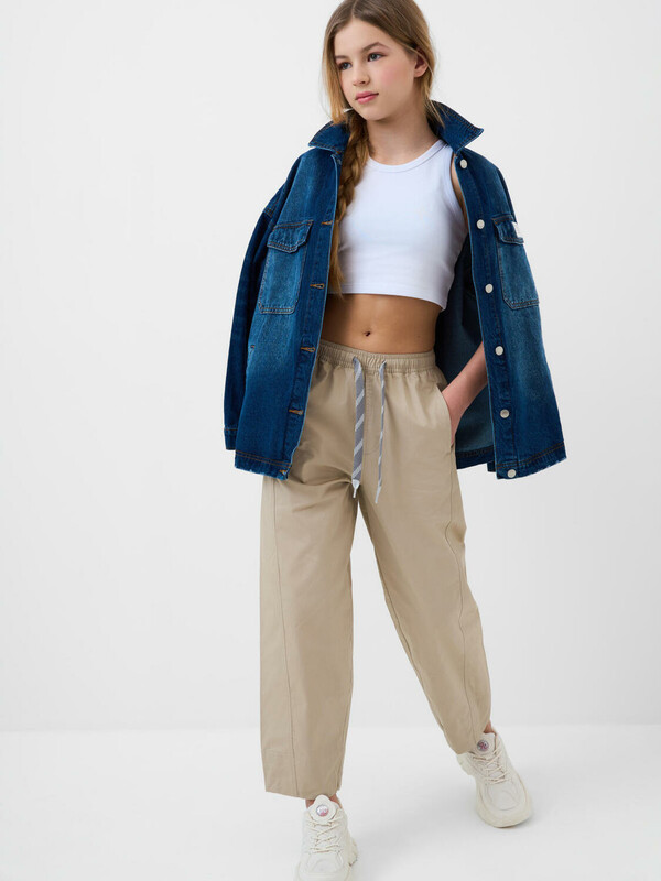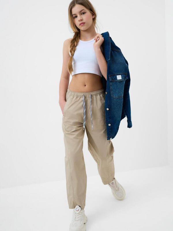 Брюки для девочки подростка. Модель из легкого, хлопкового текстиля. Свободный, прямой крой со средней посадкой. Пояс на резинке дополнен шнуром для регулировки. Спереди и сзади — удобные карманы. Украшены небольшим резиновым лейблом.