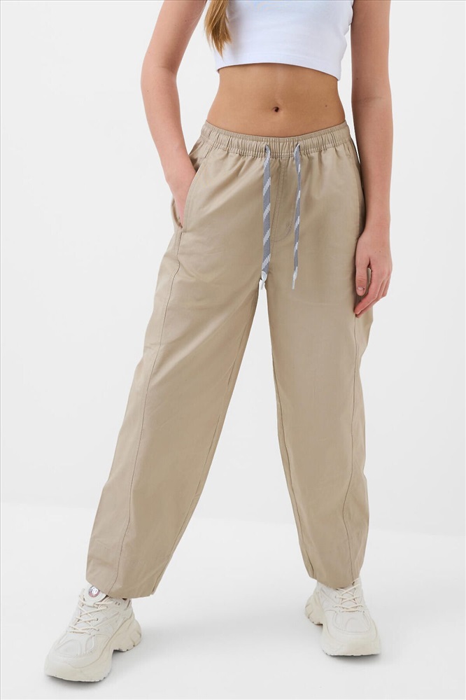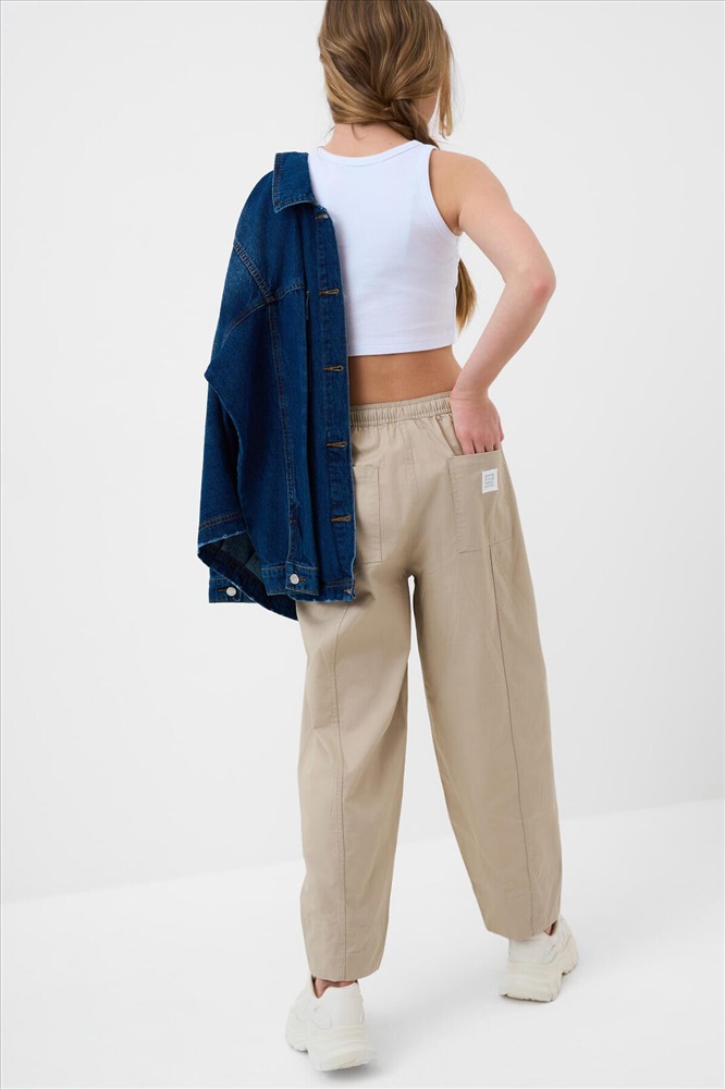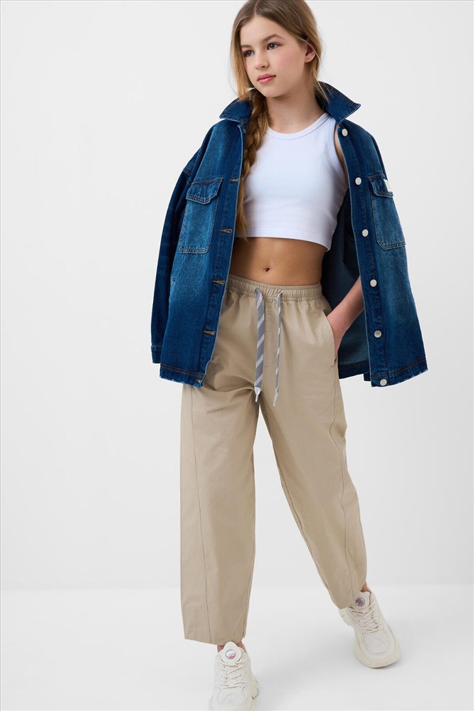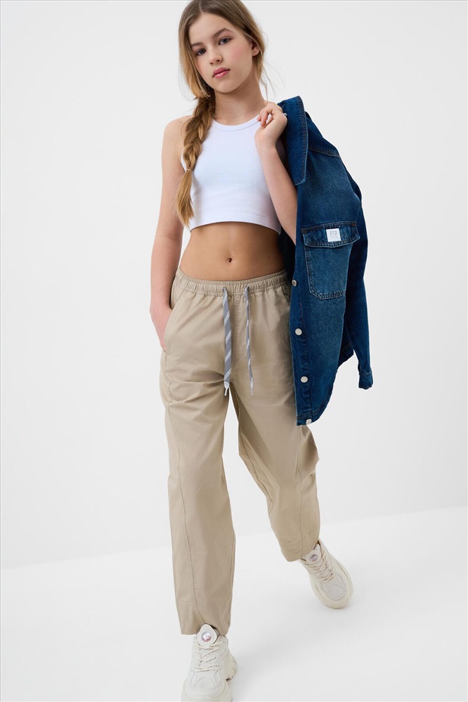 Брюки для девочки подростка. Модель из легкого, хлопкового текстиля. Свободный, прямой крой со средней посадкой. Пояс на резинке дополнен шнуром для регулировки. Спереди и сзади — удобные карманы. Украшены небольшим резиновым лейблом.