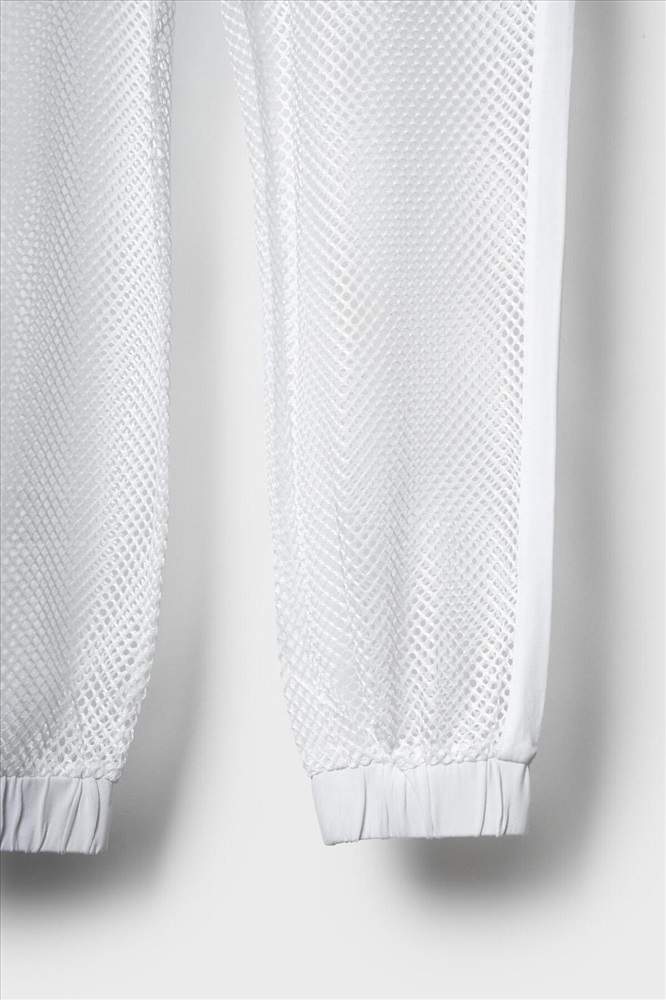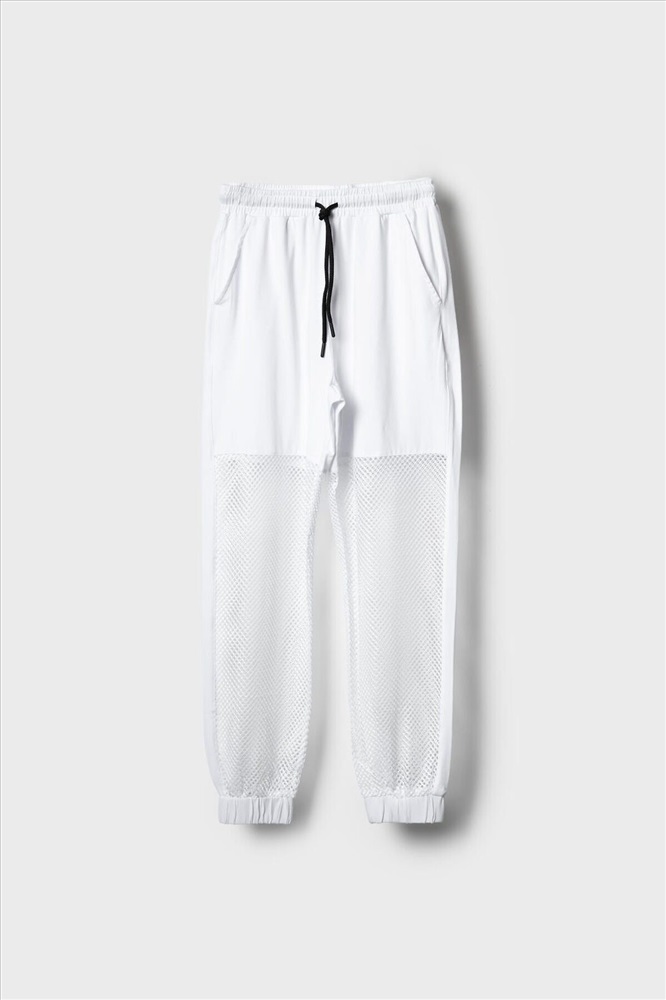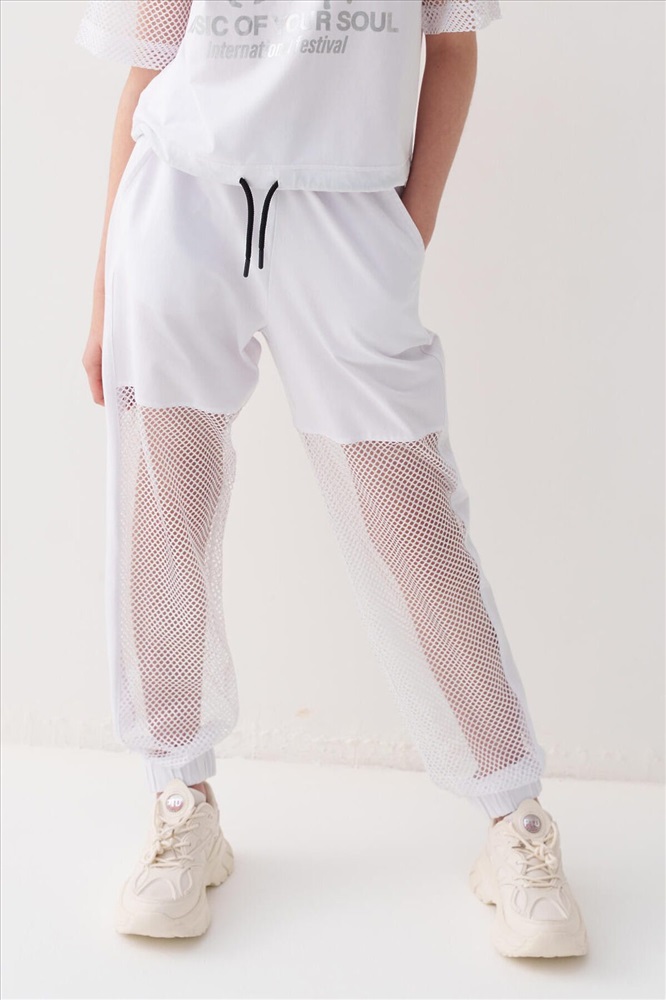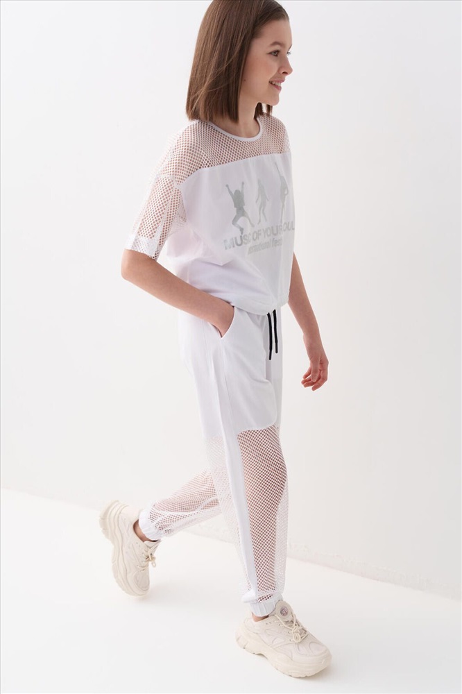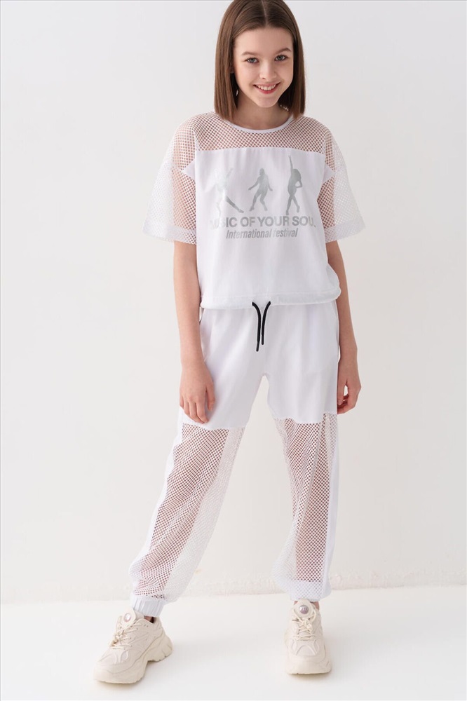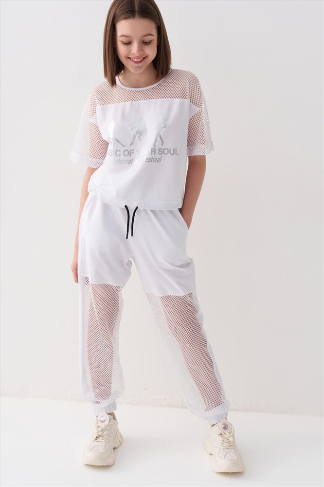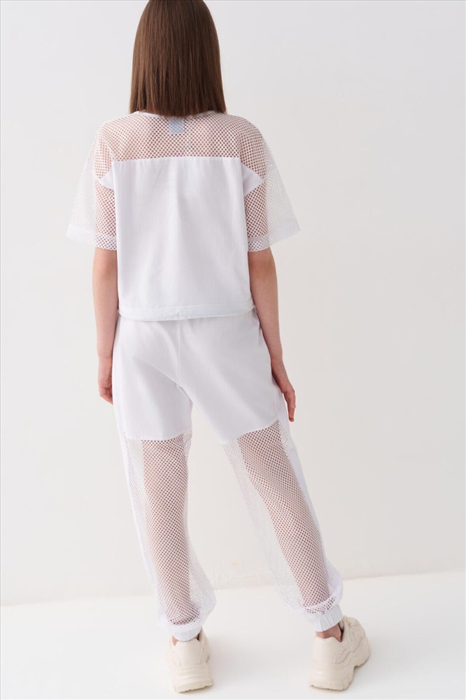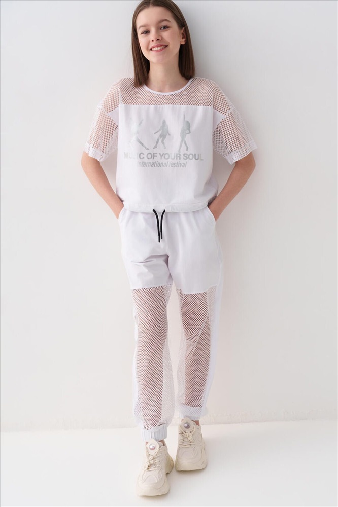 ID товара: 1240211 Состав: Ткань 1- 100% полиэстер, Ткань 2- 95% хлопок, 5% эластан Сезон: Весна/Лето Стильные брюки для девочки подростка. Верхняя часть выполнена из плотного хлопкового трикотажа, а нижняя — из легкой прозрачной сетки, создающей модный контраст и эффект "двойного слоя". Брюки имеют эластичный пояс со шнурком и удобные боковые карманы. Низ брючин собран на резинку, благодаря чему брюки хорошо сидят по фигуре. По бокам и передней части расположены лампасы, добавляющие спортивный акцент. Комментарии к товару