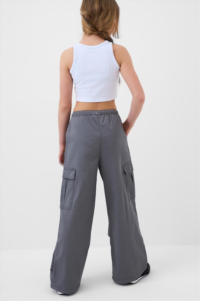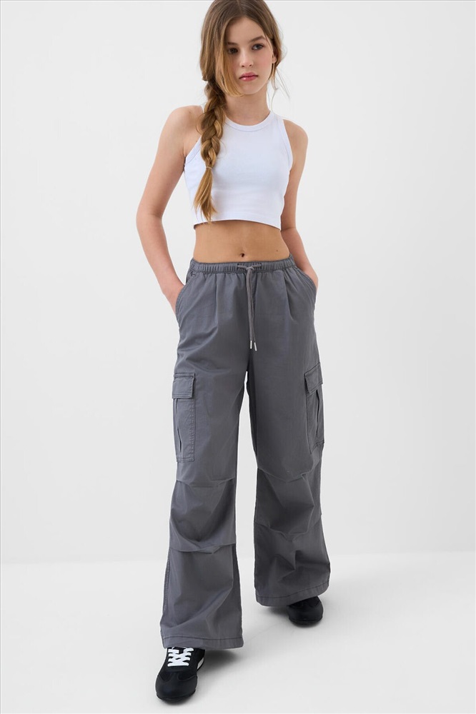 Брюки карго для девочки подростка. Выполнены из плотного хлопкового твилла. Модель имеет заниженную посадку и свободный крой с утяжками внизу, которые позволяют регулировать ширину брючин. Пояс на резинке с дополнительной регулировкой шнуром. На бедрах расположены накладные карманы на липучке, а также боковые карманы.