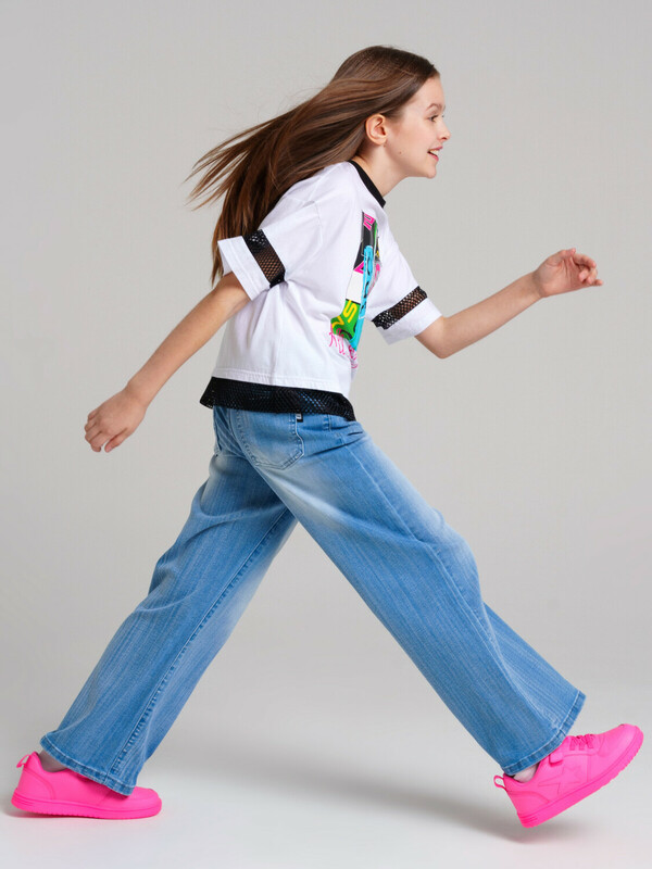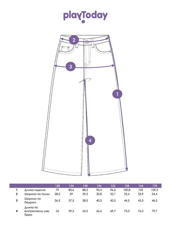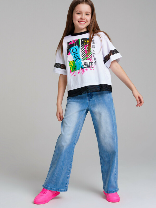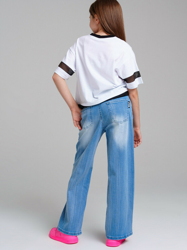 Производитель: PlayToday Джинсы для девочки. Застежка на пуговицу, пояс с внутренней утяжкой. Крой Wide leg ― это свободная посадка и расклёшенные от бедра штанины. Высокая посадка.