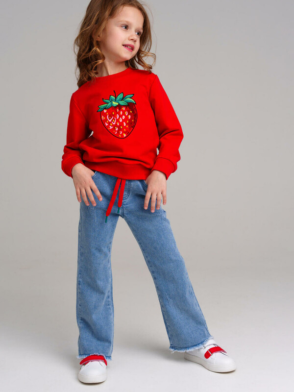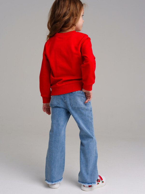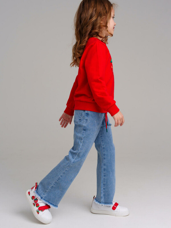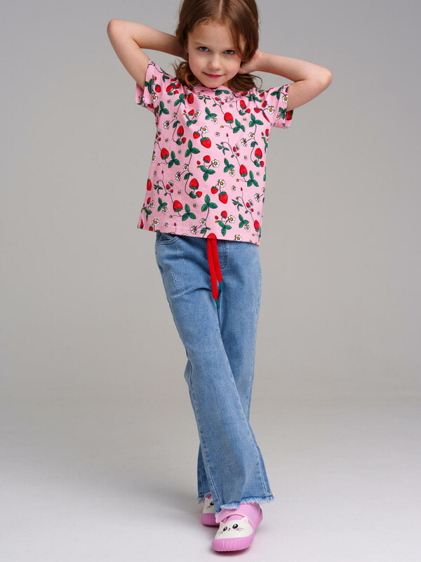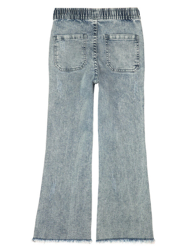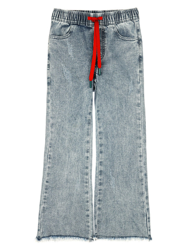 Производитель: PlayToday Джинсы для девочки с эффектом потертости. Пояс на резинке со шнурком. Посадка flare fit - облегают талию и бёдра, а от колена расширяются книзу. Высокая посадка.