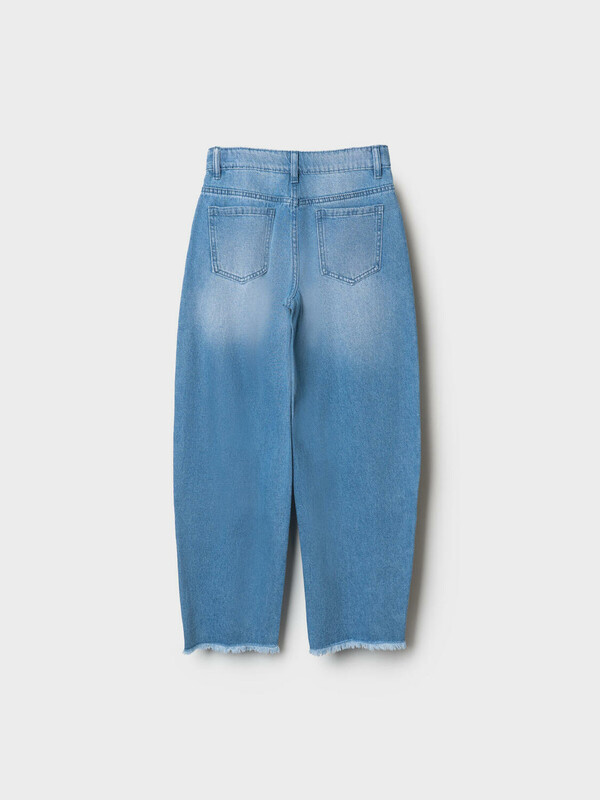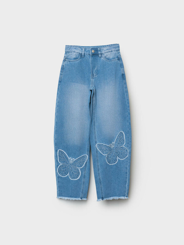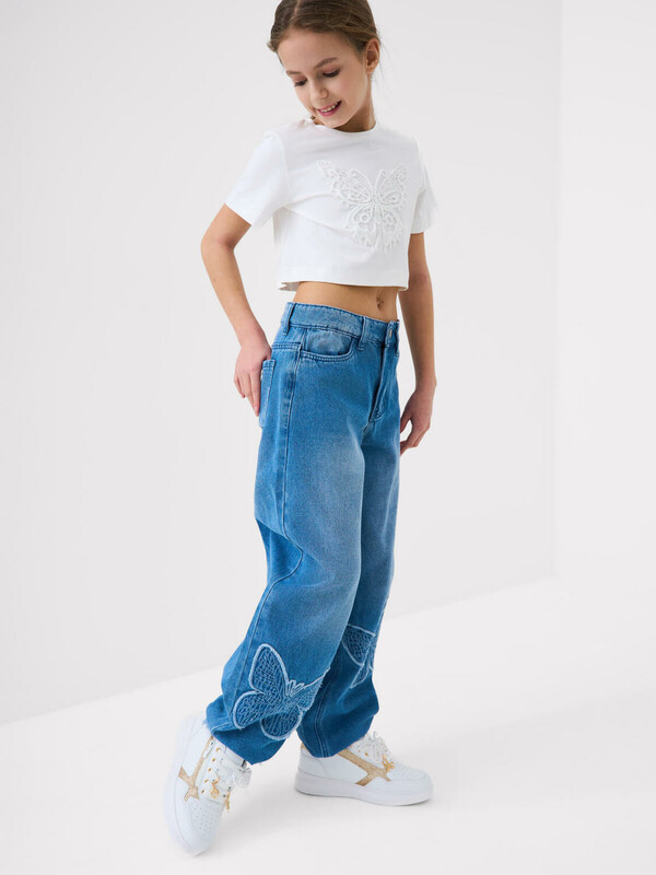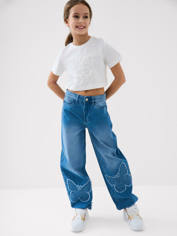 Джинсы багги для девочки подростка. Широкие джинсы из светло-синего денима с оригинальной посадкой: свободные по бедрам и немного зауженные к щиколотке. Спереди — два боковых кармана, сзади — два накладных. Застежка — на молнию и болт. По талии предусмотрен регулируемый внутренний пояс на резинке. Эффектные декоративные бабочки, выполненные в виде объемной вышивки с вырезанными краями, расположены на коленях.