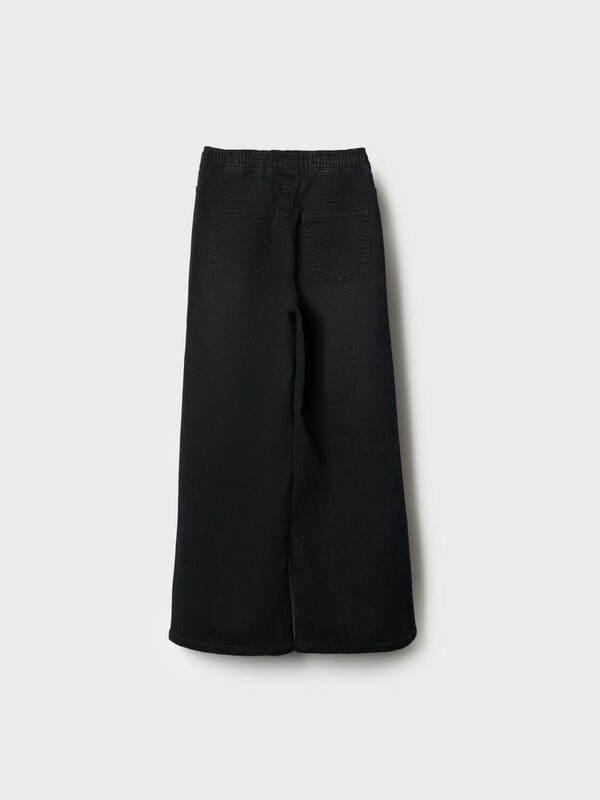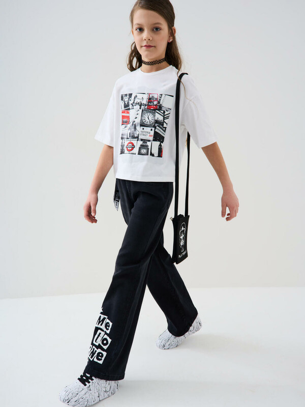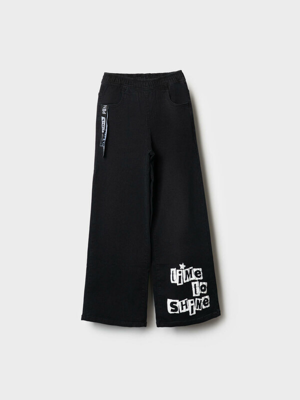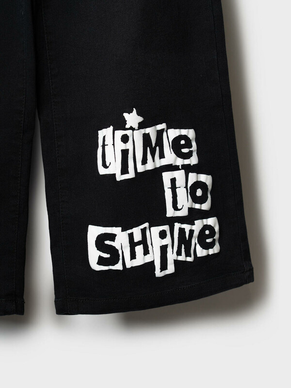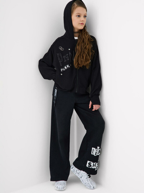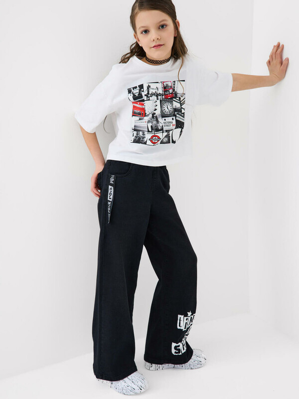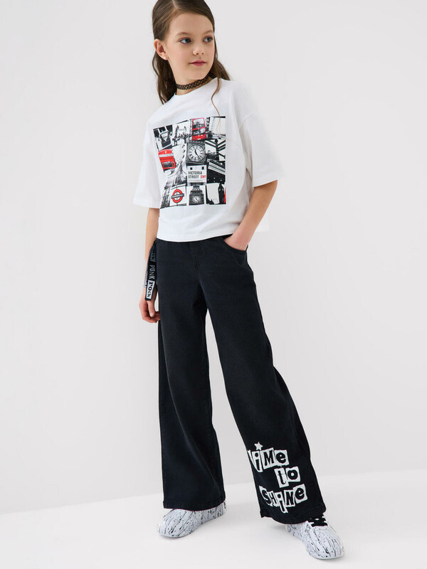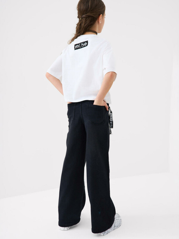 Стильные широкие джинсы для девочки подростка. Пояс на резинке со шнурком делает посадку комфортной и регулируемой. Модель wide leg из черного денима с модным эффектом выварки. У них прямой силуэт и длина до щиколотки. Спереди боковые карманы, а сзади — накладные карманы. На левой штанине — яркий принт, а с боку пояса — декоративные ленты.