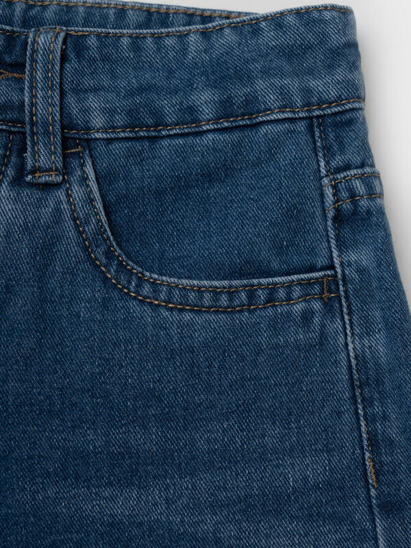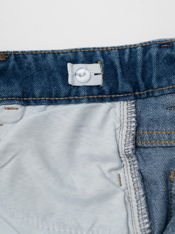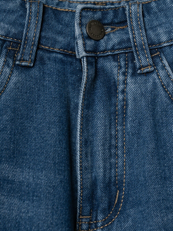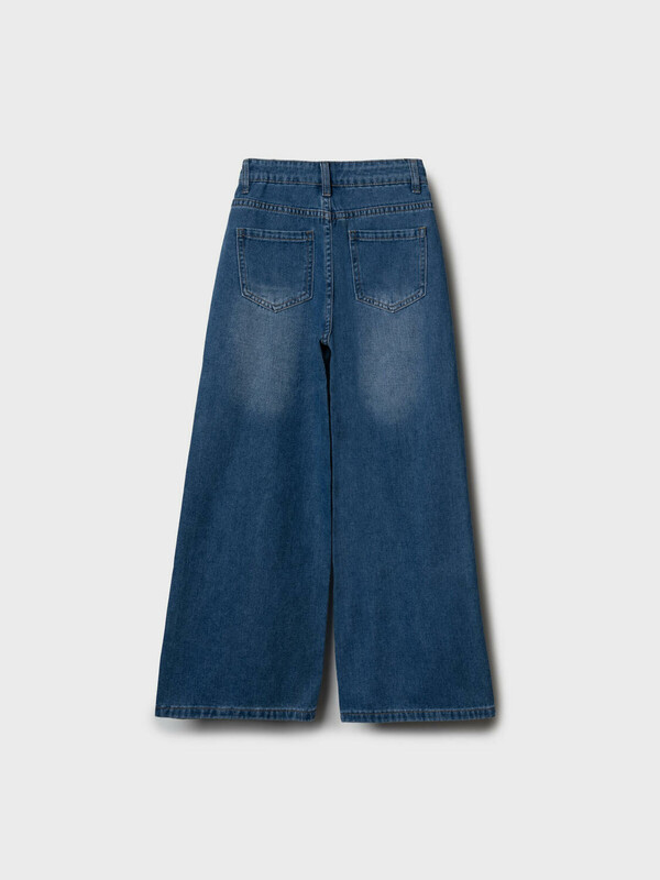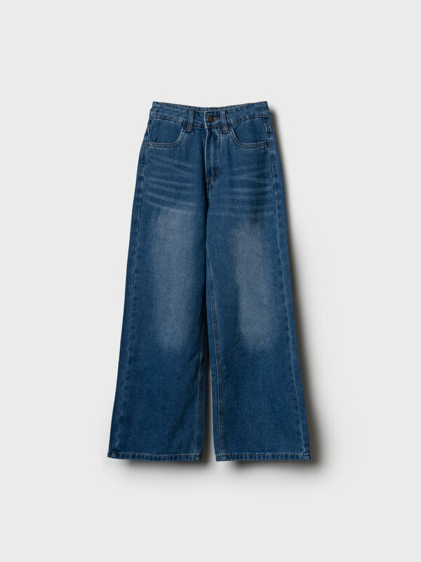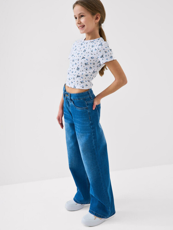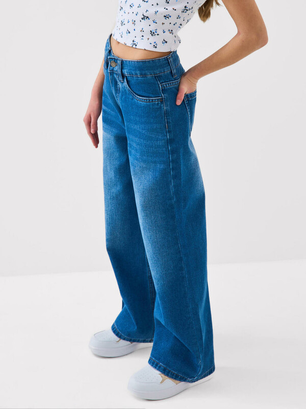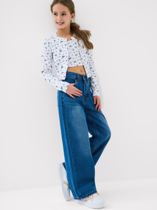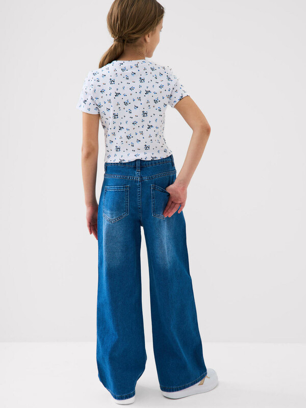Джинсы свободные для девочки подростка. Модель с высокой посадкой и широкими прямыми штанинами. Застежка — молния и болт. Пояс частично на резинке сзади и регулируется изнутри с помощью пуговиц. Модель выполнена из синего денима. Есть передние и задние карманы.