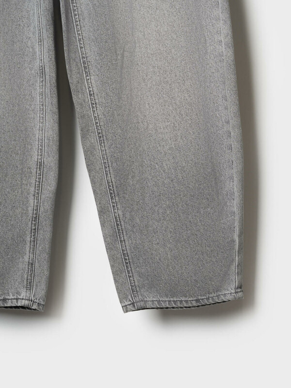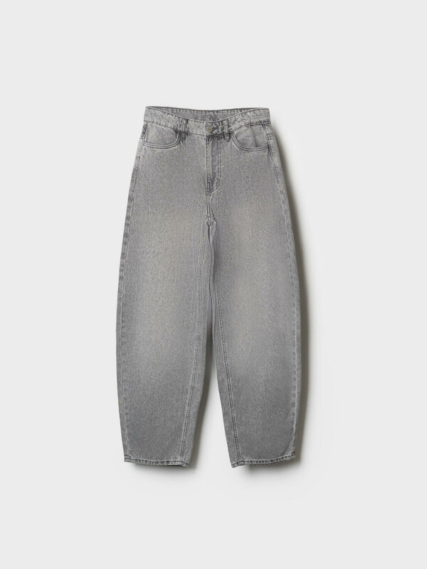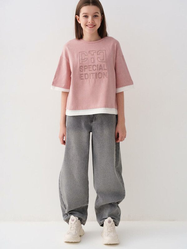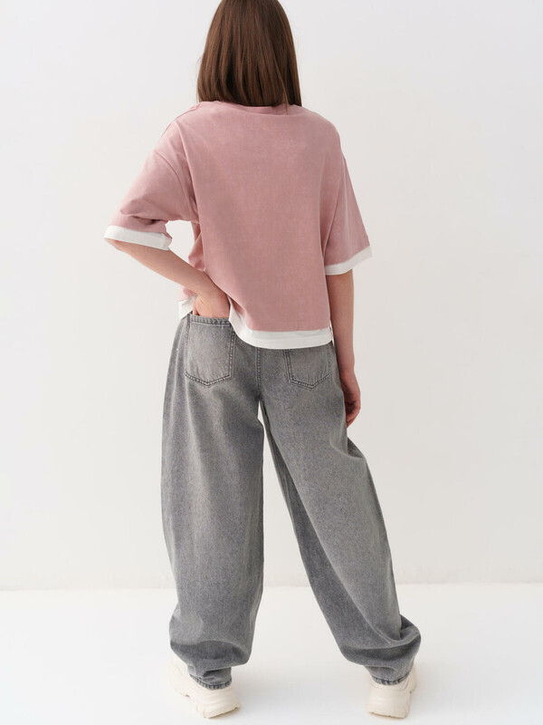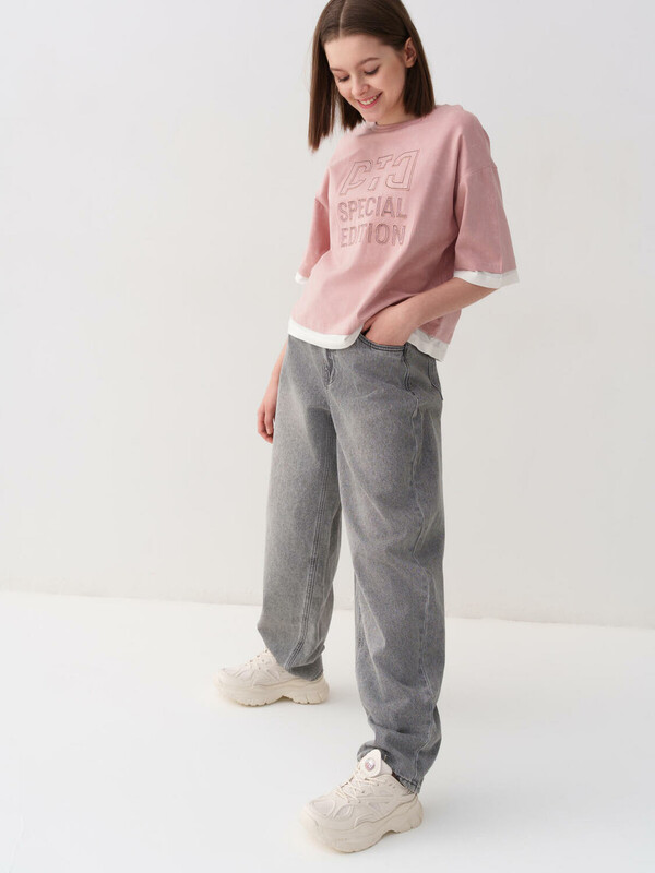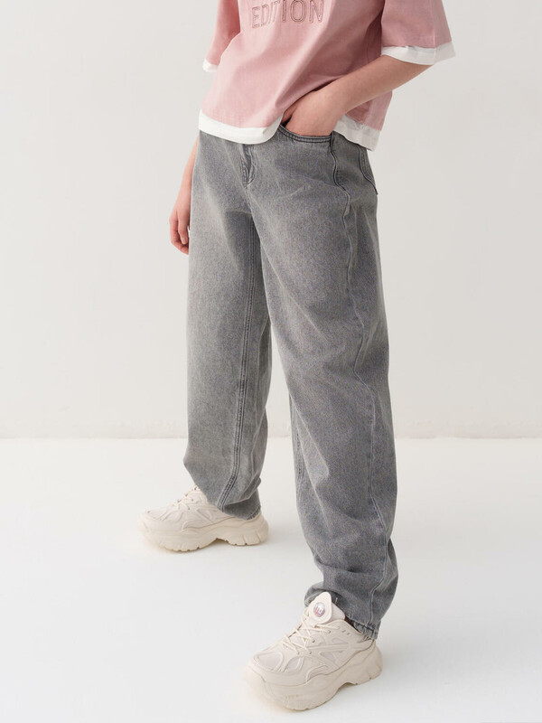 Джинсы багги для девочки подростка. Свободный крой baggy, выполнены из вареного серого денима. Спереди удобные боковые карманы, сзади — накладные. Застежка на молнию и болт. На поясе предусмотрена регулировка за счёт внутренней резинки с пуговицей. Украшены декоративным лейблом на спинке. Отличный вариант для повседневной носки в весенне-летний сезон.