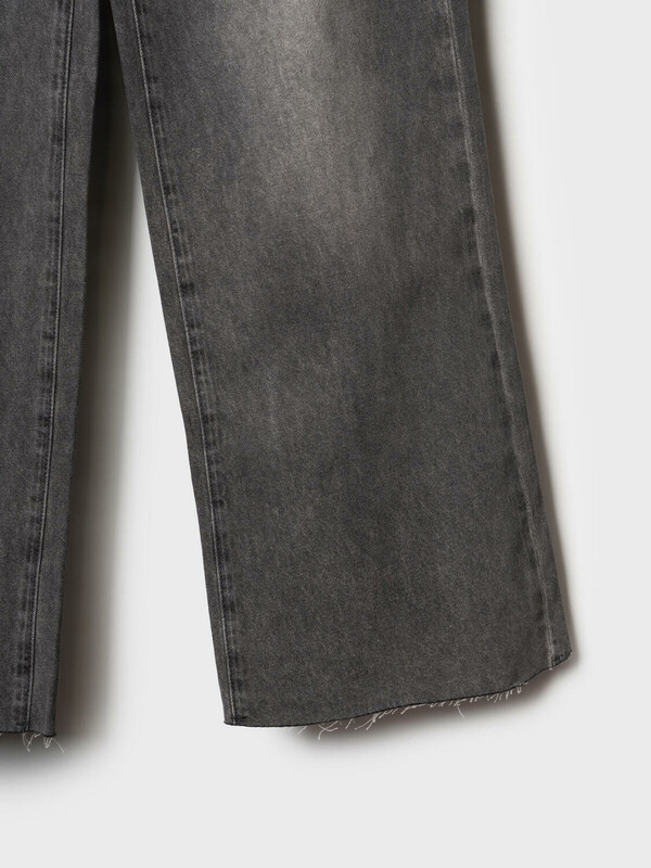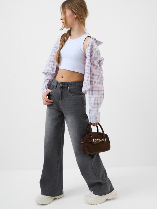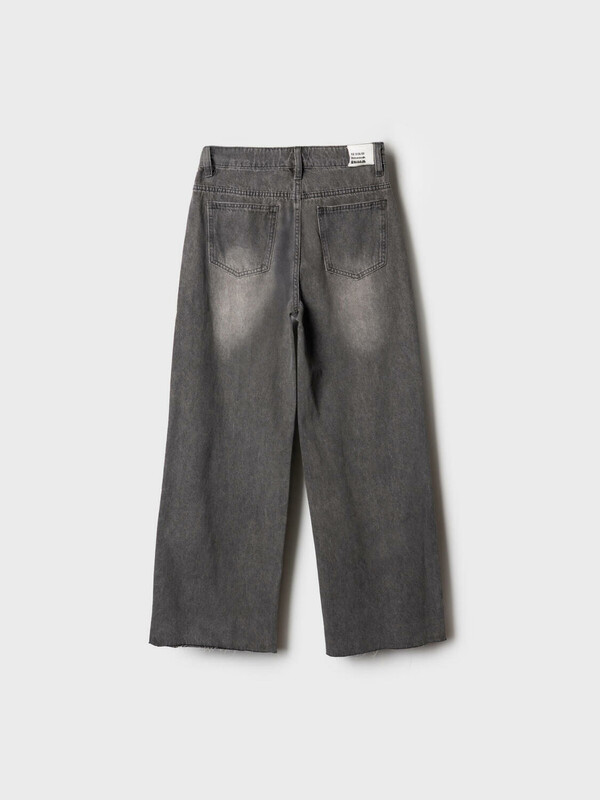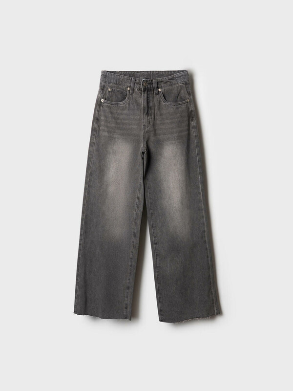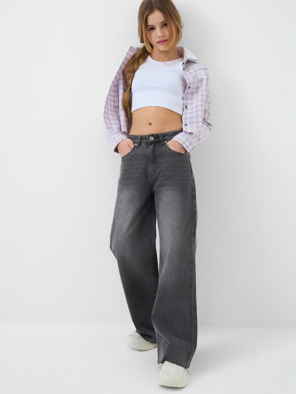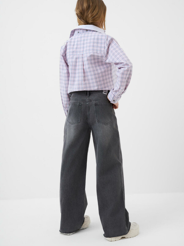 Джинсы широкие для девочки подростка. Спереди классическая застежка на молнию и болт. Модель wide leg свободного прямого кроя с высокой посадкой и длинными широкими штанинами. Есть пять карманов: два спереди, два сзади и один маленький внутренний. На заднем кармане — декоративная этикетка. Пояс с шлевками и регулировочной резинкой внутри. Низ брюк необработан, с модным бахромчатым краем. Отлично подойдут для повседневного гардероба в весенне-летний сезон.