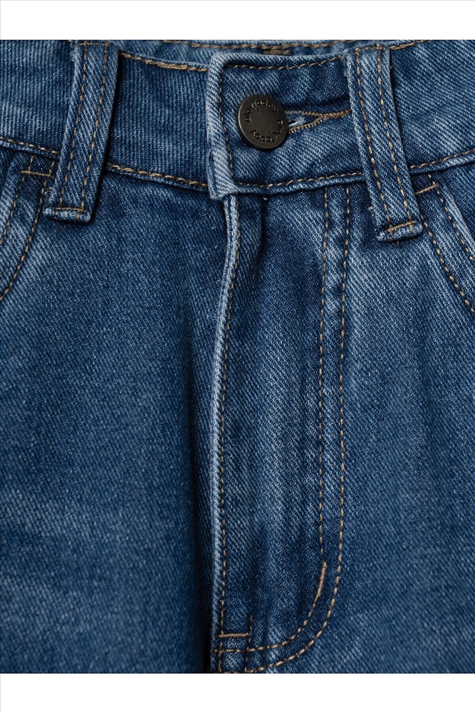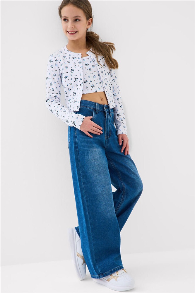 Джинсы свободные для девочки подростка. Модель с высокой посадкой и широкими прямыми штанинами. Застежка — молния и болт. Пояс частично на резинке сзади и регулируется изнутри с помощью пуговиц. Модель выполнена из синего денима. Есть передние и задние карманы.