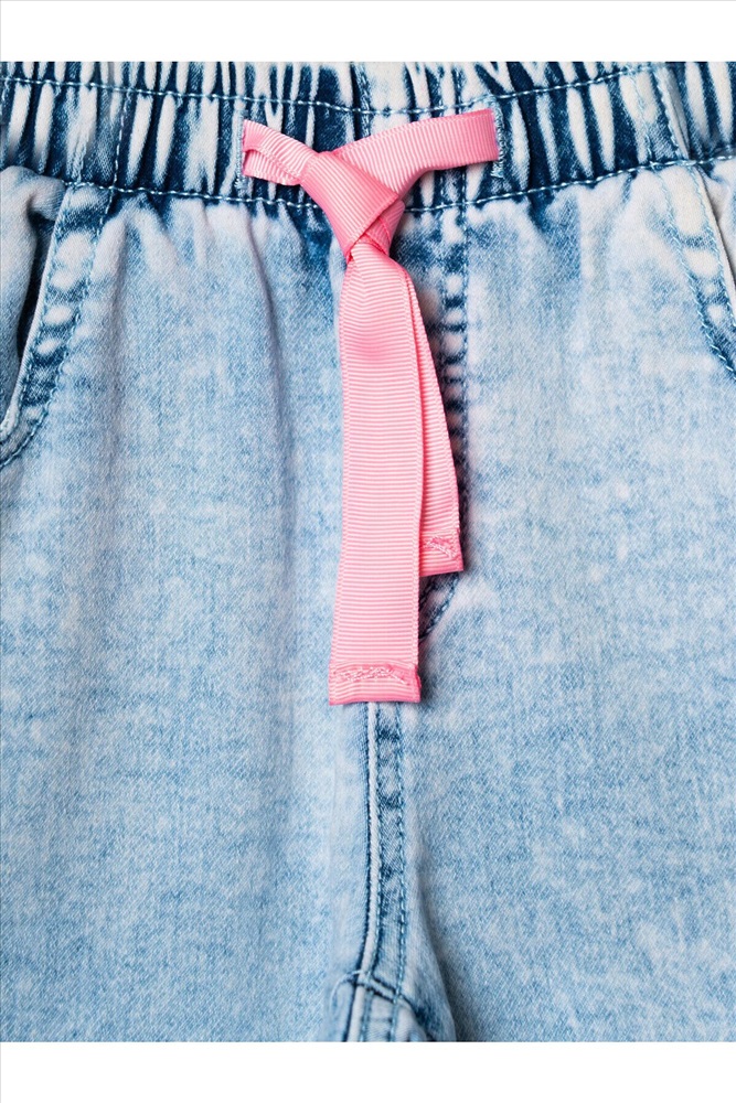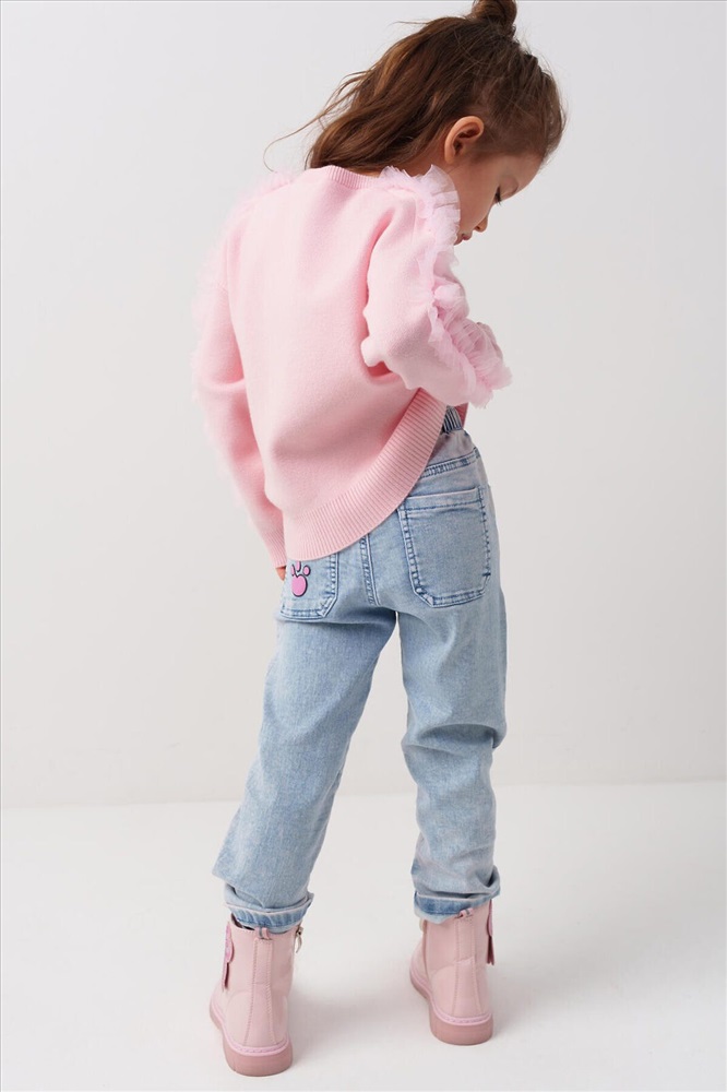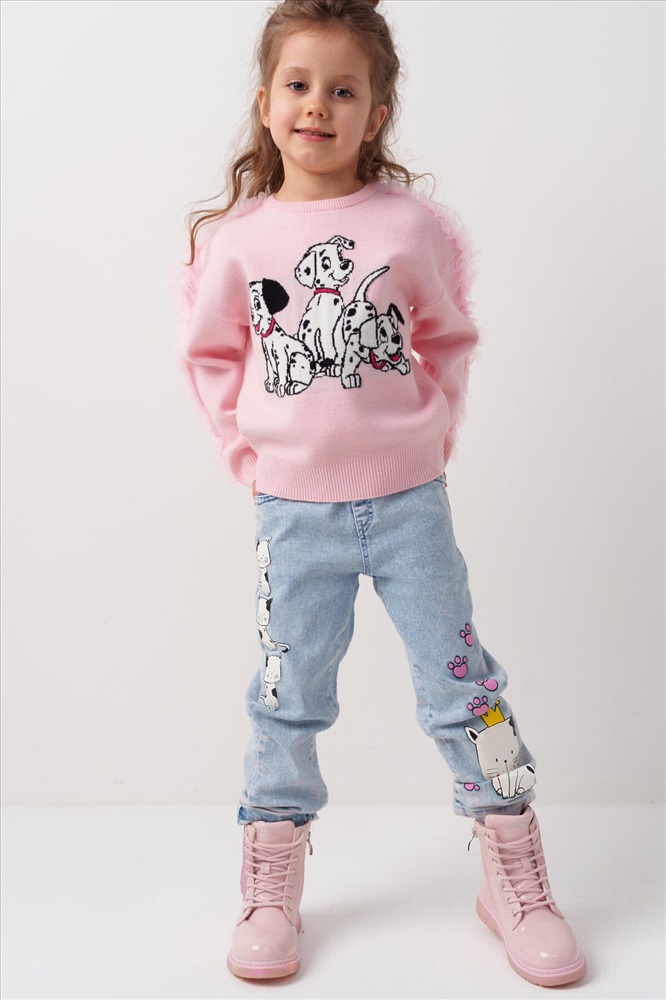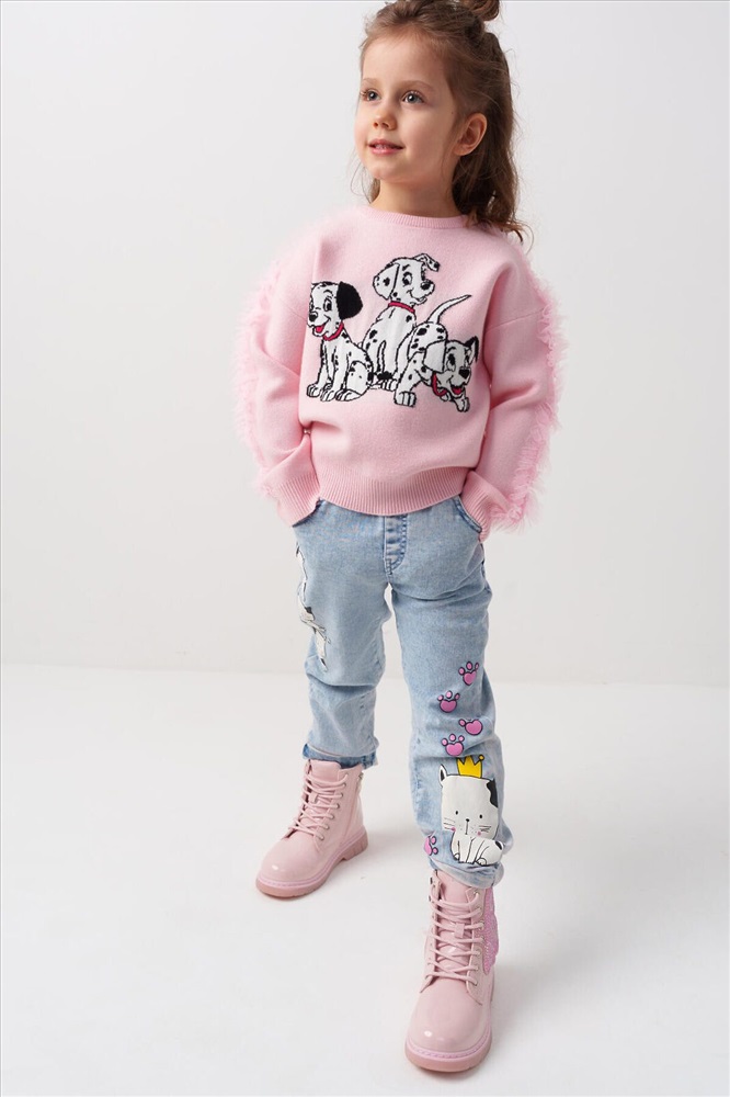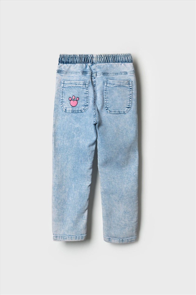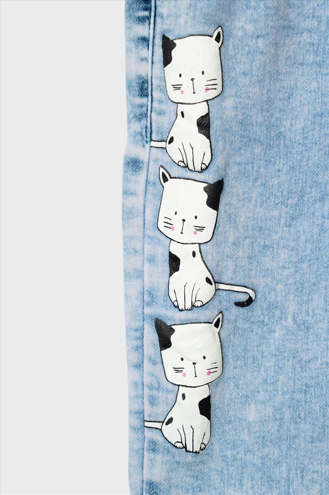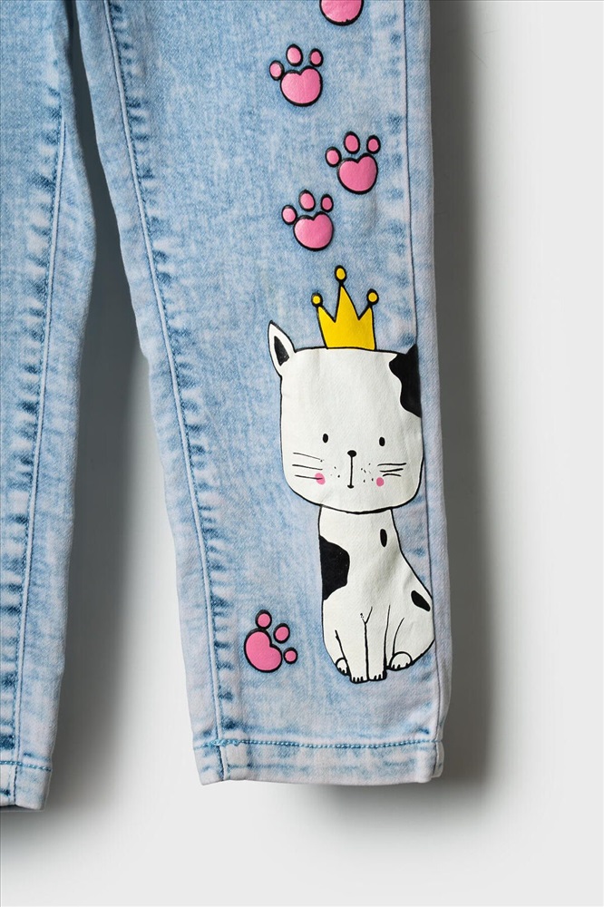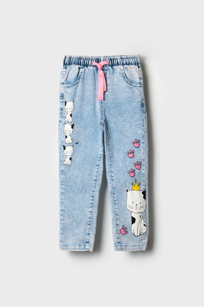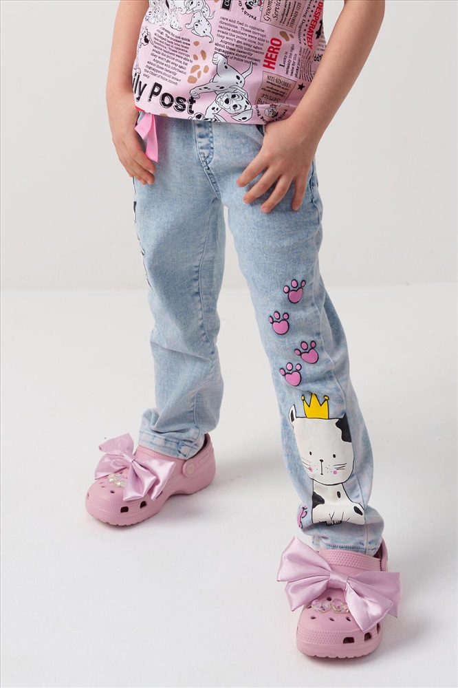 Стильные джинсы для девочки. Модель с зауженным кроем Slim fit и удобной средней посадкой. Пояс на резинке с розовой декоративной завязкой. Сзади — два кармана, один из которых украшен розовым принтом. На штанинах — яркий и милый принт с изображениями кошек и следами лапок. Вся отделка — в анималистичном стиле: пояс, карманы и низ брюк декорированы чёрно-белым принтом.